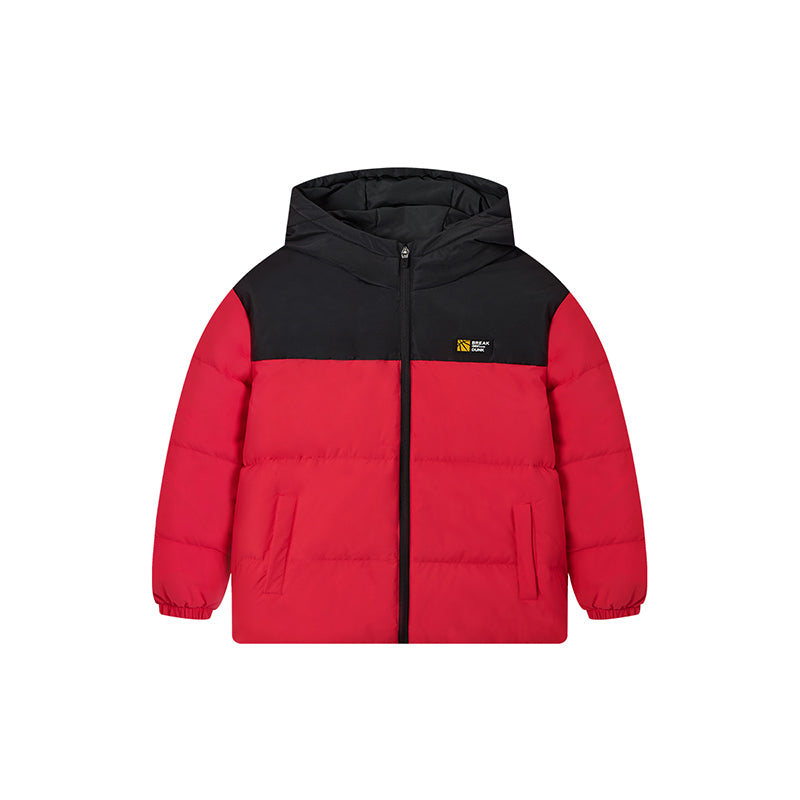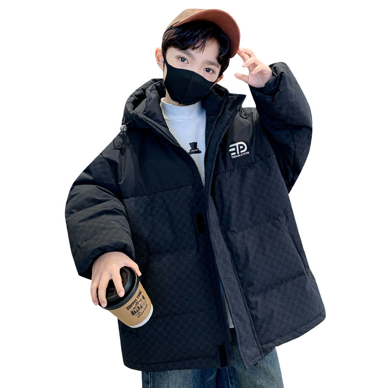 Детский пуховик с контрастными вставками и вышитыми буквами для мальчиков школьного возраста. Модель свободного кроя с утепленной подкладкой обеспечивает тепло,...