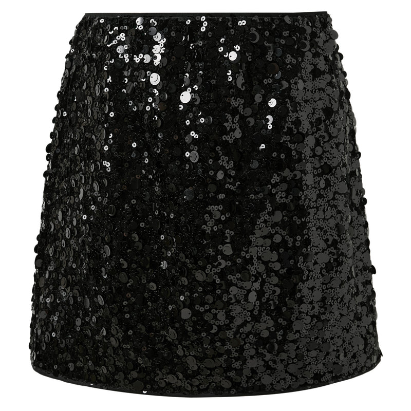 Короткая прямая юбка с высокой талией, украшенная блёстками. Тонкий крой и ретро-стиль создают элегантный и повседневный образ.