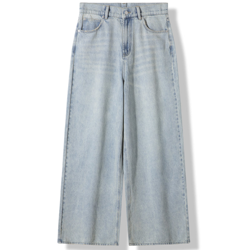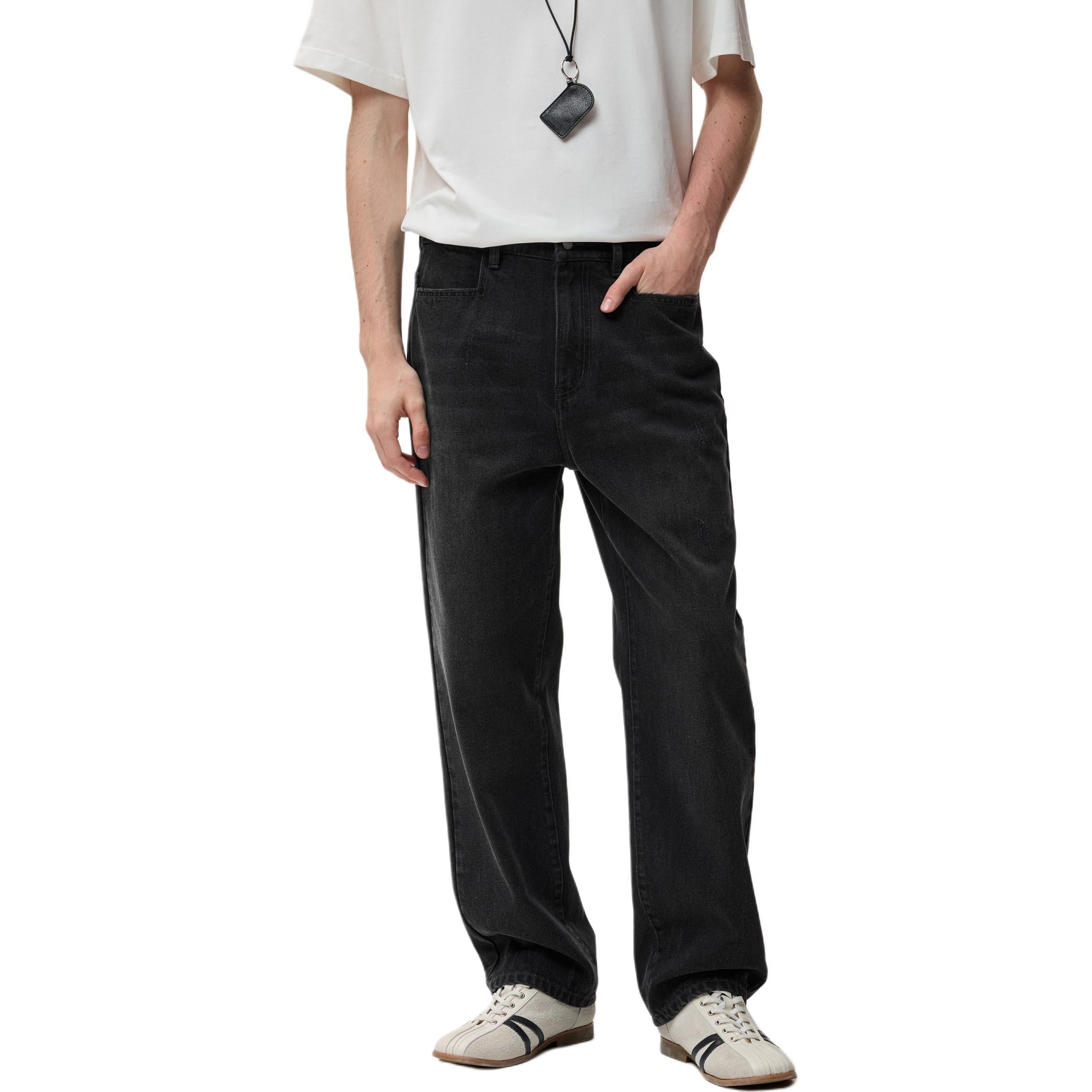 Джинсы свободного прямого кроя в стиле cleanfit с эффектом поношенности и расслабленной серо-голубой промывкой. Модель со средней посадкой и застежкой-молнией...