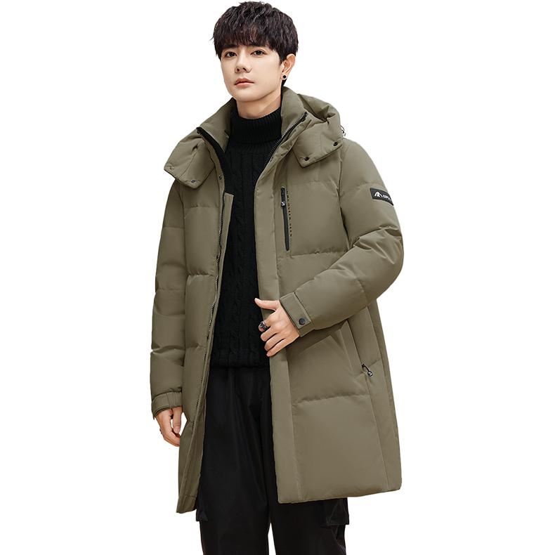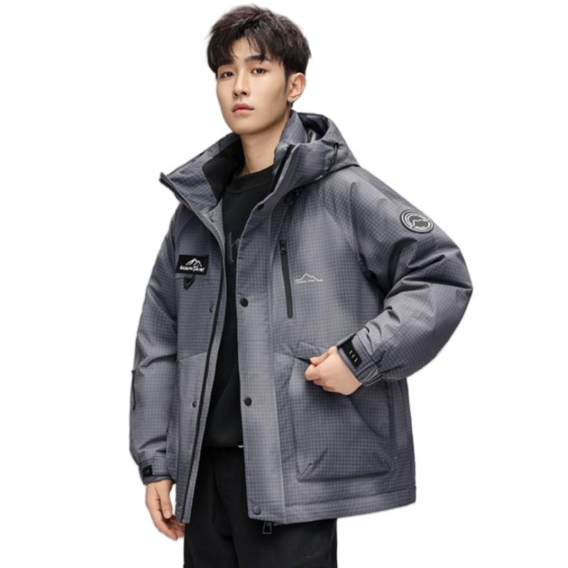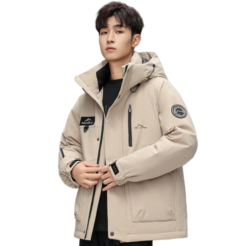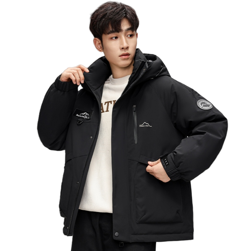Мужская короткая пуховая куртка с длинными рукавами и застежкой на молнию, выполнена в свободном крое с высоким воротником для защиты...