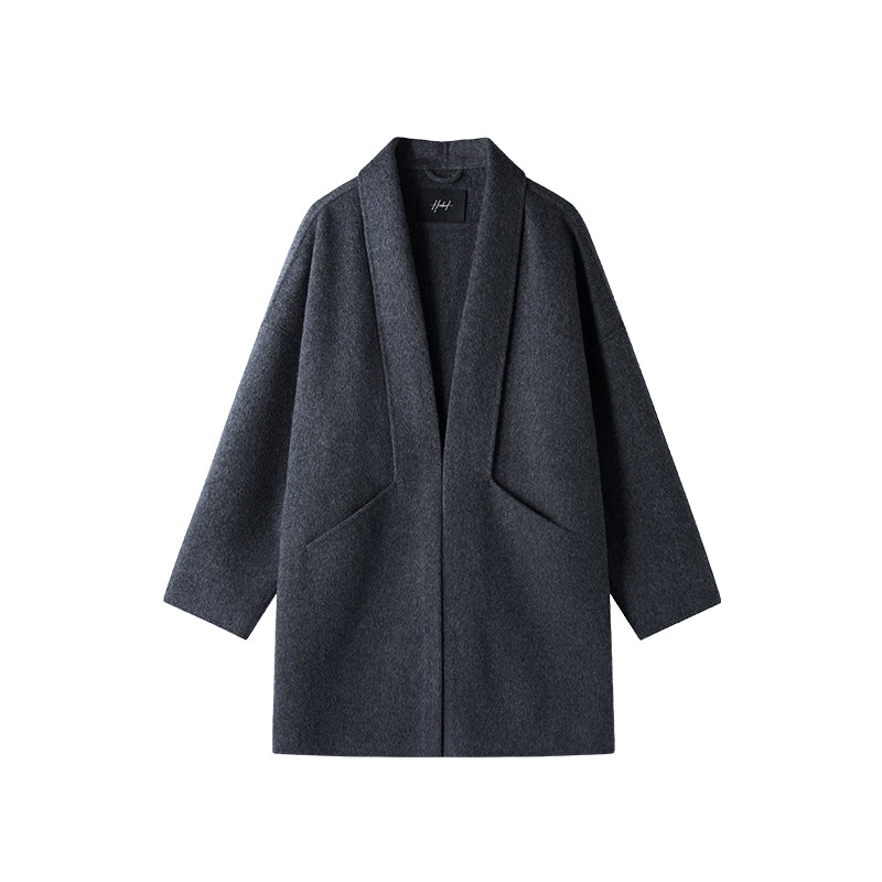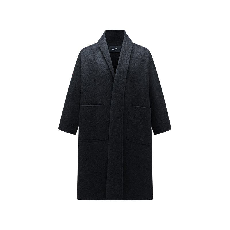 Мужское пальто средней длины с воротником-шарфом и длинными свободными рукавами, выполнено в стильном и комфортном дизайне для повседневной и деловой...