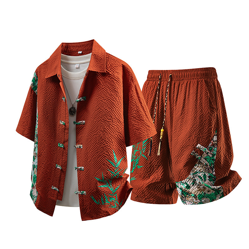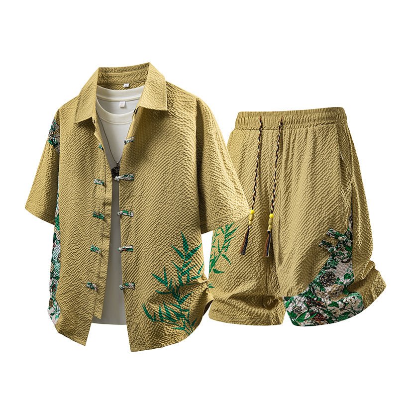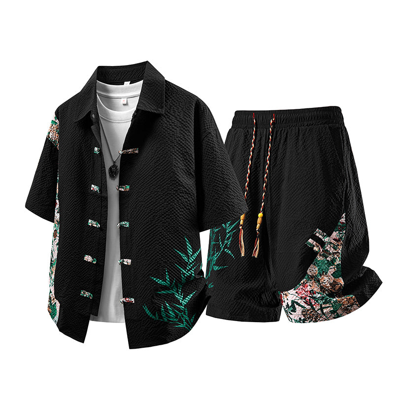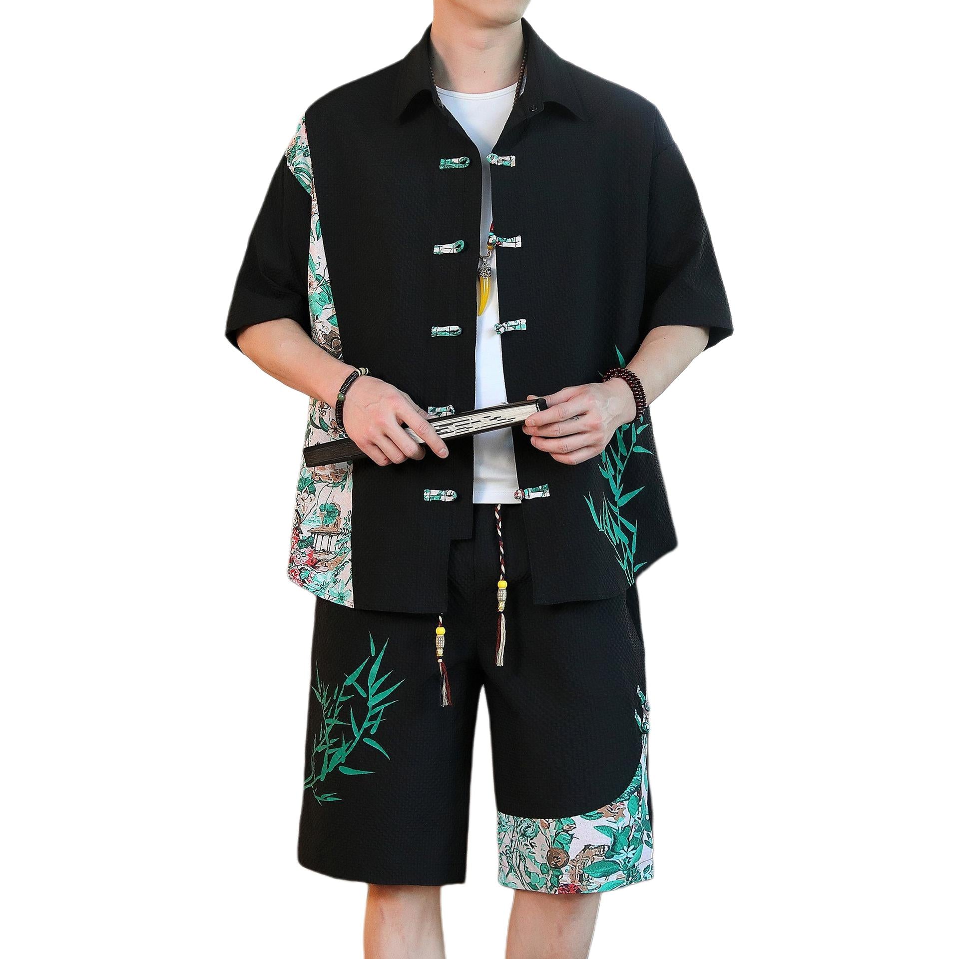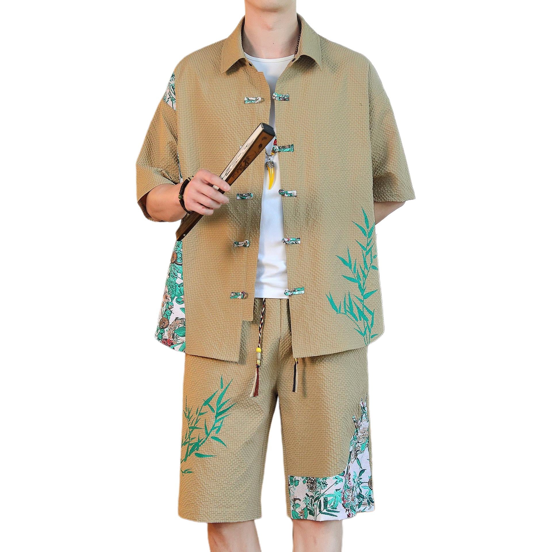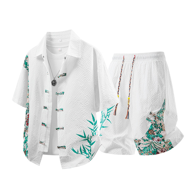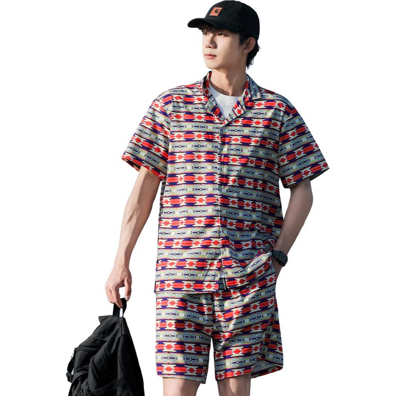 Мужской спортивный костюм с принтом, состоящий из рубашки с отложным воротником и шорт с завязками на талии. Идеален для летнего...