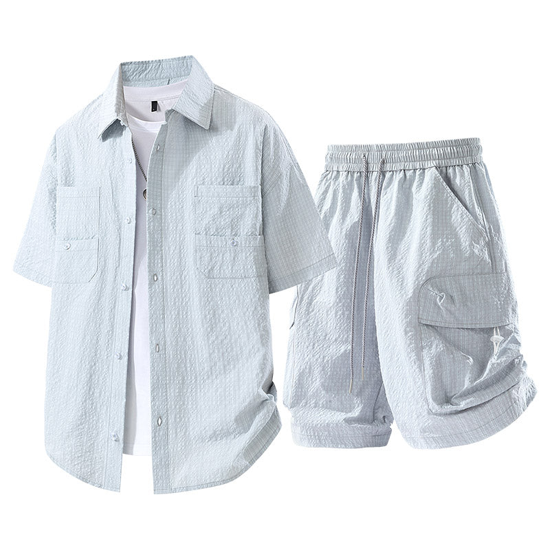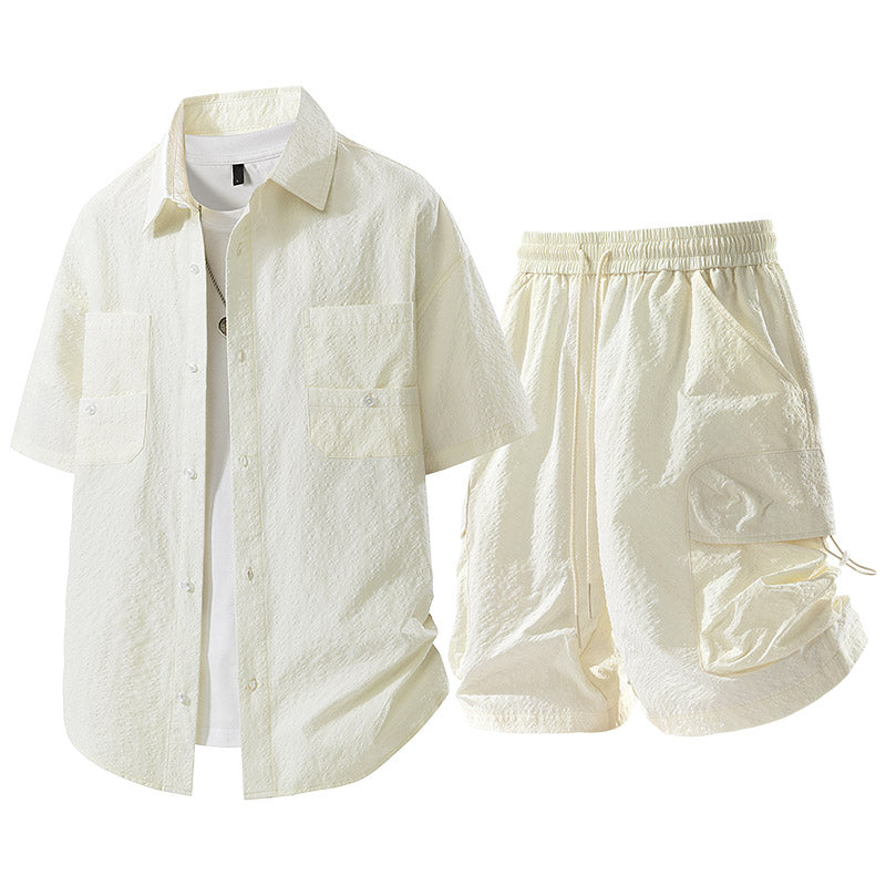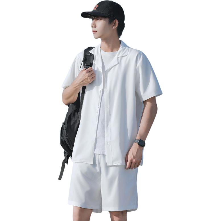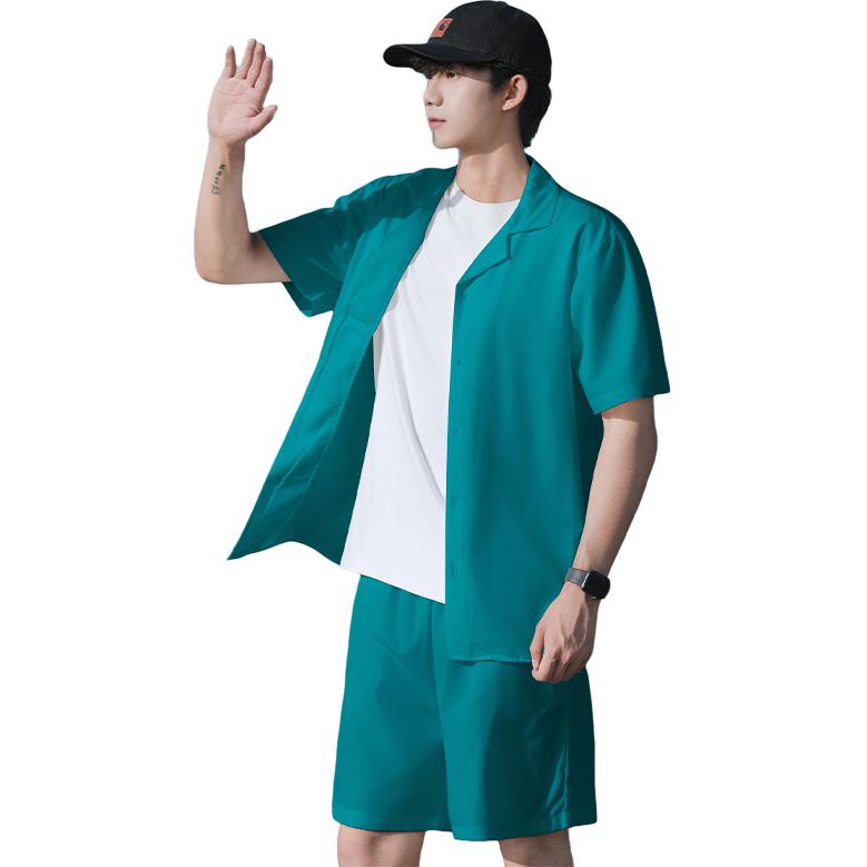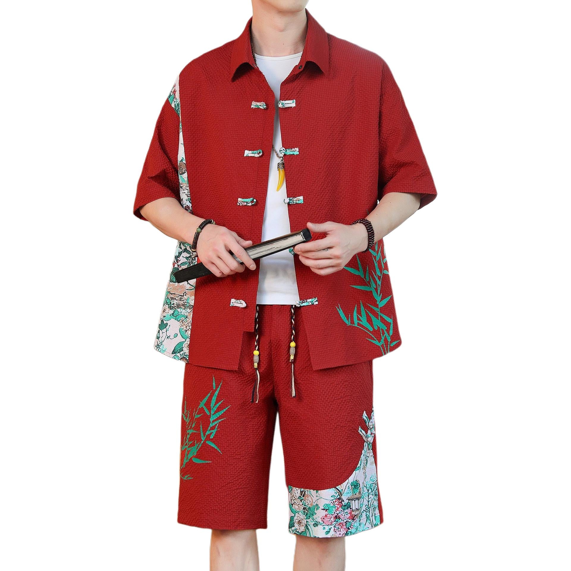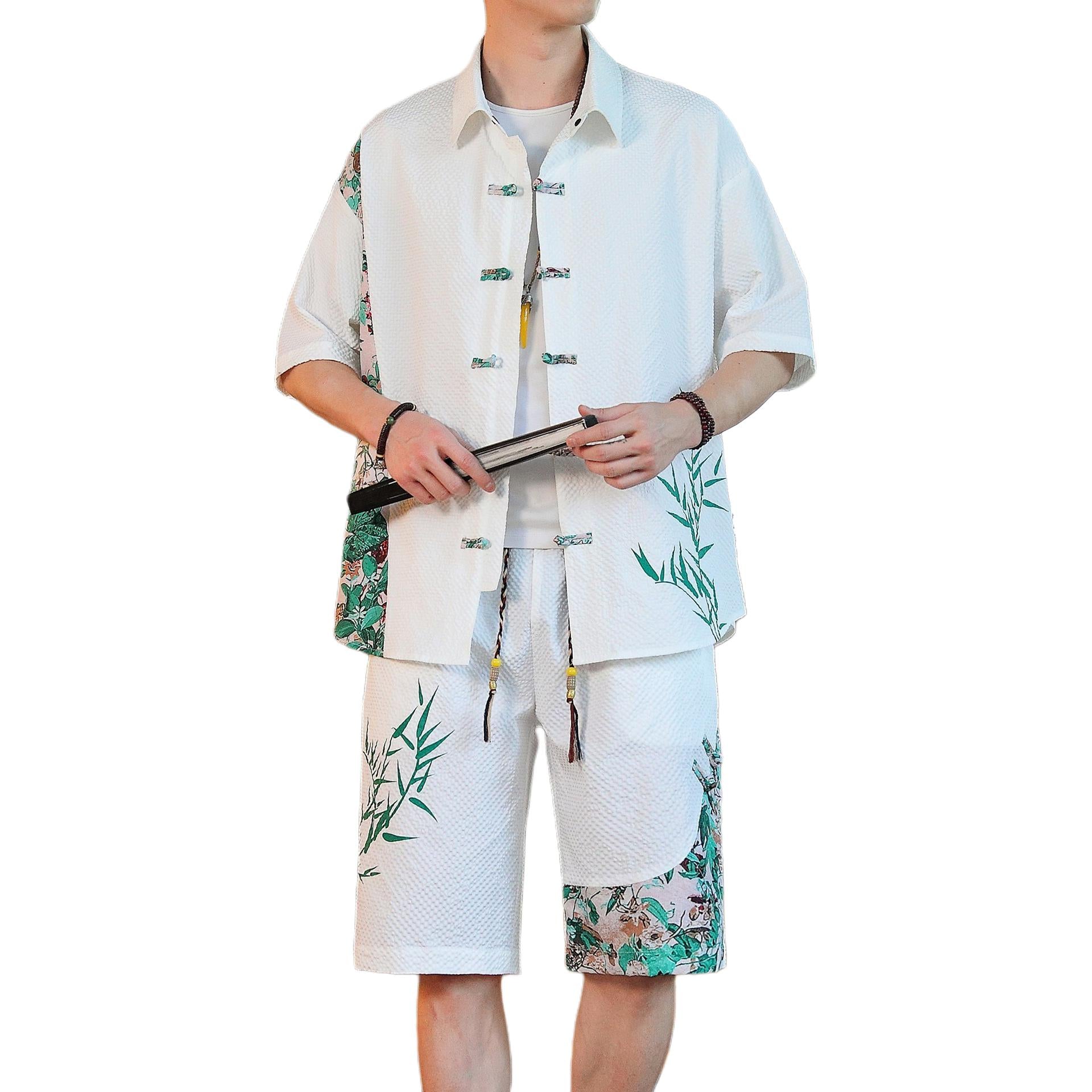 Мужской спортивный костюм с принтом, состоящий из рубашки с отложным воротником и шорт с завязками на талии. Идеален для летнего...