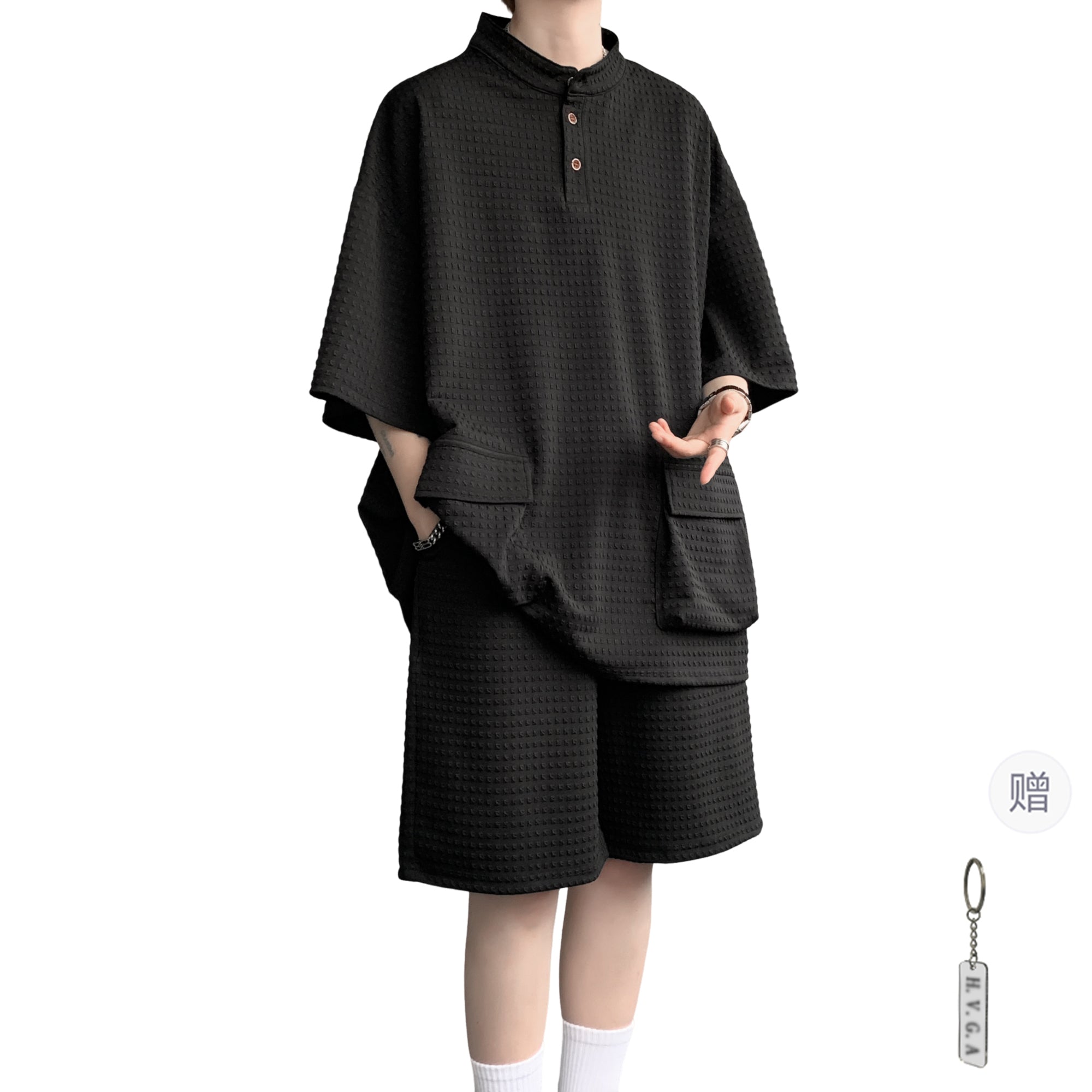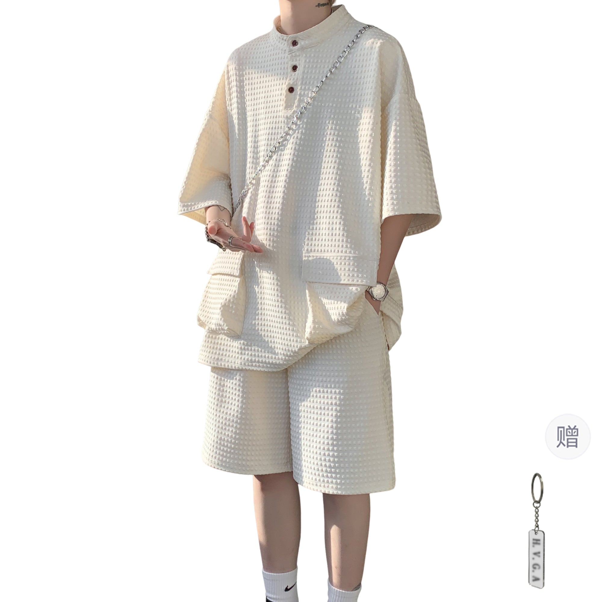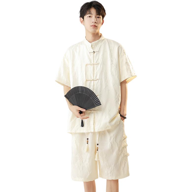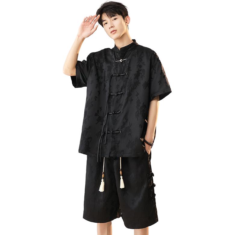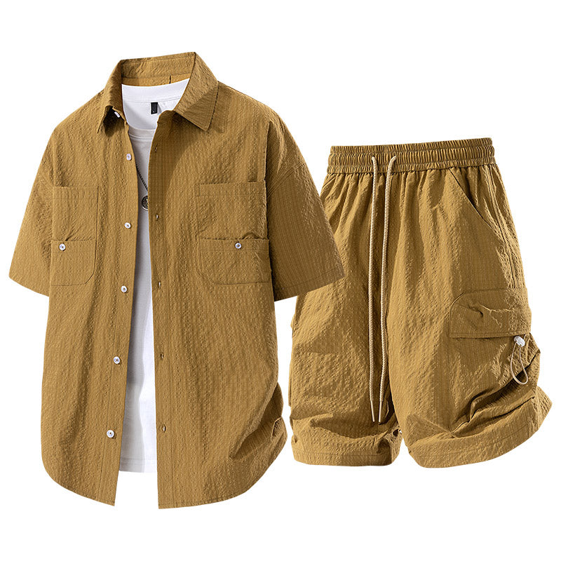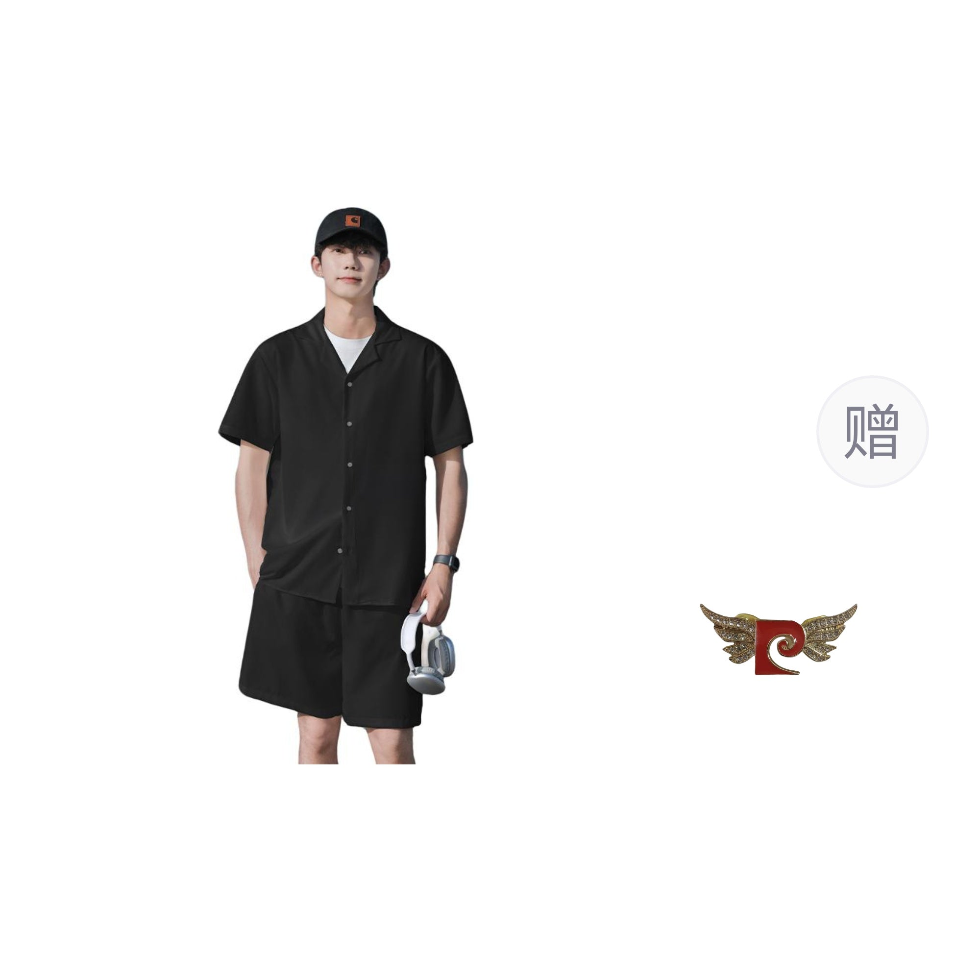 Мужской спортивный костюм с принтом, состоящий из рубашки с отложным воротником и шорт с завязками на талии. Идеален для летнего...