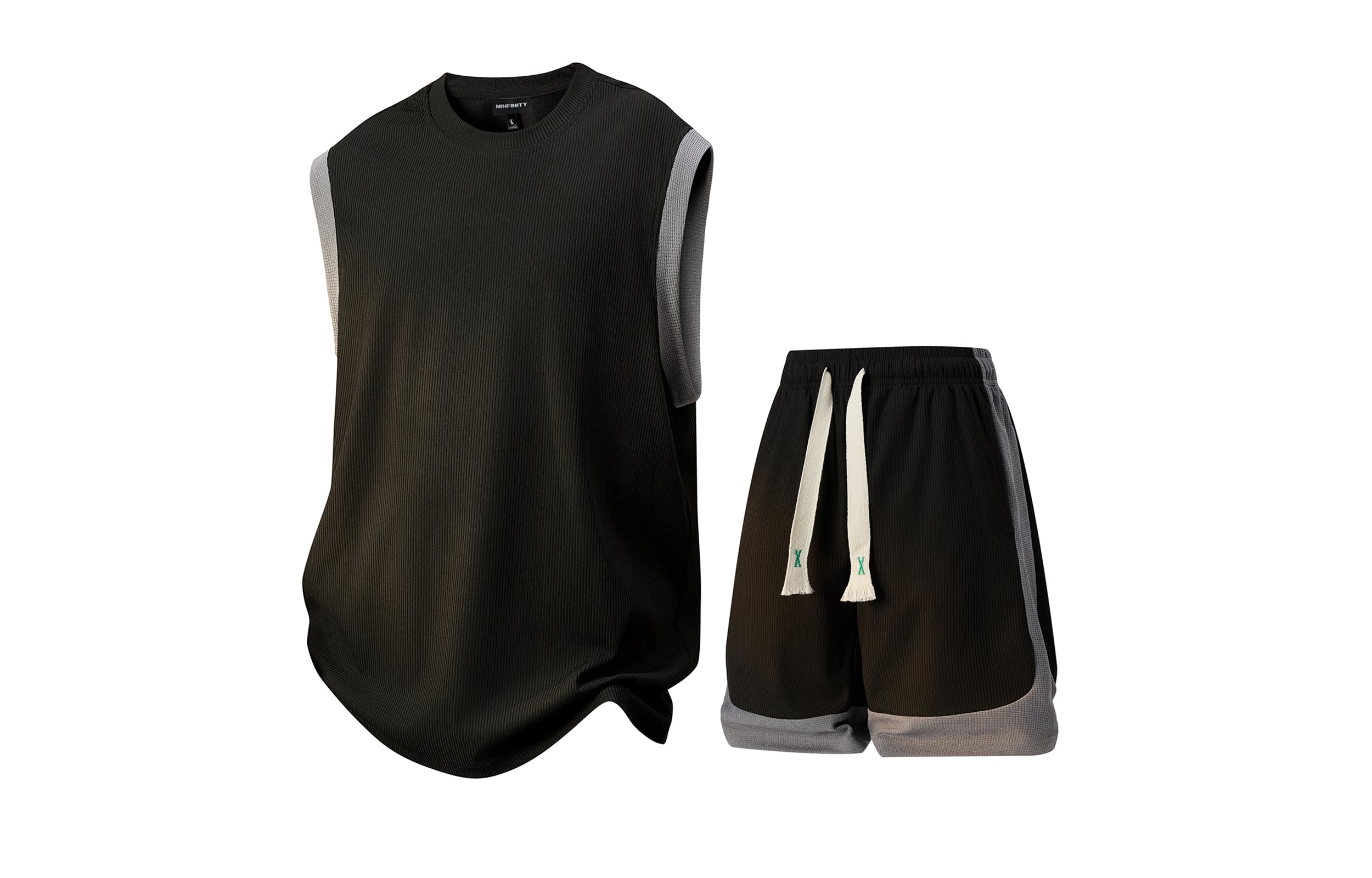 Лёгкий летний спортивный костюм Minfinity в стиле ретро‑спорт. В комплект входит майка без рукавов с круглым вырезом и свободным кроем,...