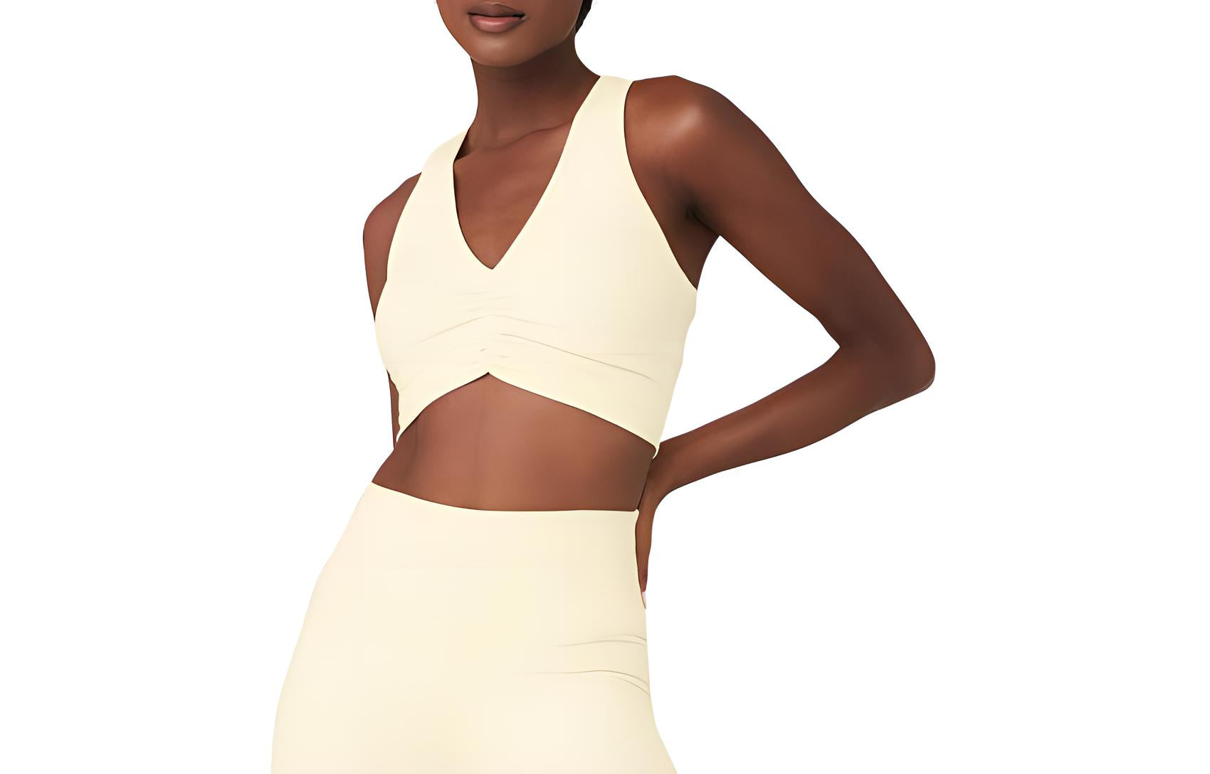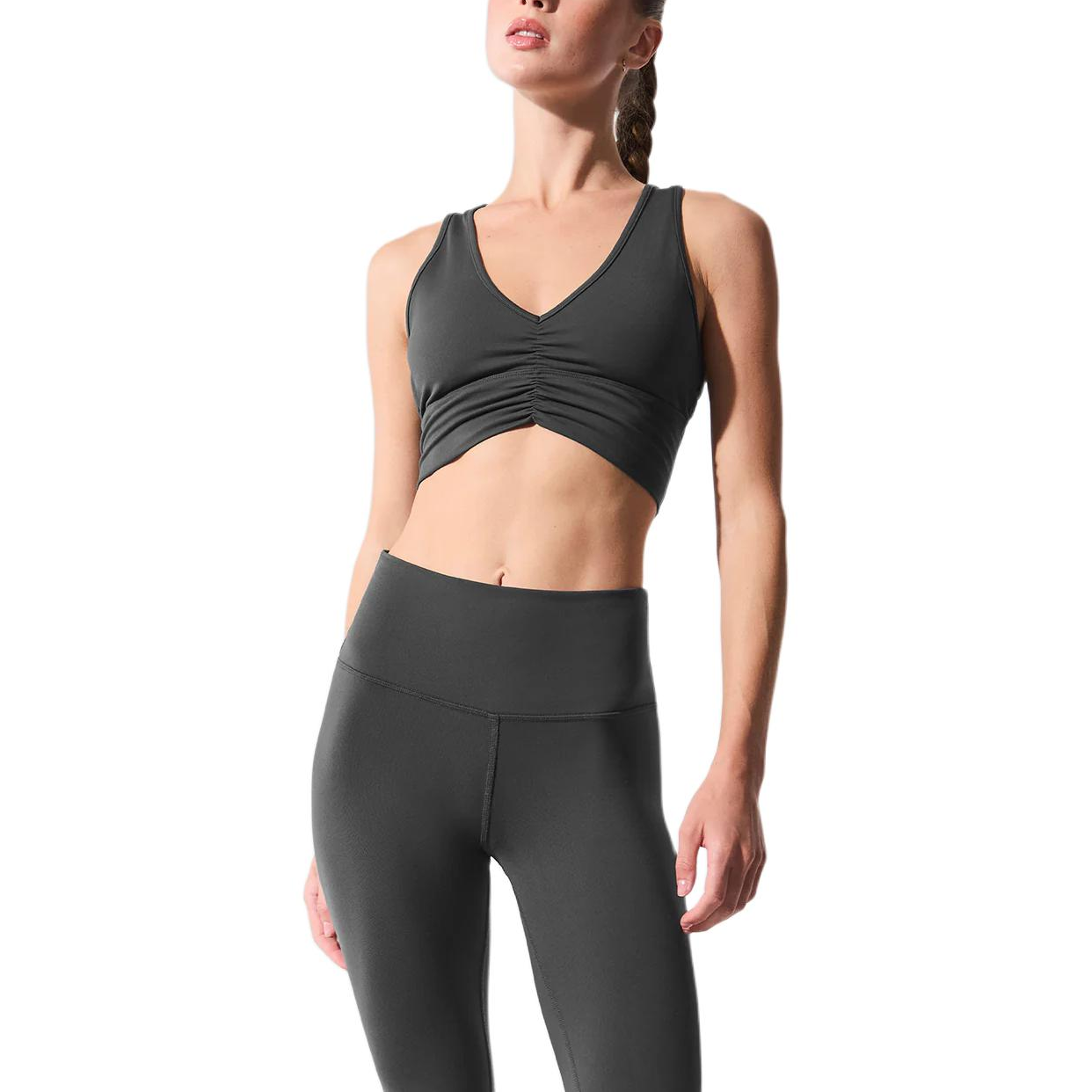 Облегающий спортивный бра с V-образным вырезом и легкой поддержкой, выполненный из дышащей и эластичной ткани для комфортных летних тренировок. Модель...