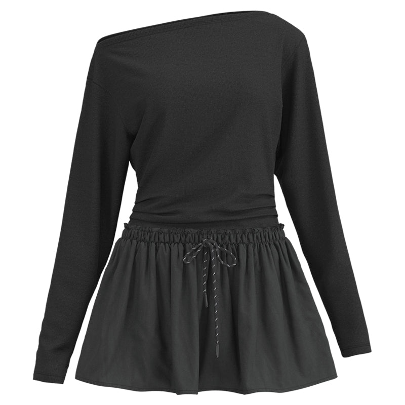 Элегантное платье с асимметричным вырезом и комбинированной отделкой, подчеркивающее фигуру. Модель с длинными рукавами и укороченным силуэтом создает стильный образ...