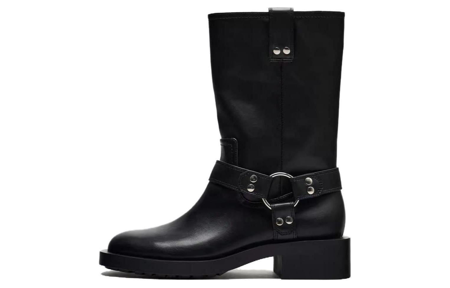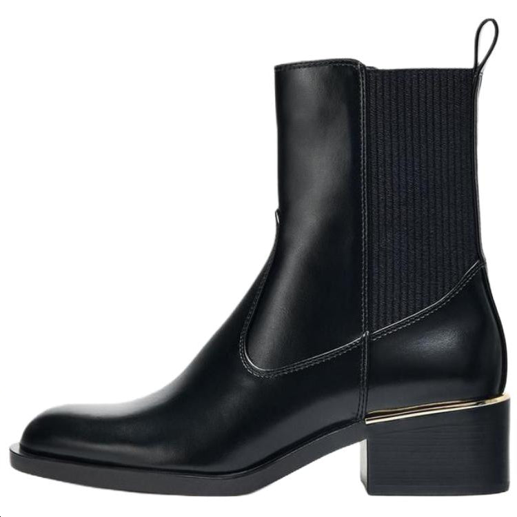 Удобные высокие ботинки‑сапоги без шнурков и застёжек (slip‑on), с низким каблуком ~3 см, выполненные из искусственной кожи (PU), в чёрном цвете....