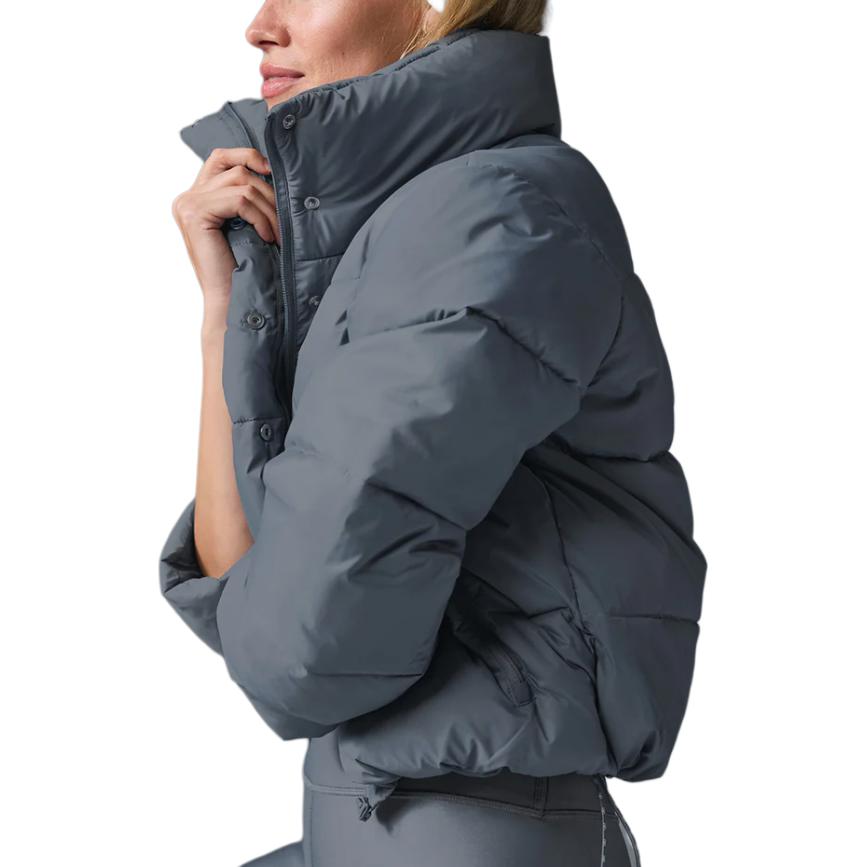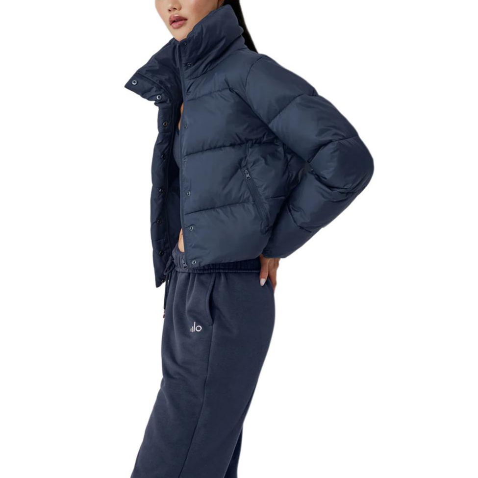 Женская пуховая пуховик с капюшоном, длинными рукавами и молнией, выполнена в однотонном дизайне с мягким и тёплым наполнителем для комфортной носки в холодное время года.