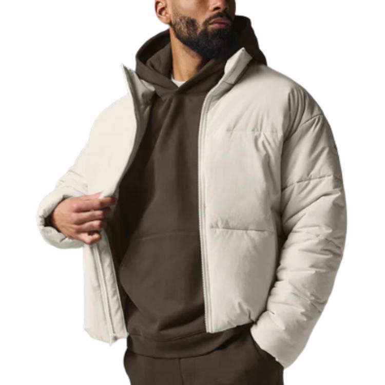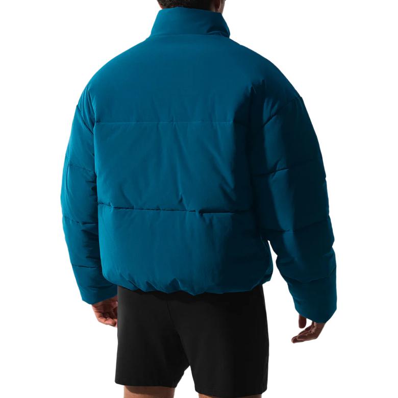 Мужская короткая пуховая куртка с длинными рукавами и застежкой на молнию, выполнена в свободном крое с высоким воротником для защиты от холода. Подходит для повседневной носки и активного отдыха.