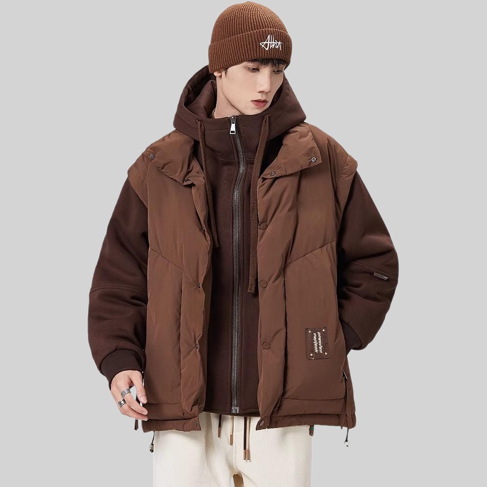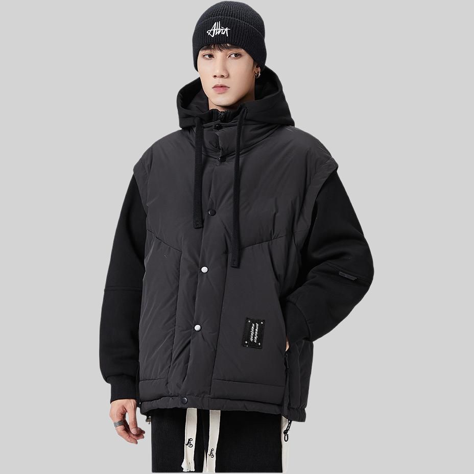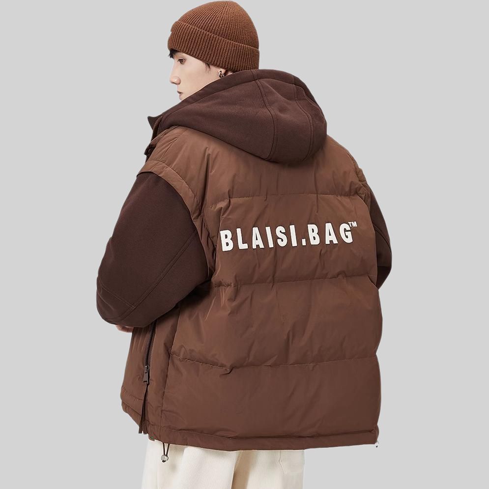Пуховик с эффектом двойного слоя на спине и контрастными вставками, наполненный утиным пухом. Модель свободного кроя с капюшоном объединяет комфорт, тепло и современный уличный дизайн.