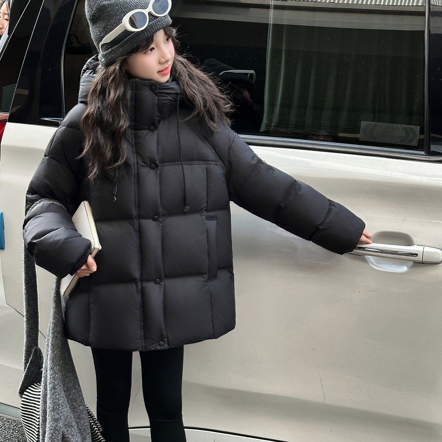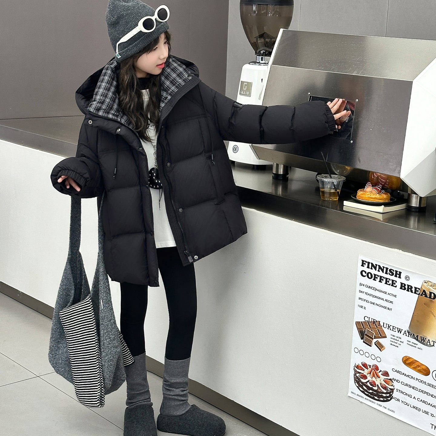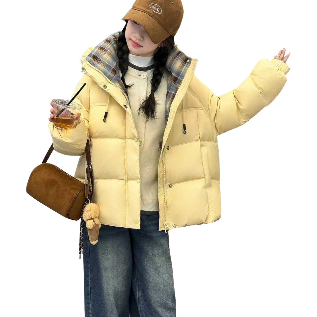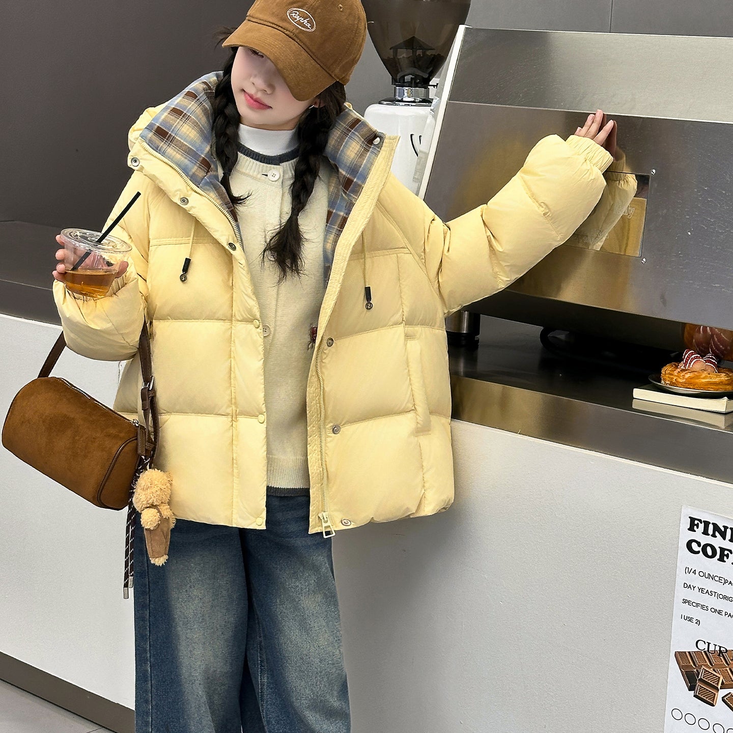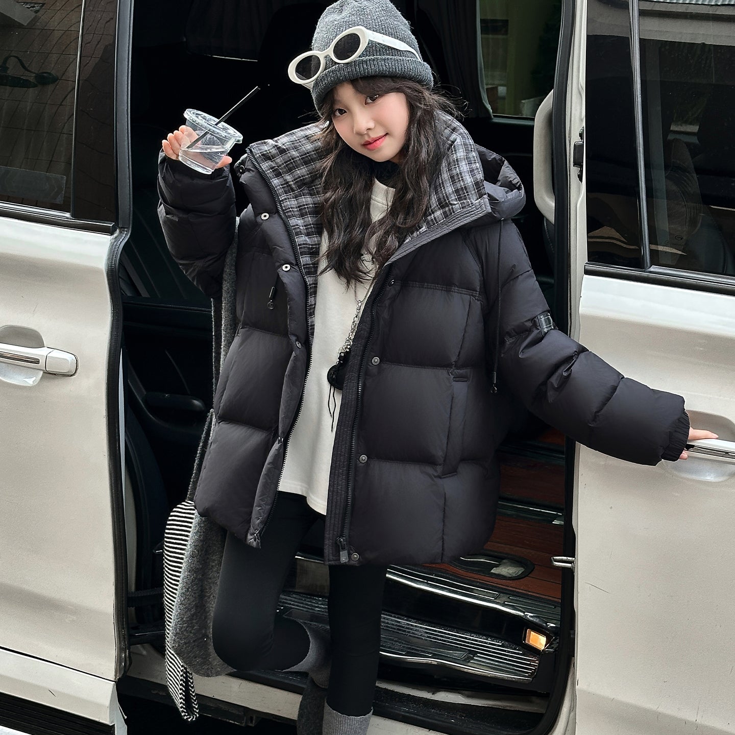 Тёплая детская куртка для девочек с капюшоном и застёжкой на молнию, выполненная с контрастными вставками и клетчатым узором. Утеплитель из хлопка и свободный крой обеспечивают комфорт и тепло в осенне-зимний сезон.