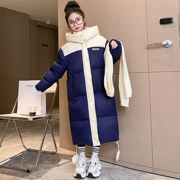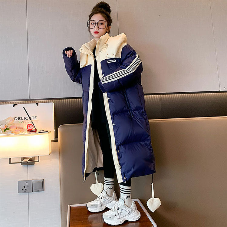Длинный пуховик с капюшоном ниже колен и контрастными вставками, наполненный утиным пухом высокой очистки. Модель свободного кроя из нейлона и полиэстера обеспечивает максимальное тепло и комфорт для холодной погоды.