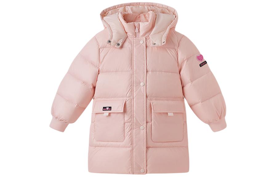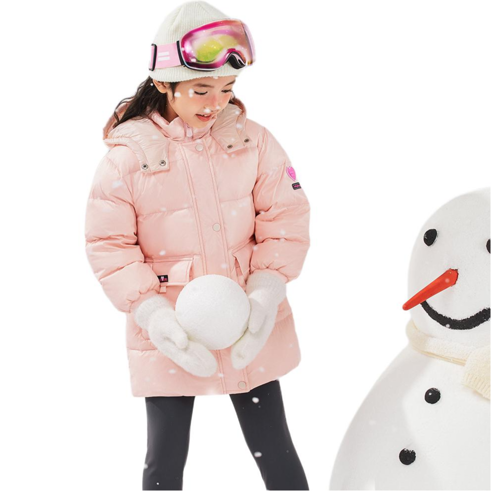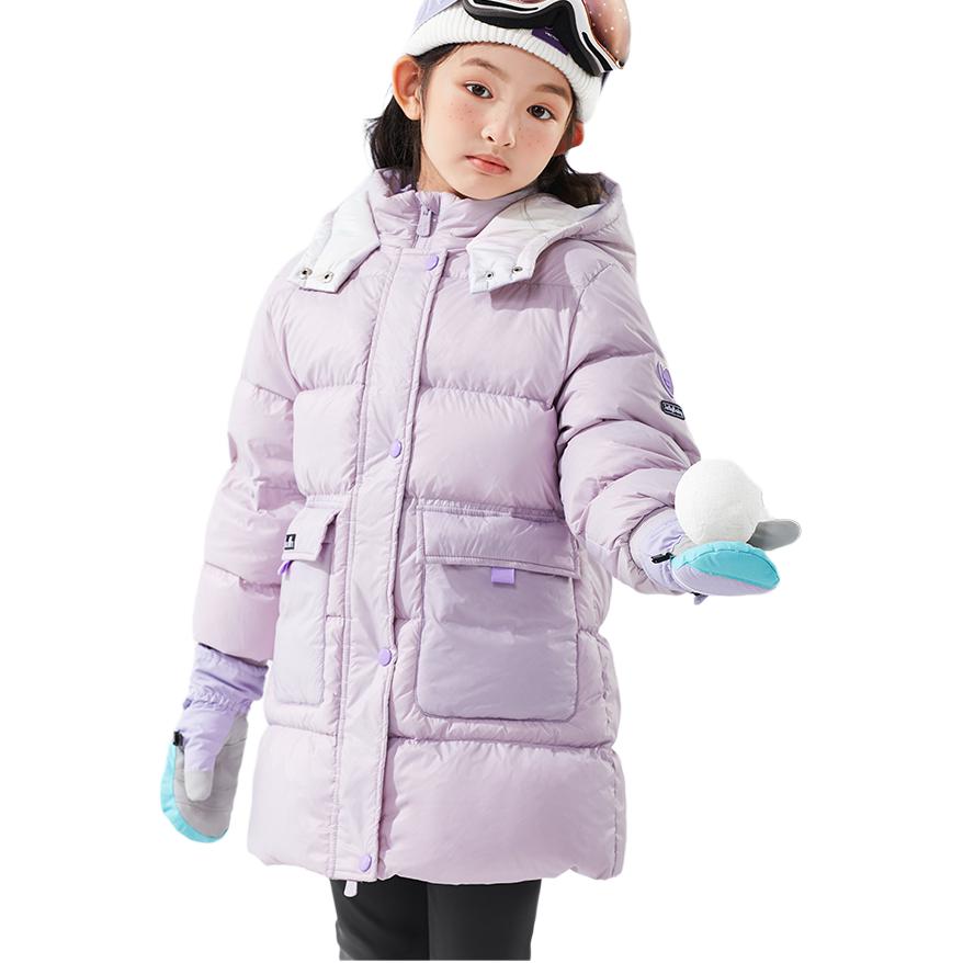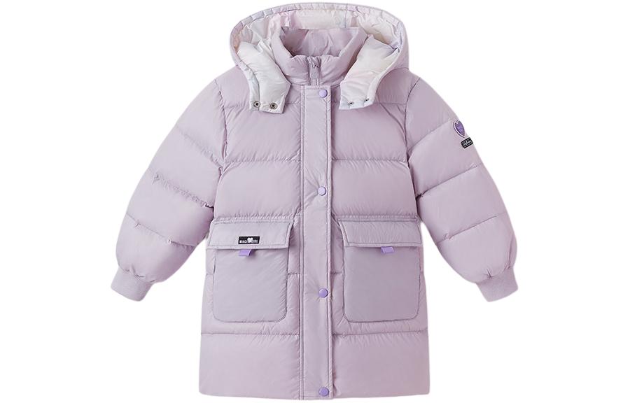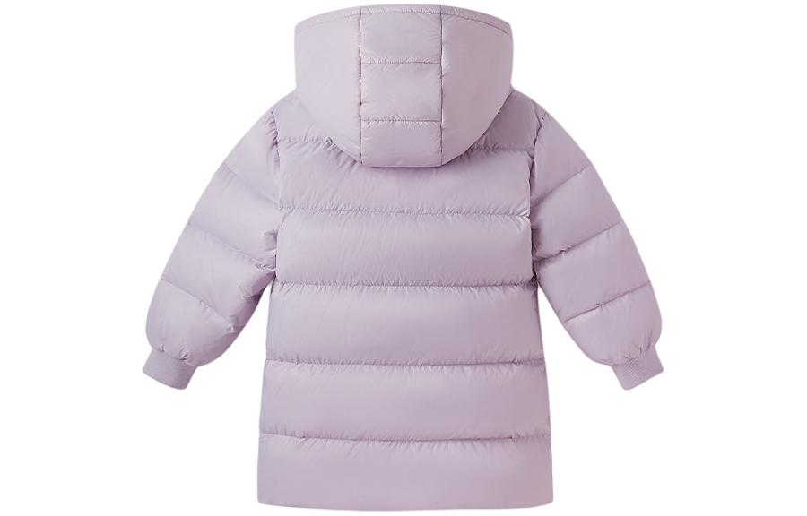Длинный детский пуховик с капюшоном и застёжкой на молнию, однотонного цвета с тройной защитой от пуха. Обеспечивает тепло и комфорт для детей младшего и среднего возраста.