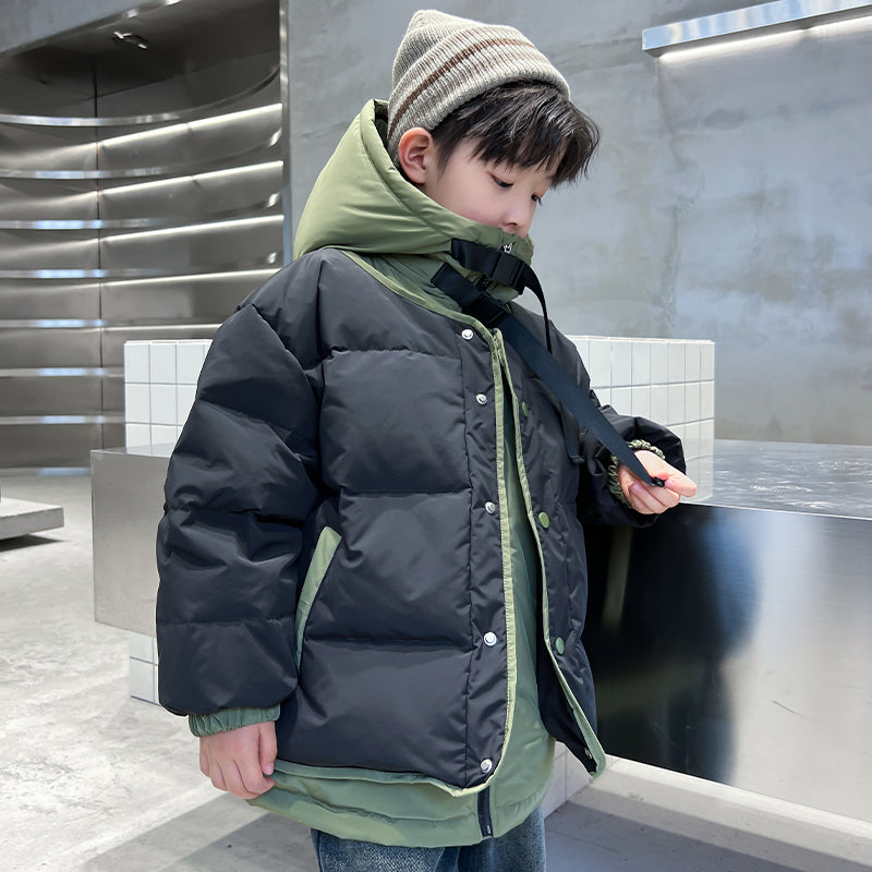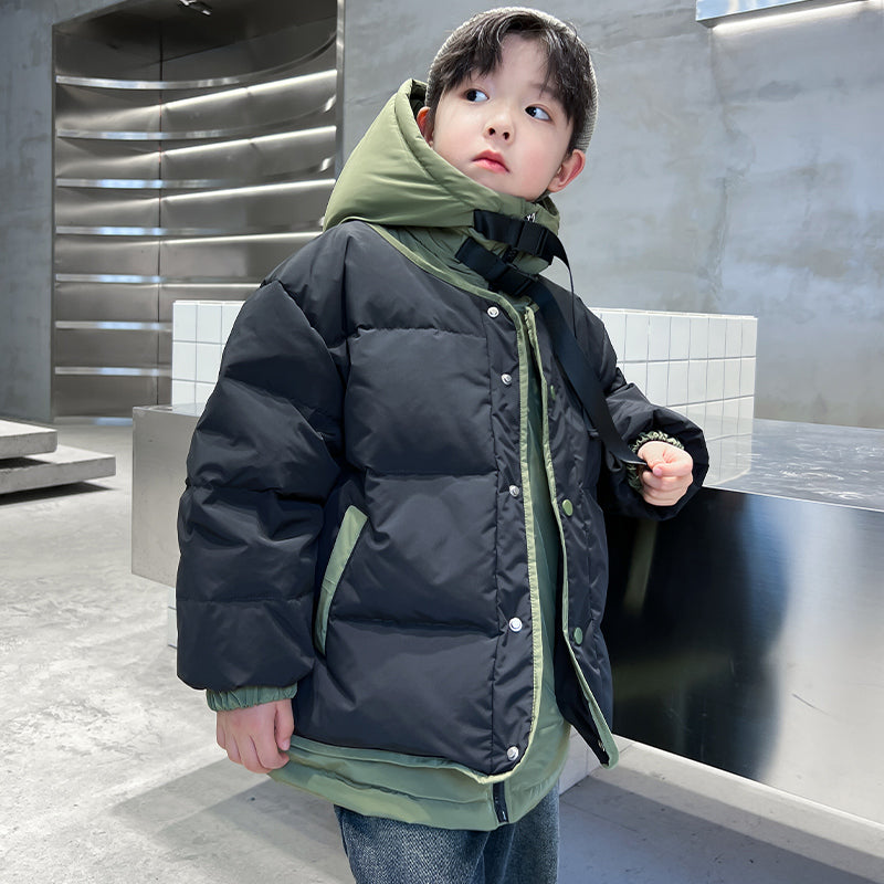 Детский пуховик с капюшоном, обеспечивающий легкость, мягкость и тепло. Модель свободного кроя из полиэстера наполнена белым утиным пухом для комфортной повседневной носки.