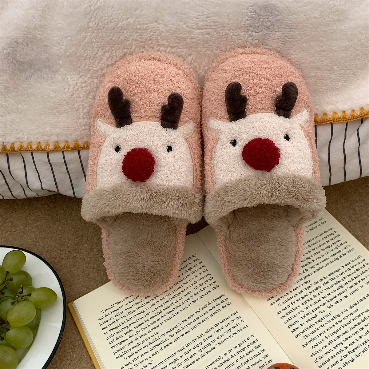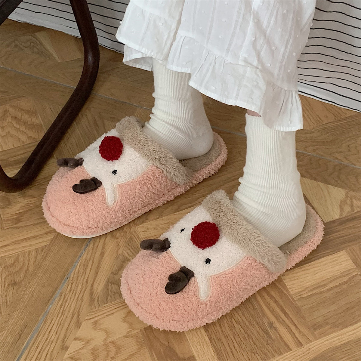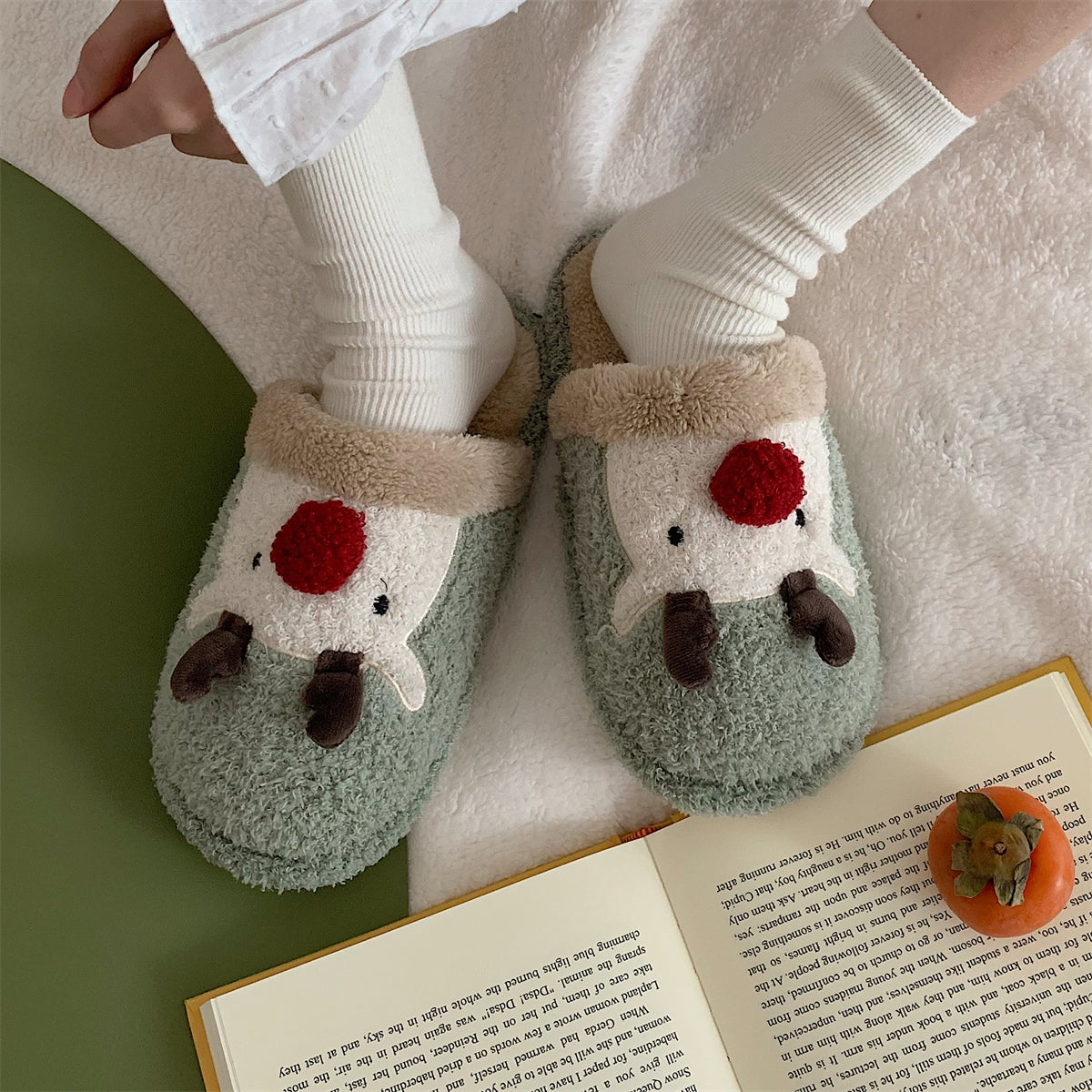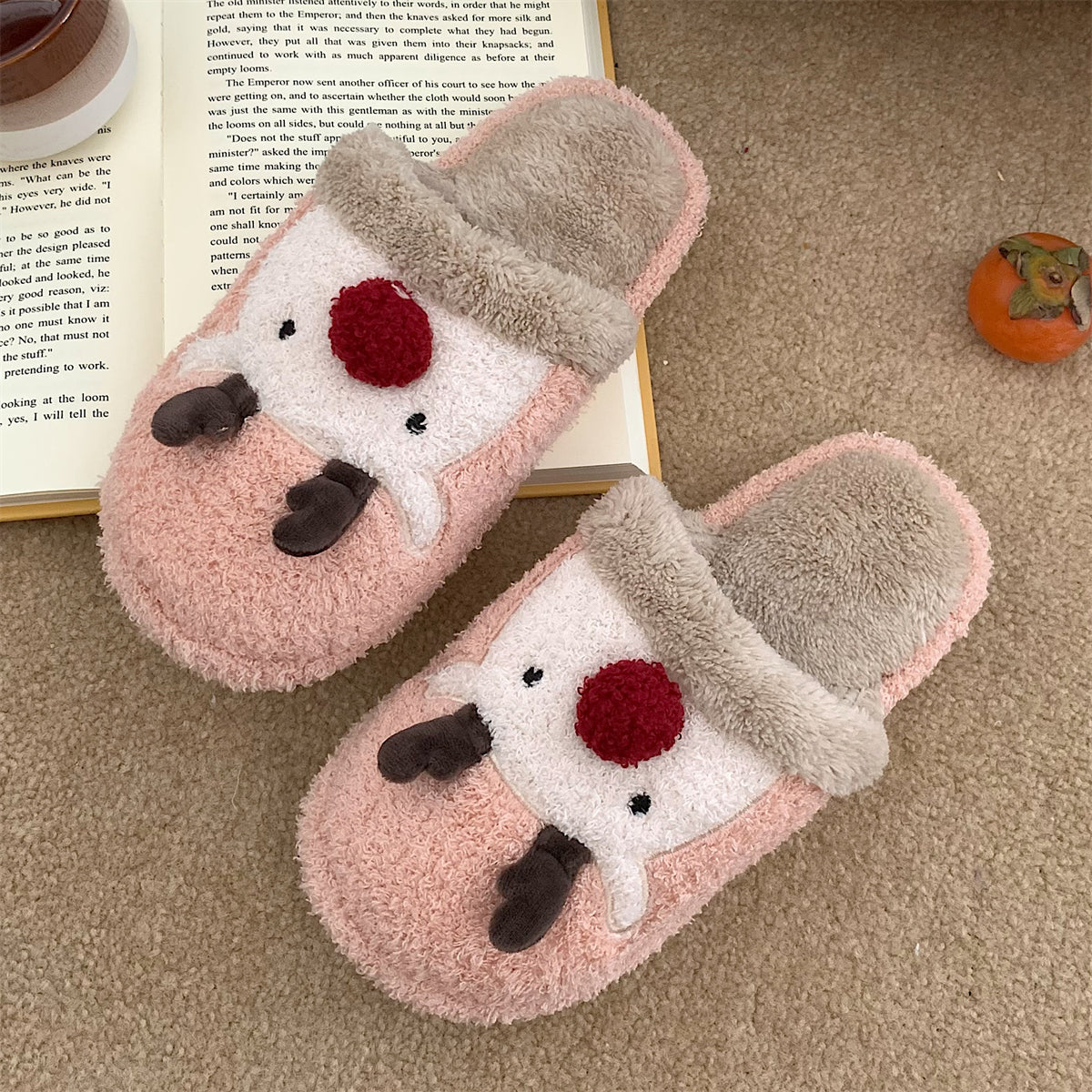 Мягкие домашние тапочки с плюшевым верхом и рождественским дизайном, обеспечивающие тепло и комфорт. Плоская подошва из пластика с антискользящей структурой, подходит для взрослых и детей. Модель с закрытым носком, мультяшный стиль и декоративная швейная нить.