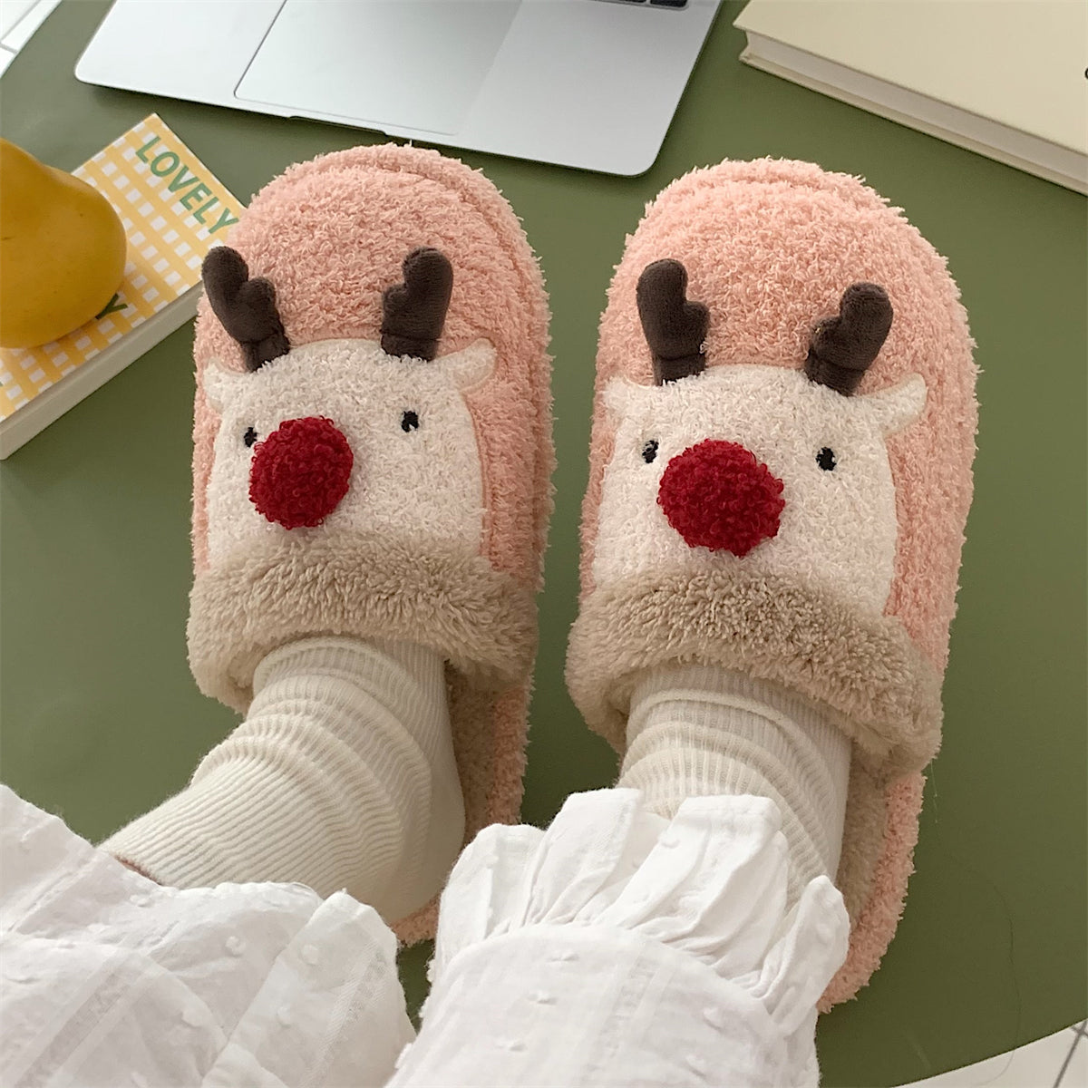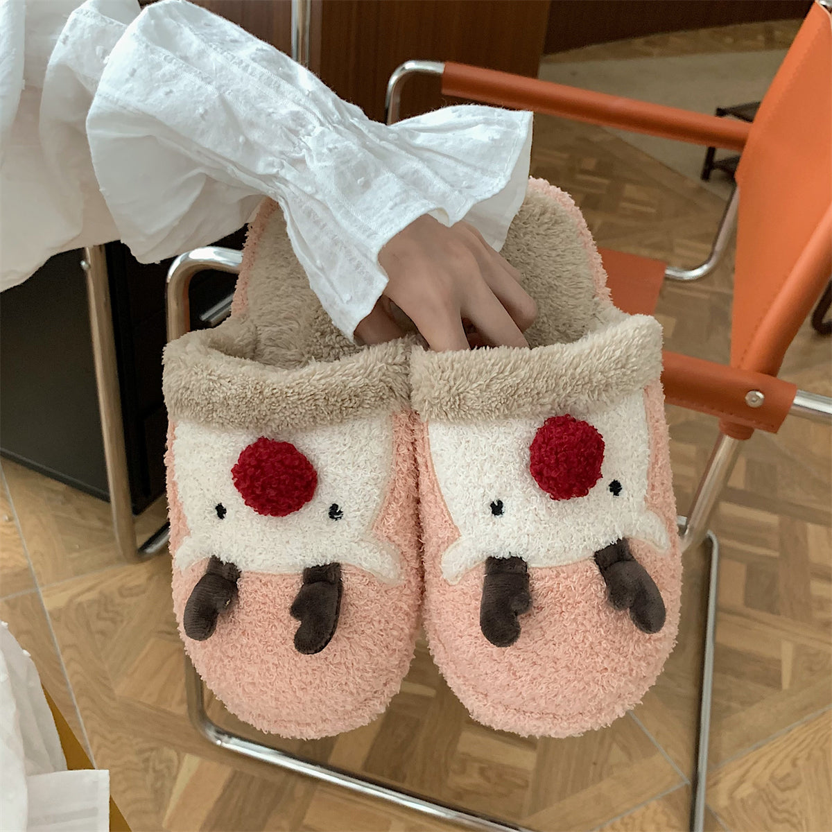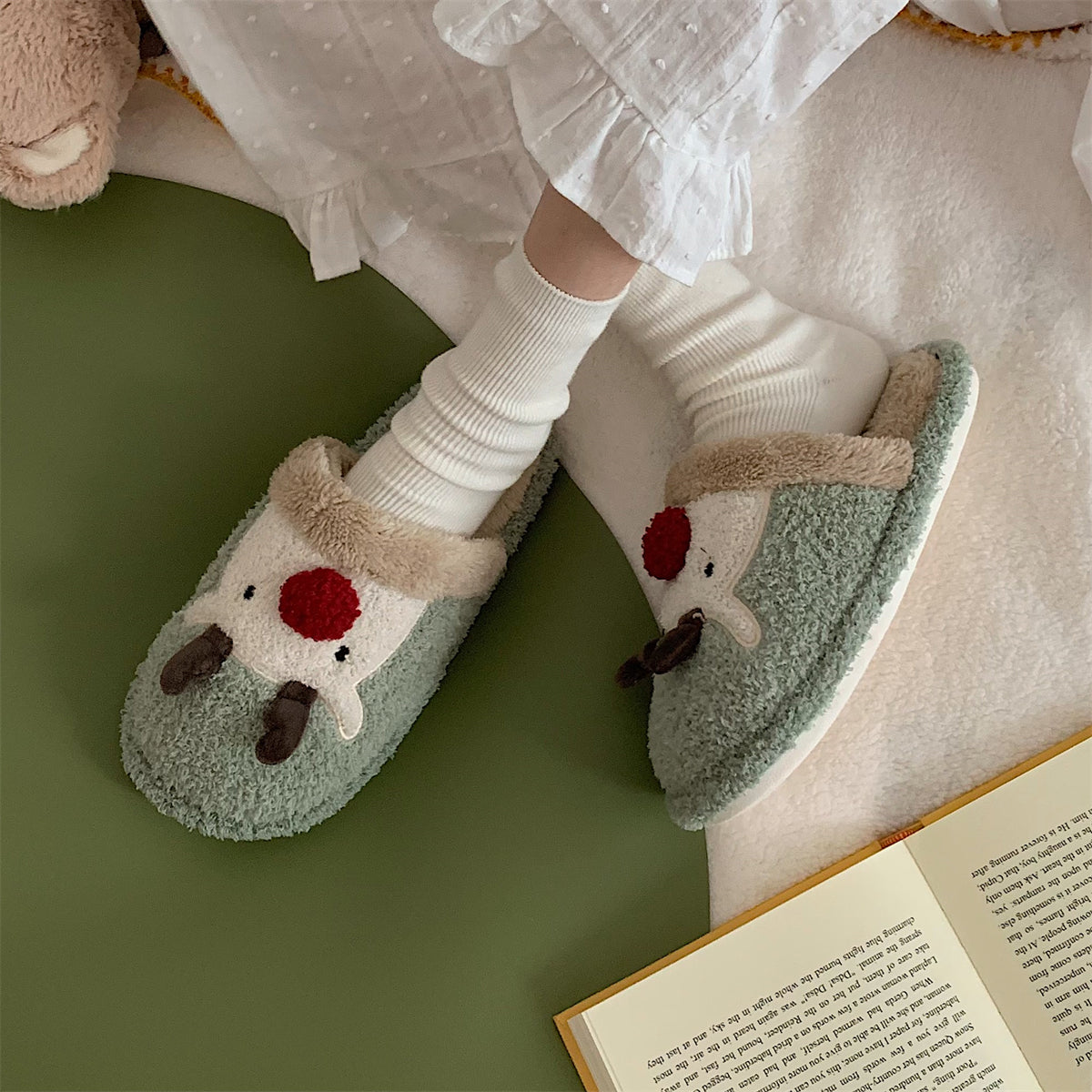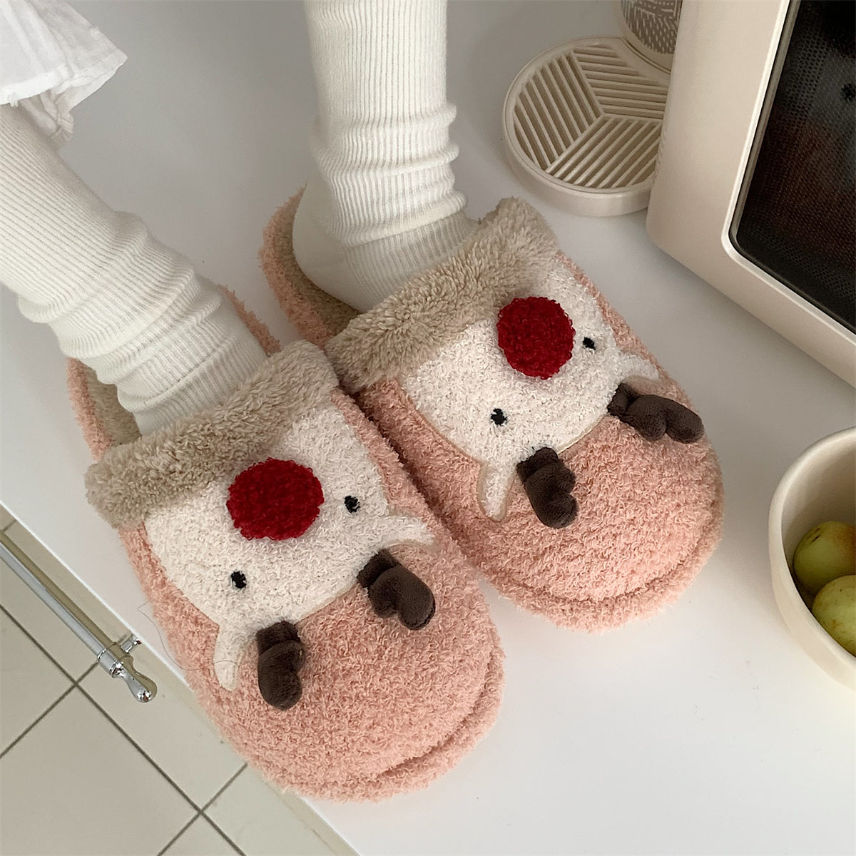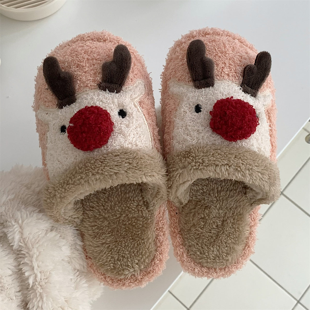 Мягкие домашние тапочки с плюшевым верхом и рождественским дизайном, обеспечивающие тепло и комфорт. Плоская подошва из пластика с антискользящей структурой, подходит для взрослых и детей. Модель с закрытым носком, мультяшный стиль и декоративная швейная нить.