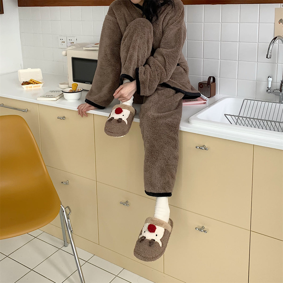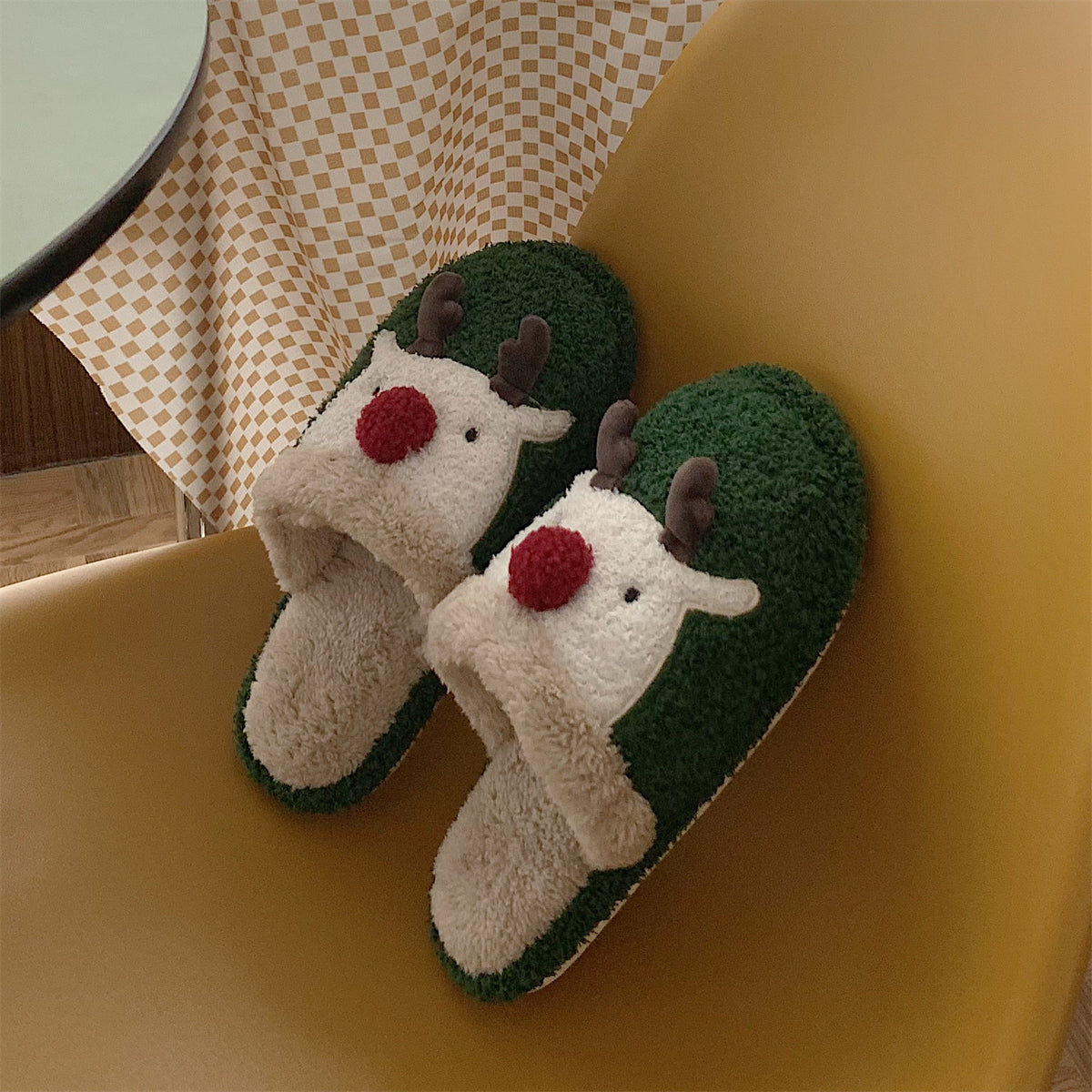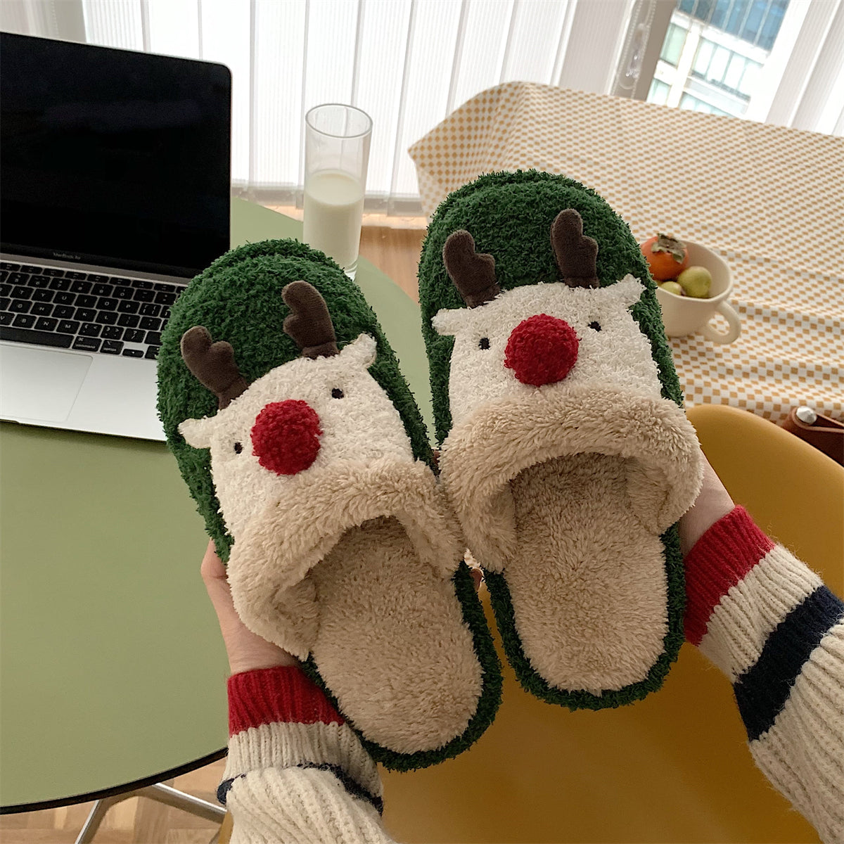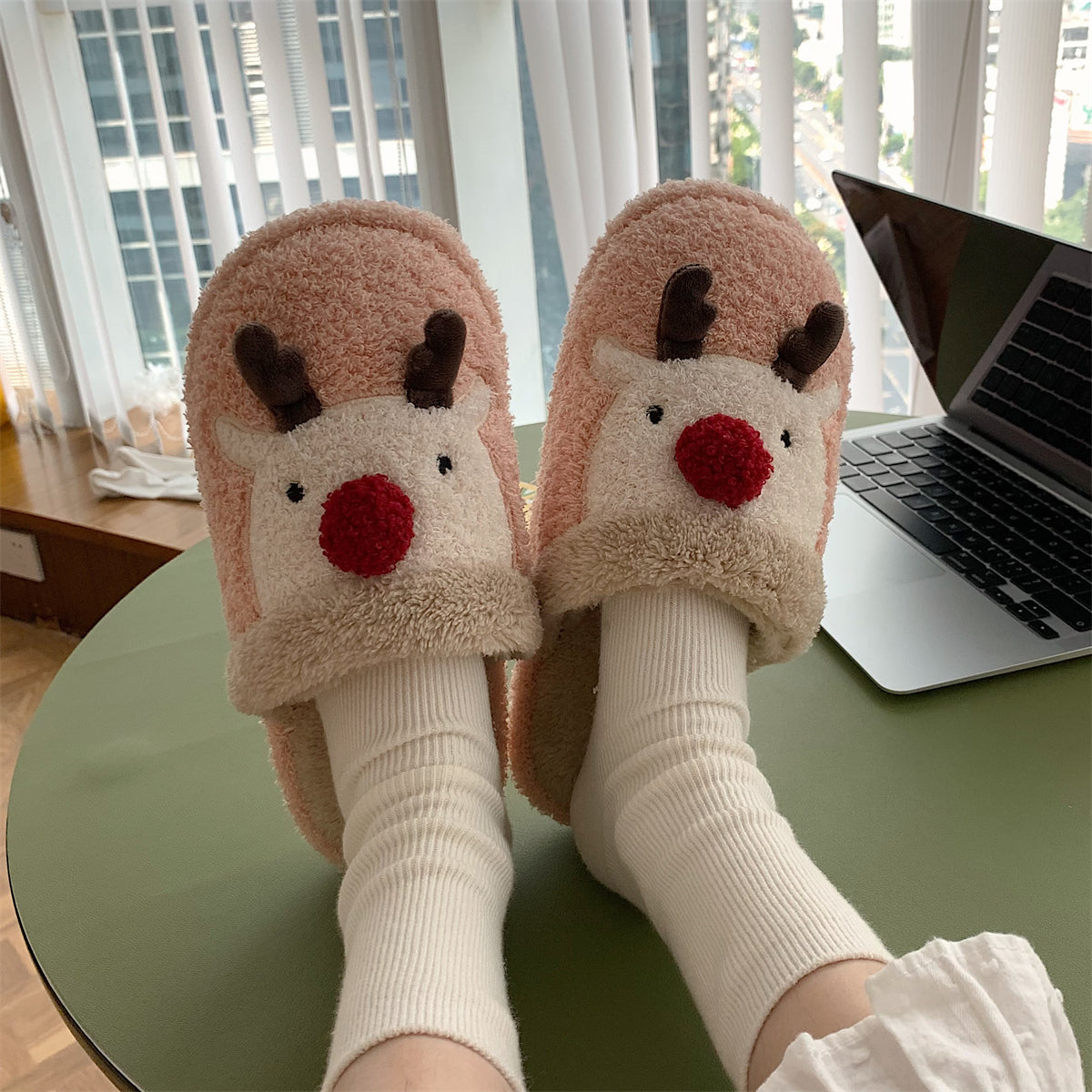 Мягкие домашние тапочки с плюшевым верхом и рождественским дизайном, обеспечивающие тепло и комфорт. Плоская подошва из пластика с антискользящей структурой, подходит для взрослых и детей. Модель с закрытым носком, мультяшный стиль и декоративная швейная нить.