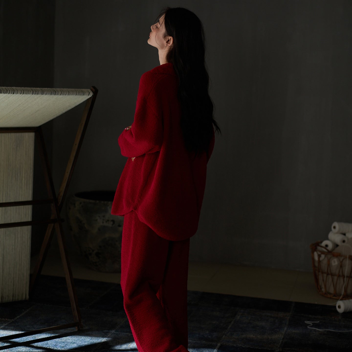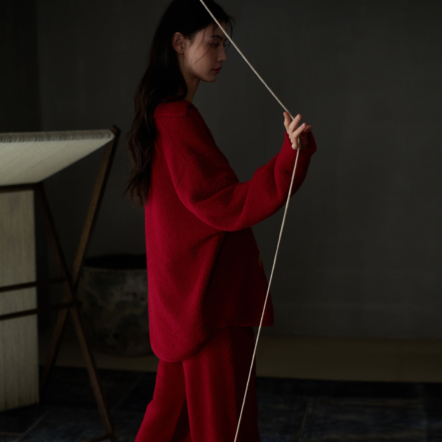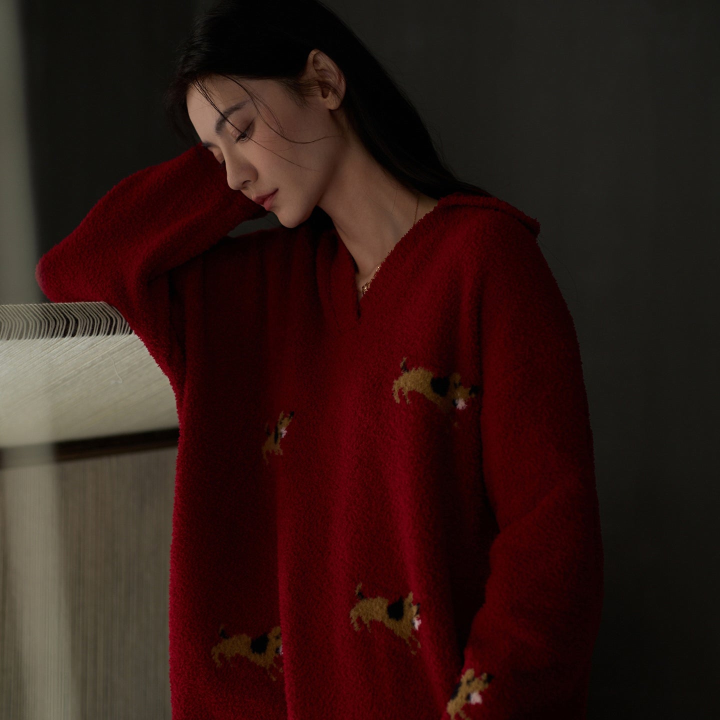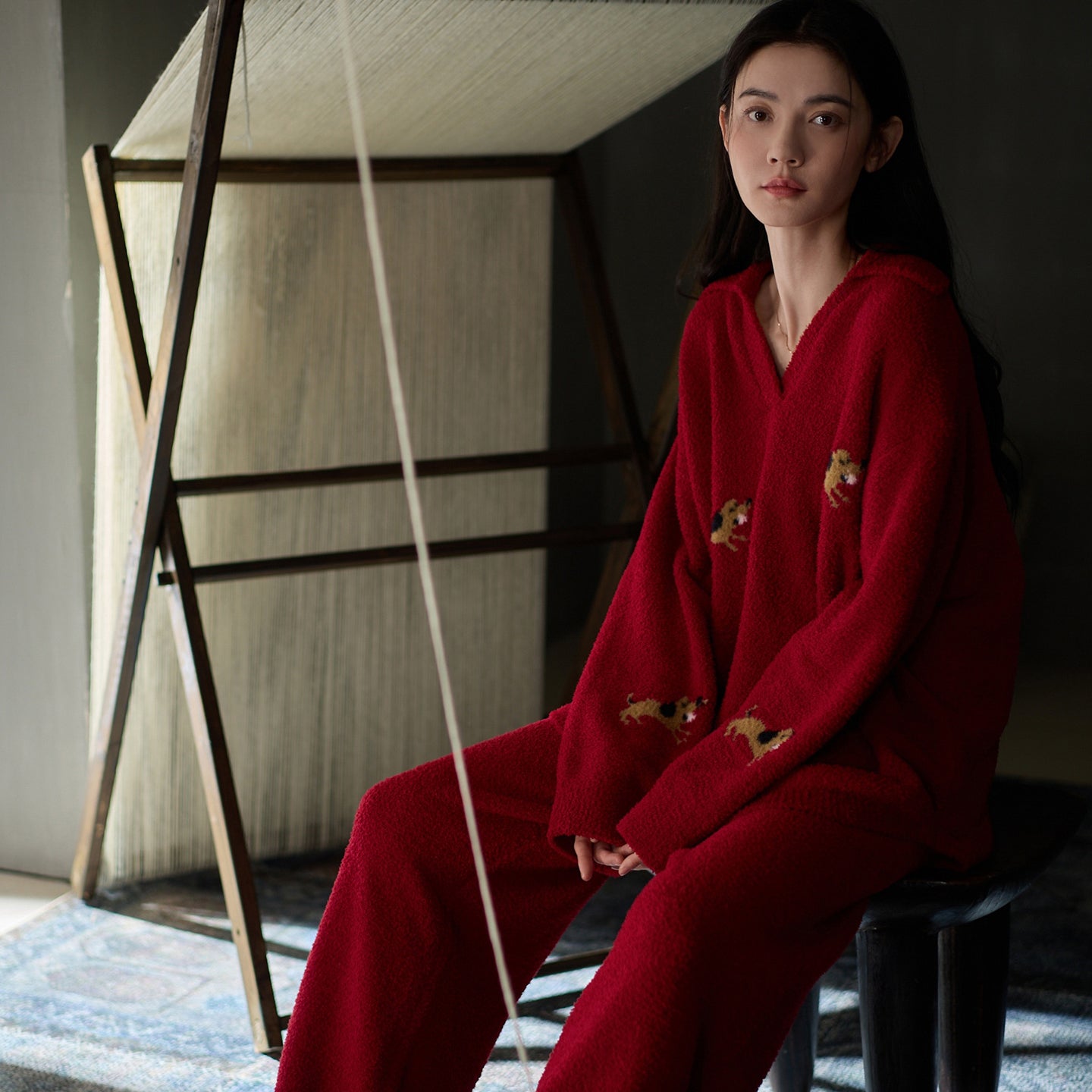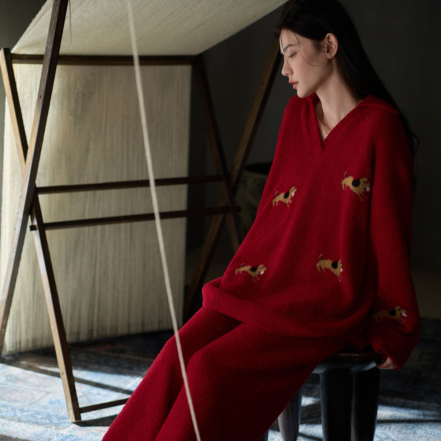 Мягкая и теплая пижама с длинными рукавами и V-образным вырезом из кораллового флиса с милым принтом собачки. Этот комплект обеспечивает комфортный и уютный домашний отдых в осенне-зимний период.