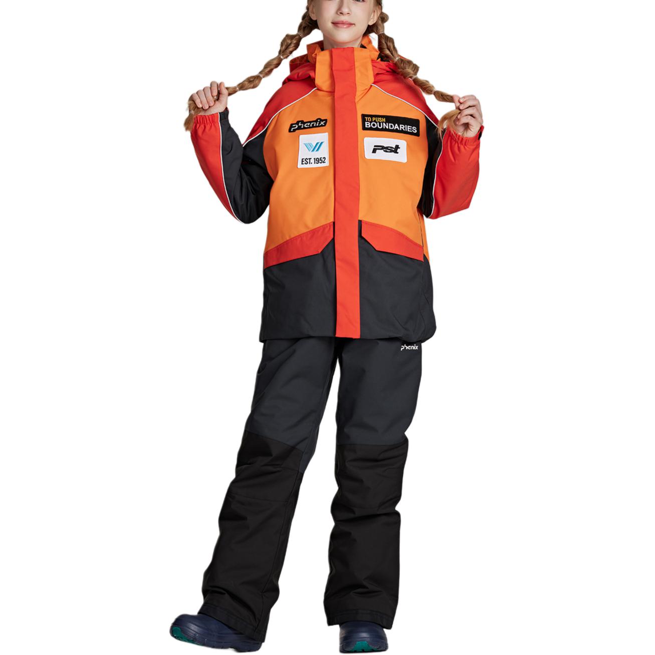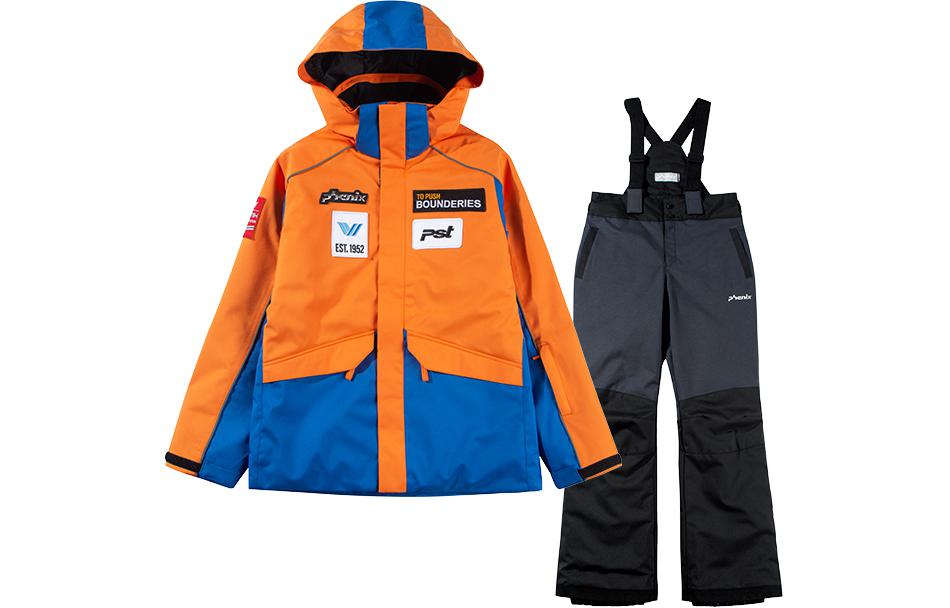 Детский горнолыжный костюм Phenix PST с капюшоном и длинными рукавами, верх украшен буквенным принтом, брюки выполнены в лоскутном стиле, обеспечивает тепло и комфорт для активного зимнего отдыха.