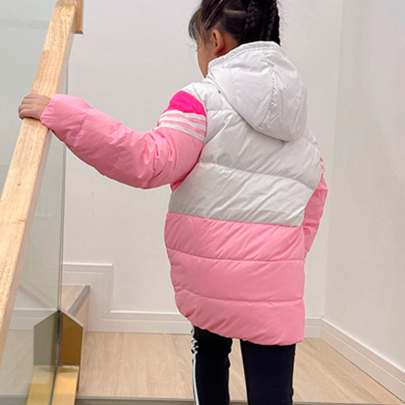 Детская пуховая куртка Adidas с капюшоном и лоскутным дизайном, мягкая и теплая. Модель отлично сохраняет тепло и подходит для активного отдыха и прогулок.