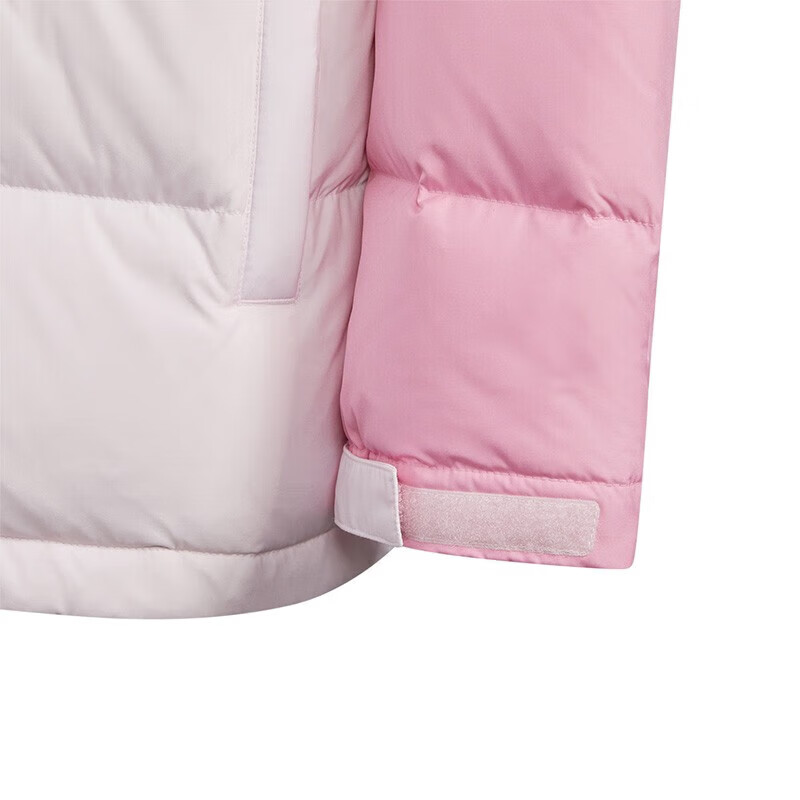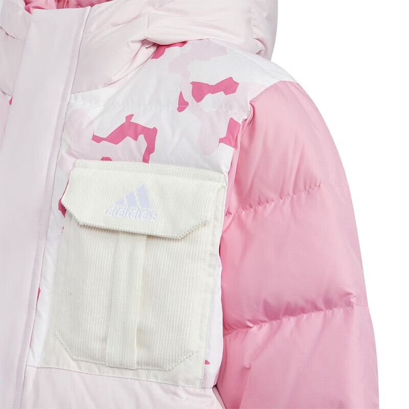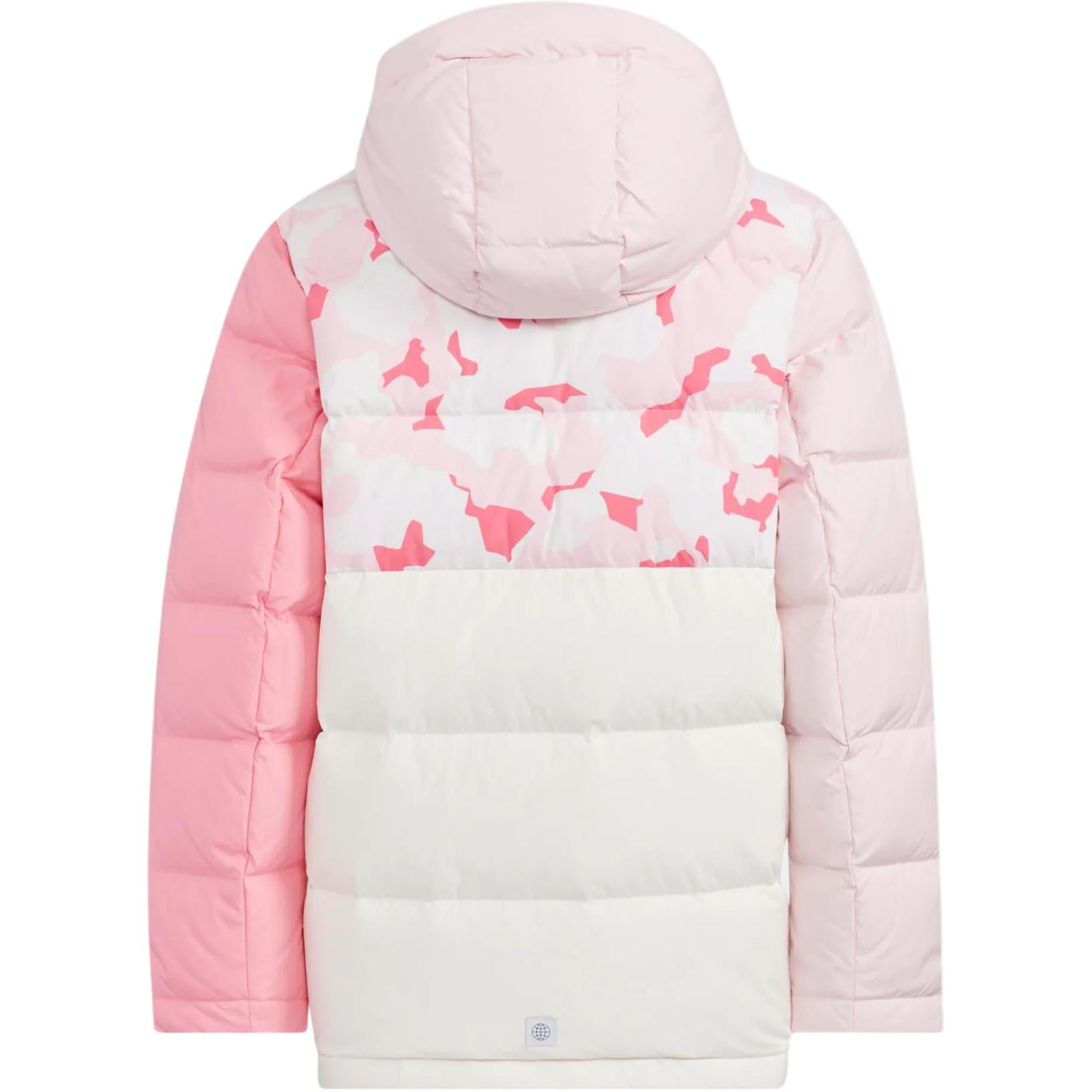 Детский пуховик Adidas с капюшоном и длинными рукавами, украшенный принтом с логотипом бренда. Легкий, теплый и удобный для ежедневной носки и активных игр.