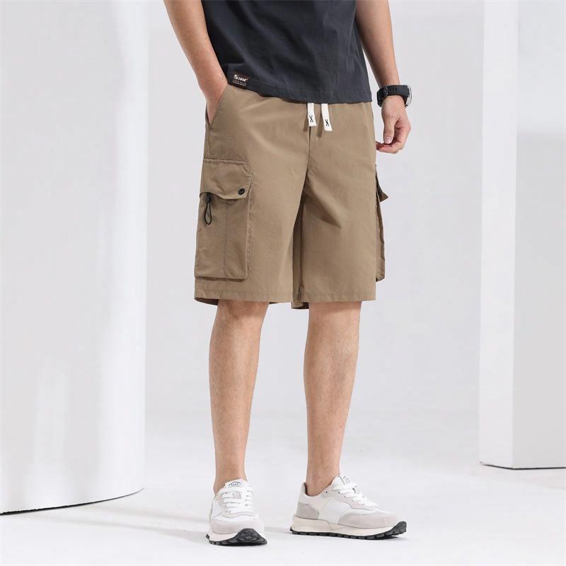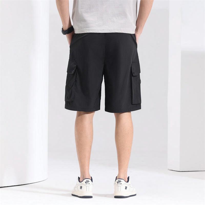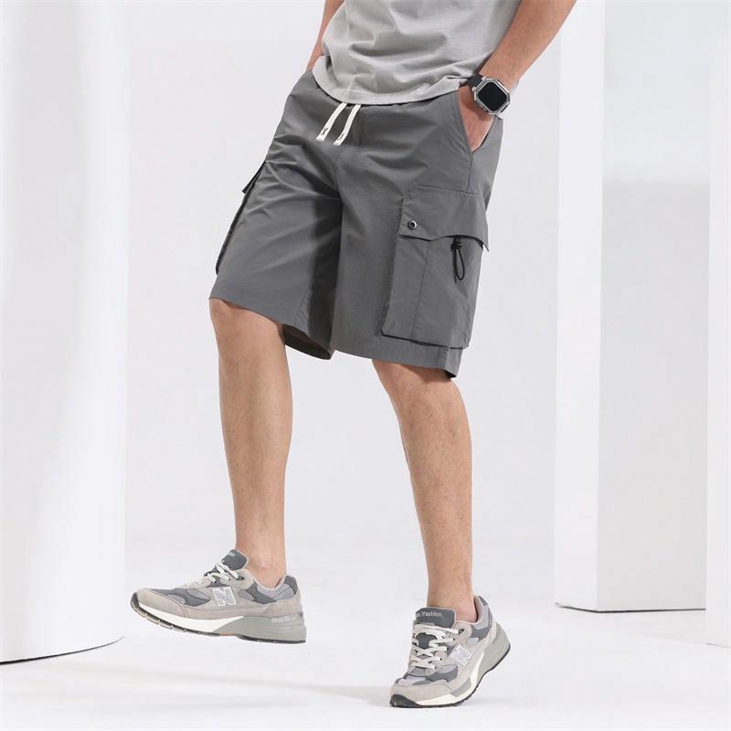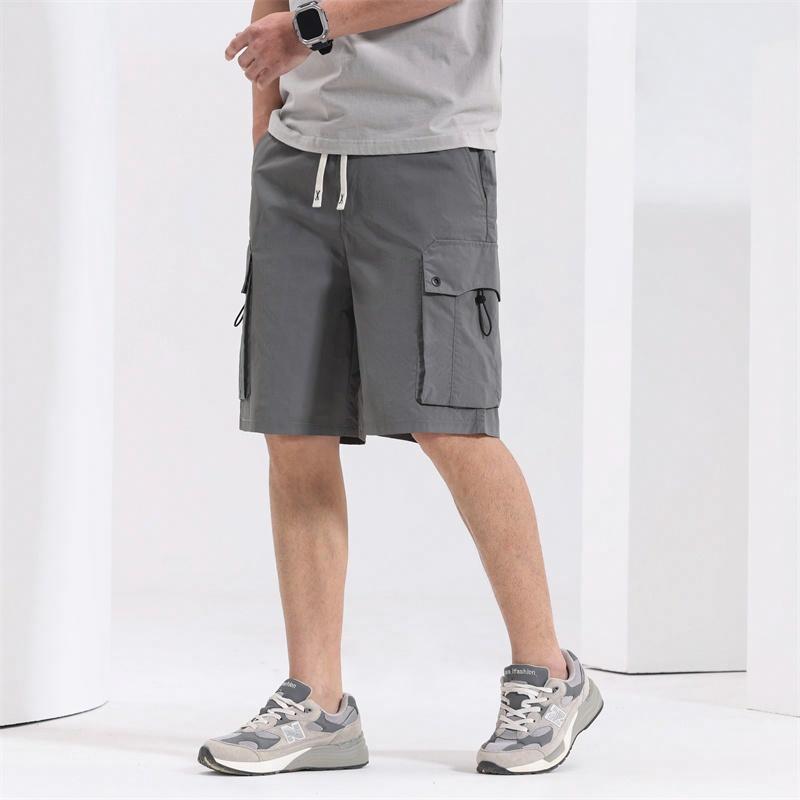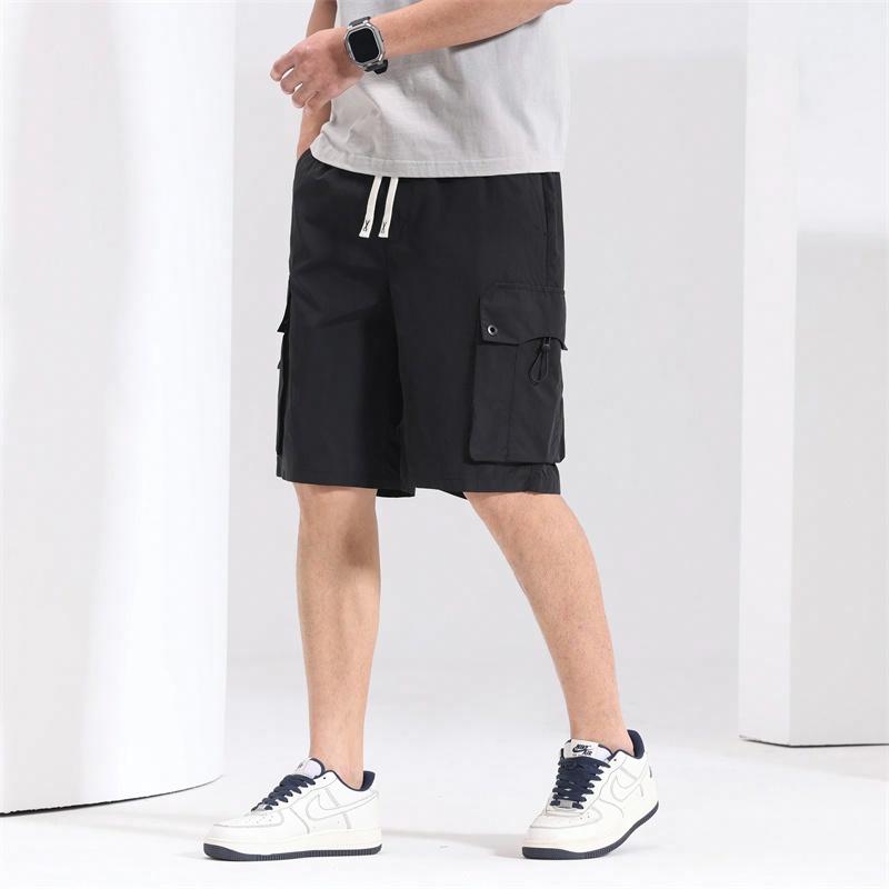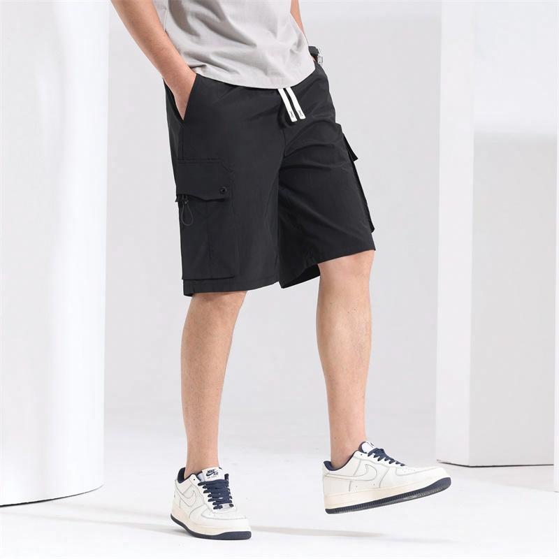 Мужские спортивные шорты средней длины в стиле американской уличной моды. Модель прямого кроя с поясом на шнурке для регулировки, выполнена из легкого синтетического материала.