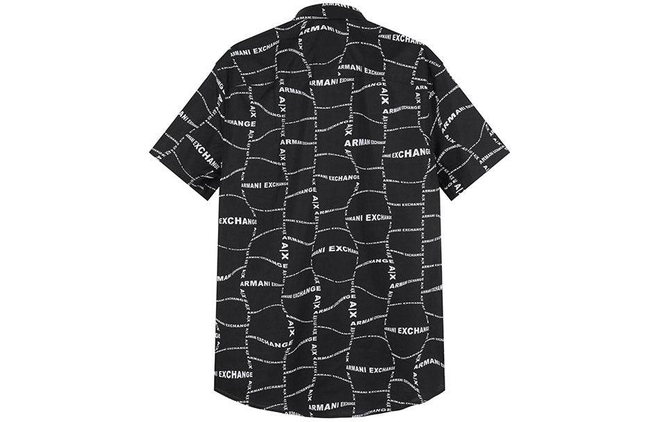 Эта черная рубашка с короткими рукавами и полным принтом логотипов Armani предлагает стильный и современный вид. С однобортным кроем, она идеально подходит для повседневного ношения и может легко сочетаться с различными элементами гардероба.