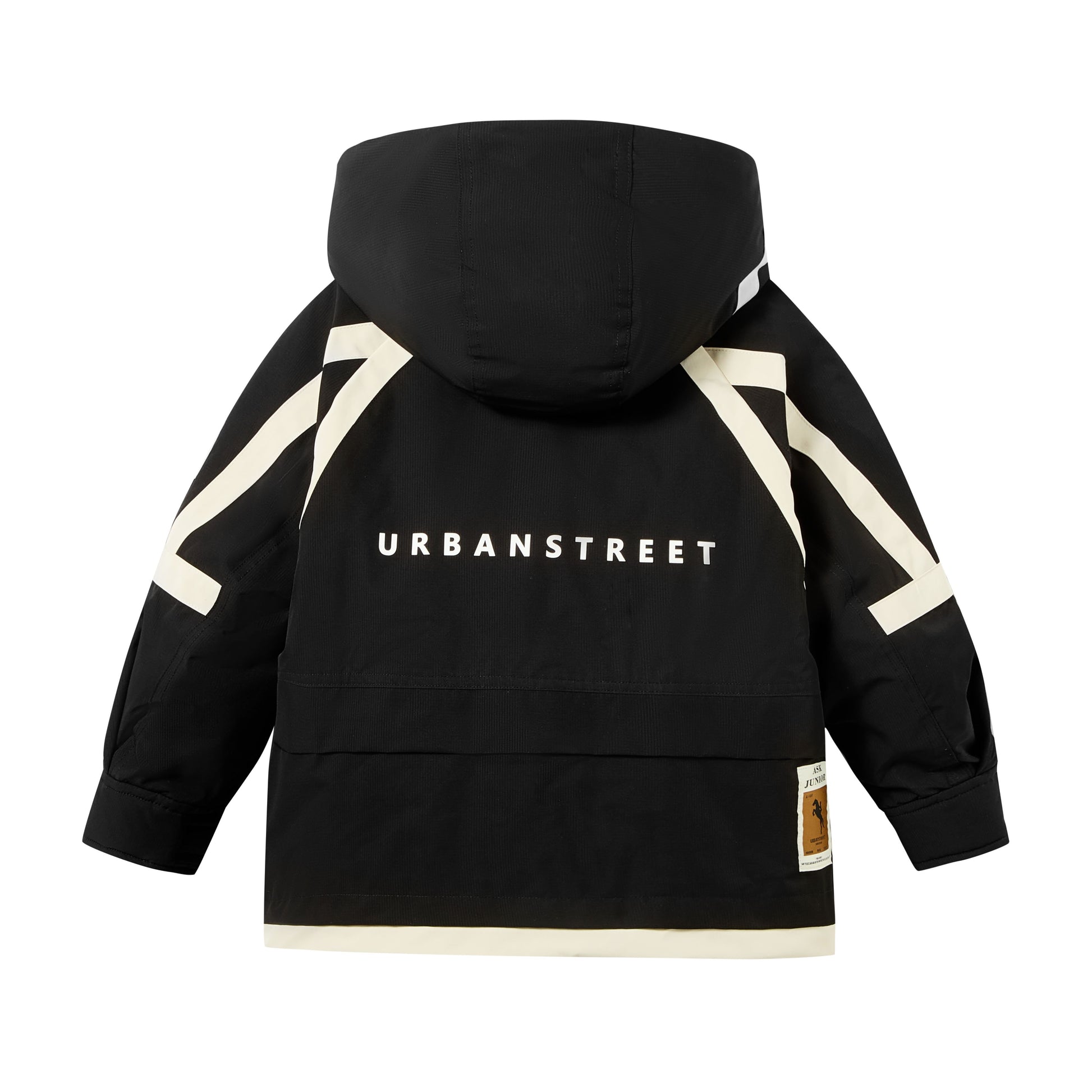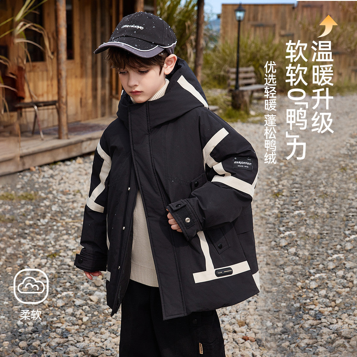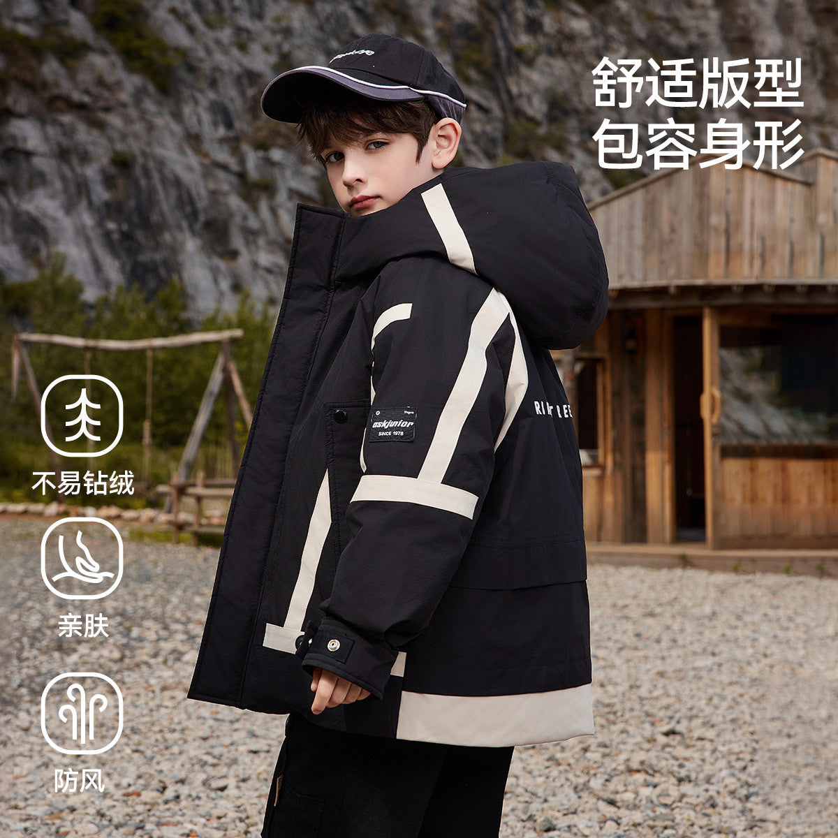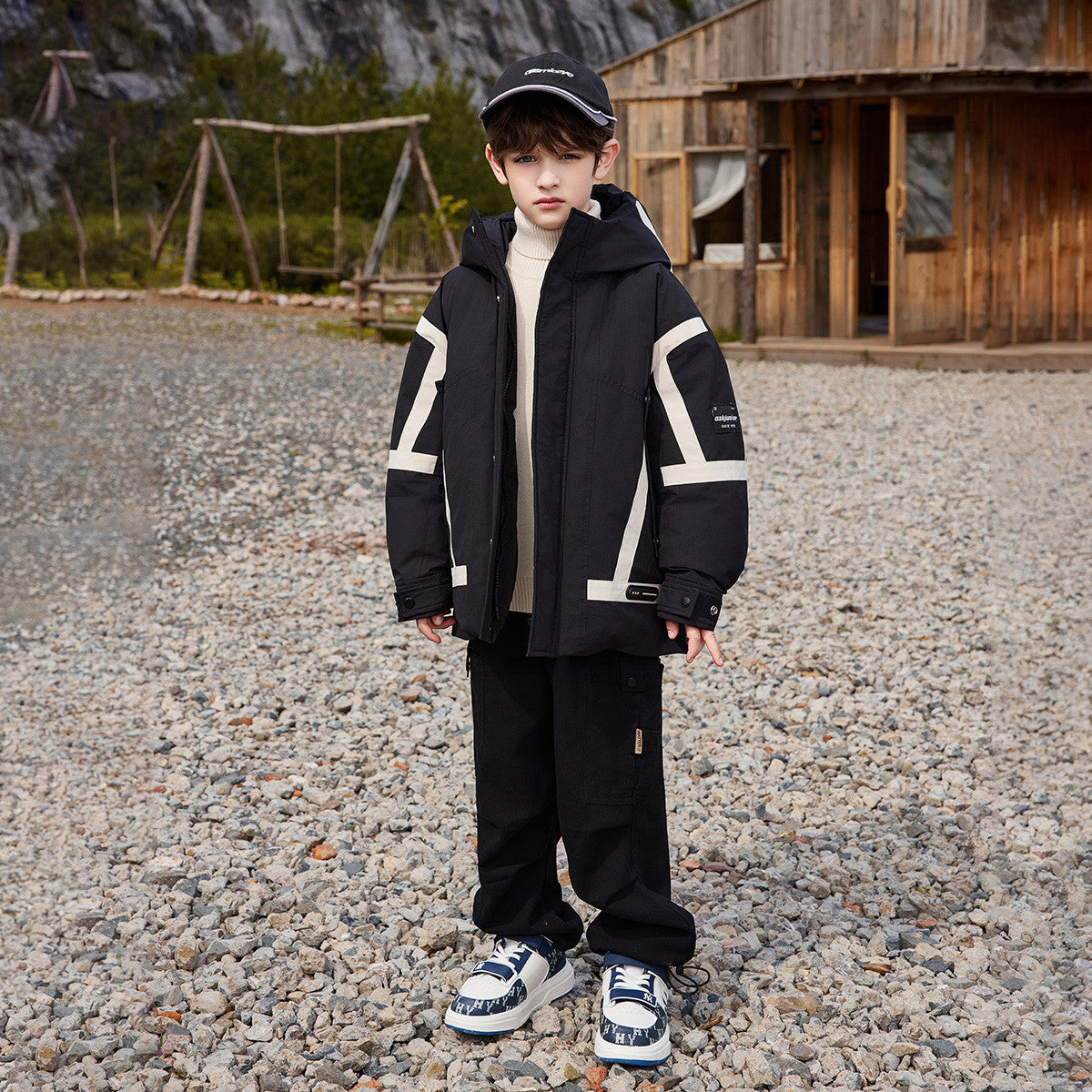 Длинный детский пуховик в стиле рабочей одежды с капюшоном и контрастными вставками, наполненный утиным пухом и дополнительным синтетическим утеплителем. Модель обеспечивает тепло, защиту от вылезания наполнителя и современный городской стиль.