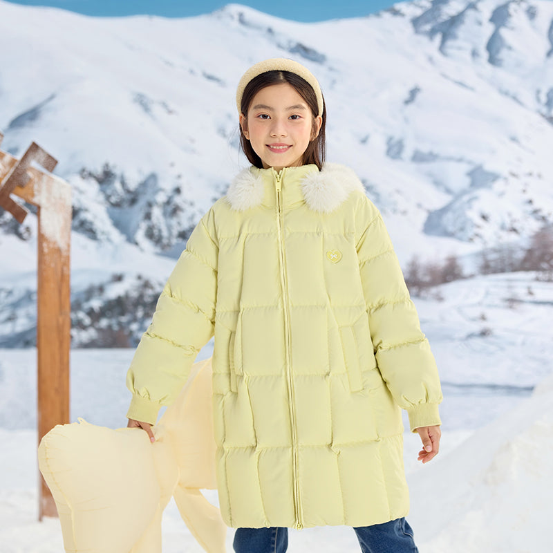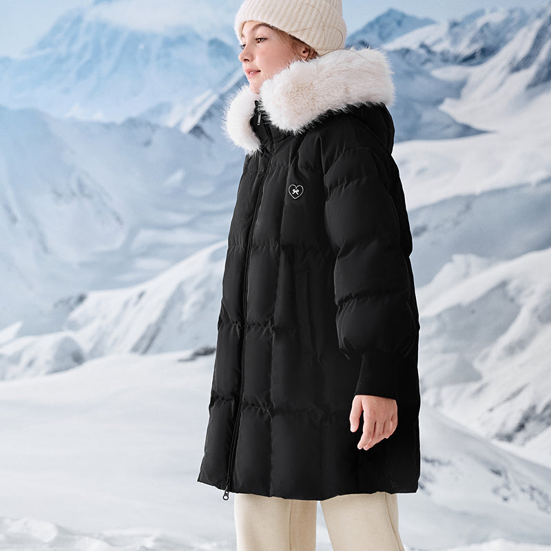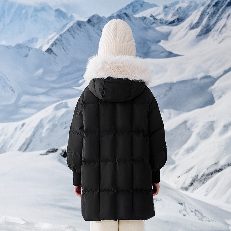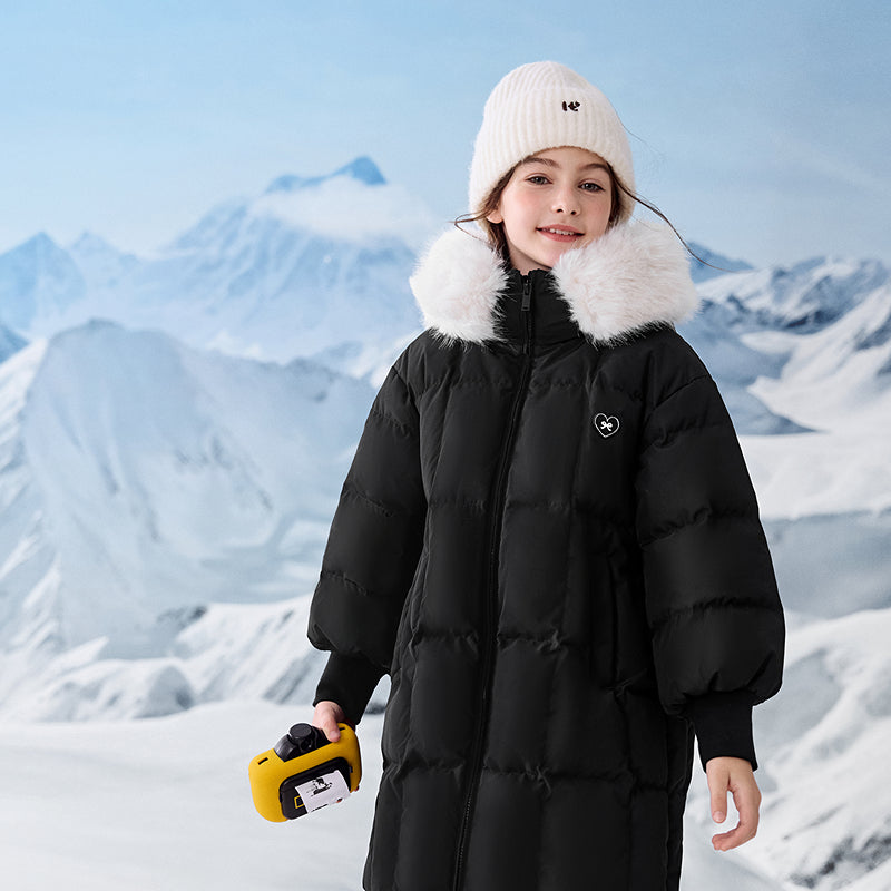 Длинный детский пуховик с капюшоном и меховой отделкой в классическом минималистичном стиле. Модель наполнена серым утиным пухом, обеспечивая тепло, защиту от ветра и комфорт для повседневного использования.