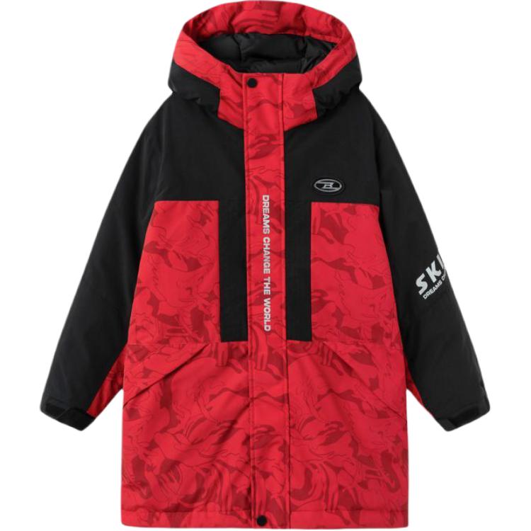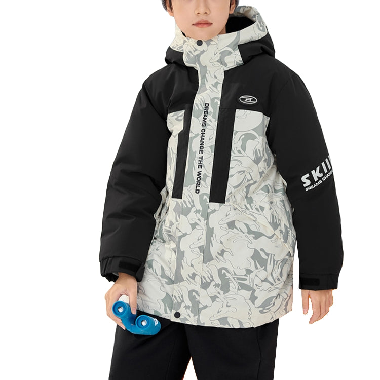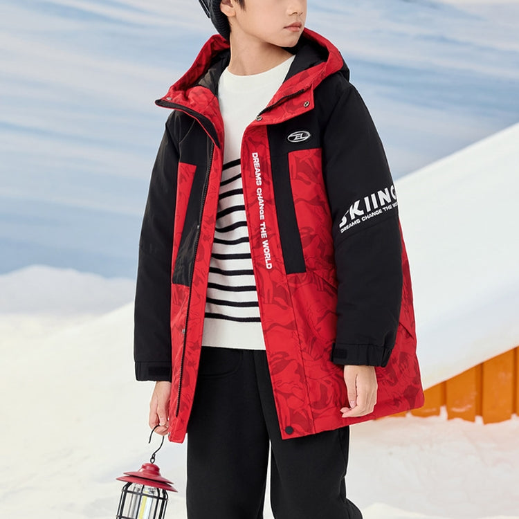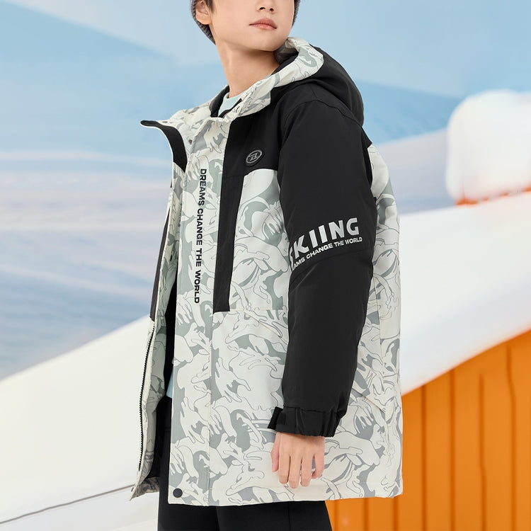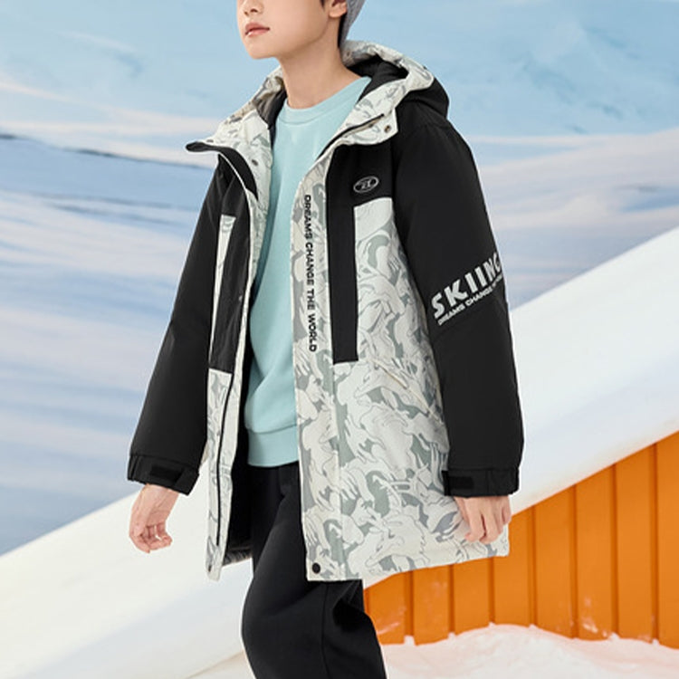 Длинный детский пуховик с капюшоном, выполненный из водо- и ветрозащитной ткани с контрастными вставками. Модель свободного кроя наполнена серым утиным пухом, обеспечивая надежную защиту от непогоды и комфорт.