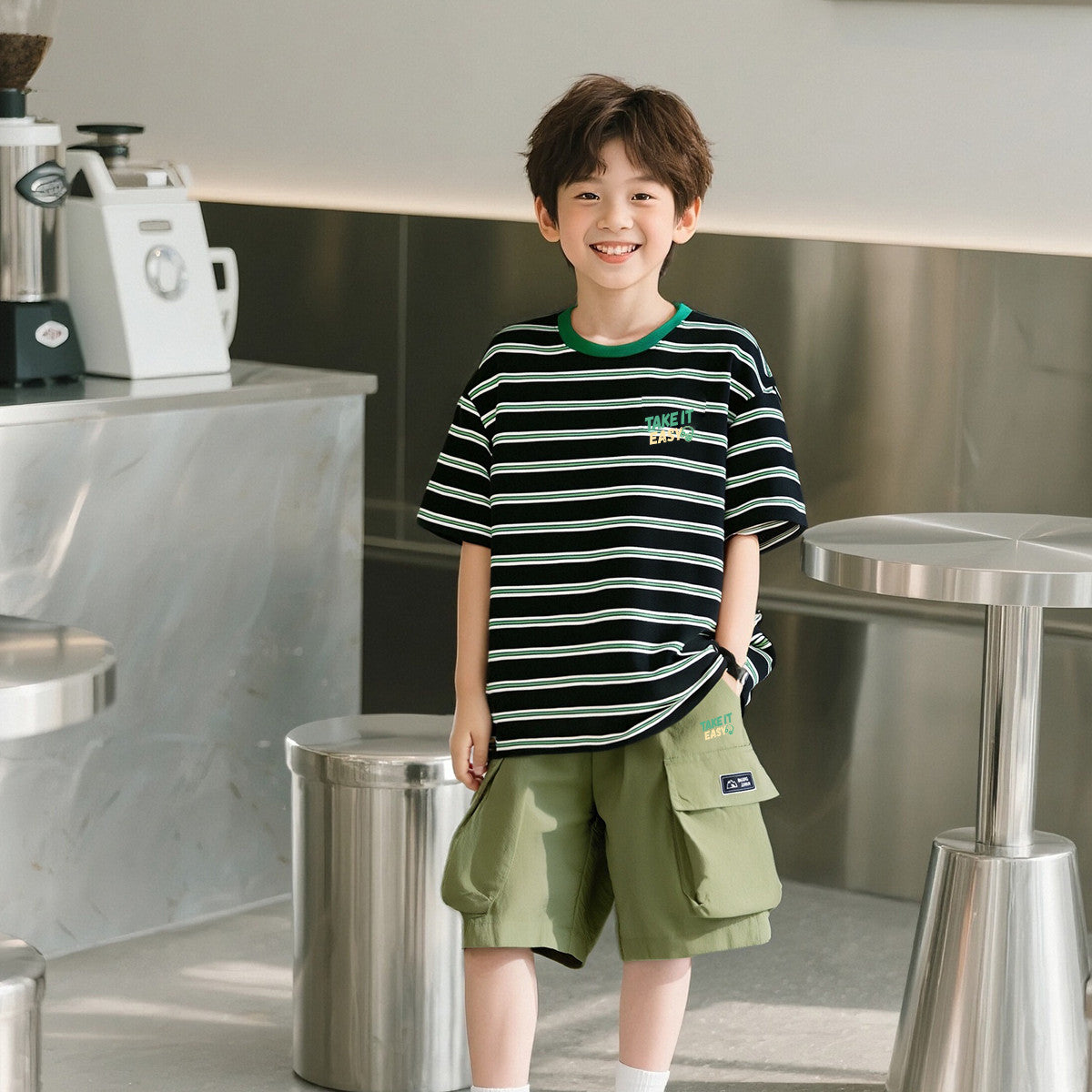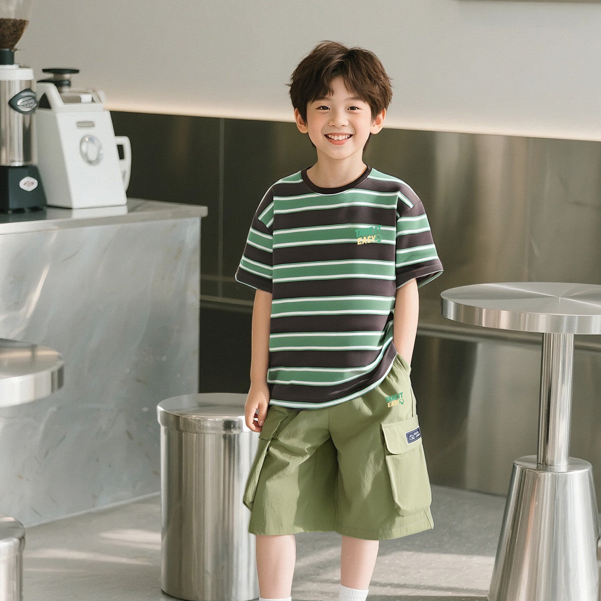 Лёгкий летний комплект для мальчиков с футболкой с коротким рукавом и шортами на эластичной талии. Дышащие и мягкие материалы обеспечивают комфорт и свободу движений для активного отдыха и игр.