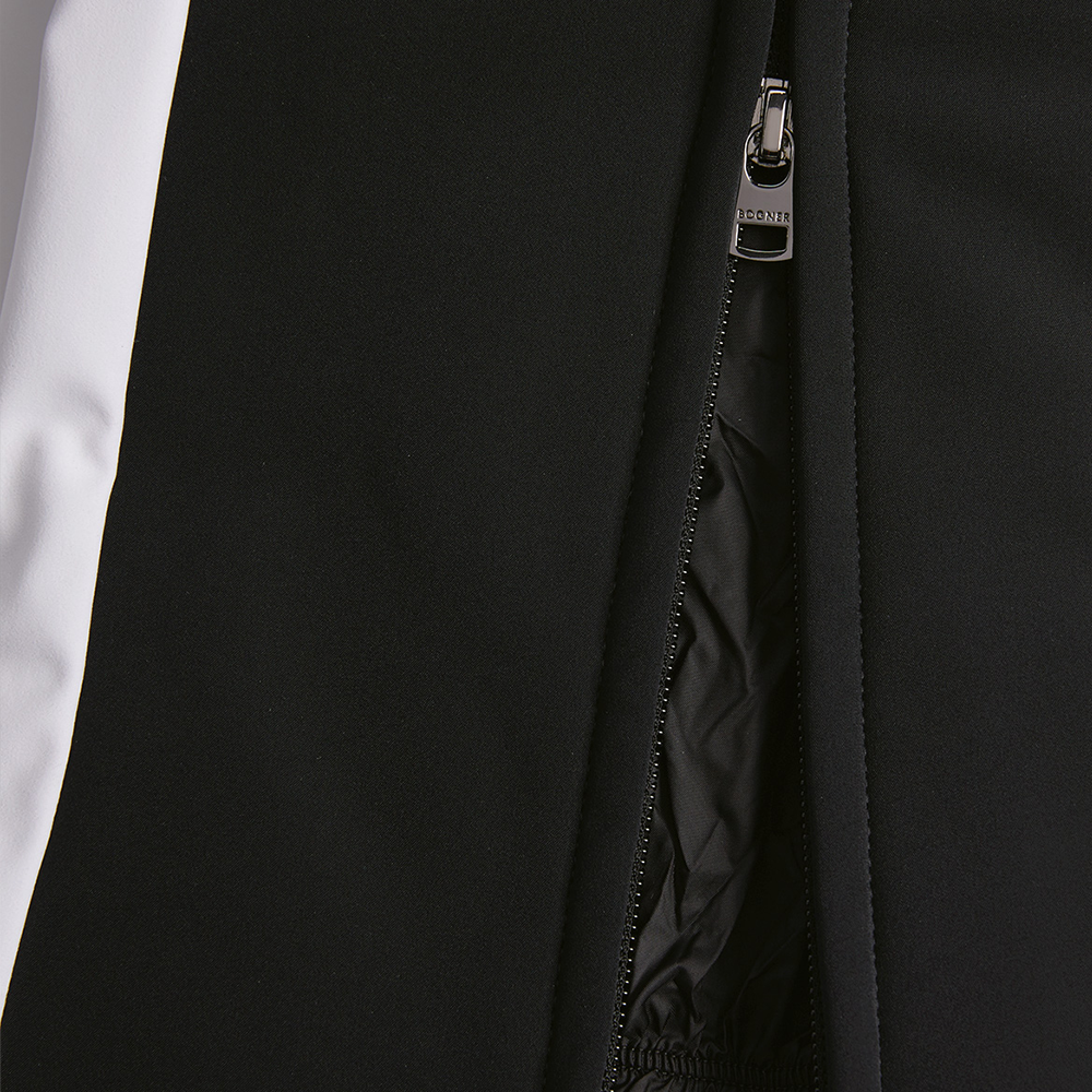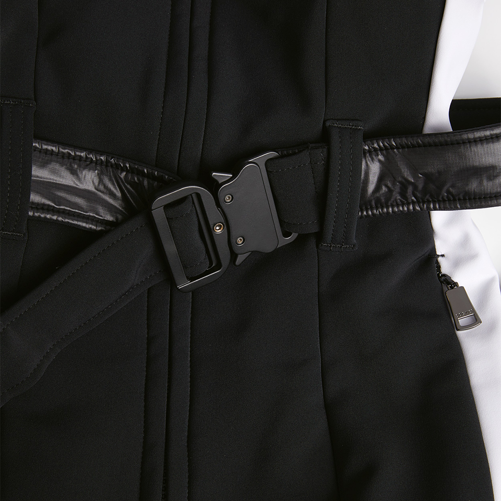 Женский горнолыжный комбинезон Bogner FW22 Patchwork чёрного цвета, цельного кроя, профессиональный, с пэчворк-дизайном, обеспечивает тепло, комфорт и защиту от ветра и влаги при катании на лыжах.