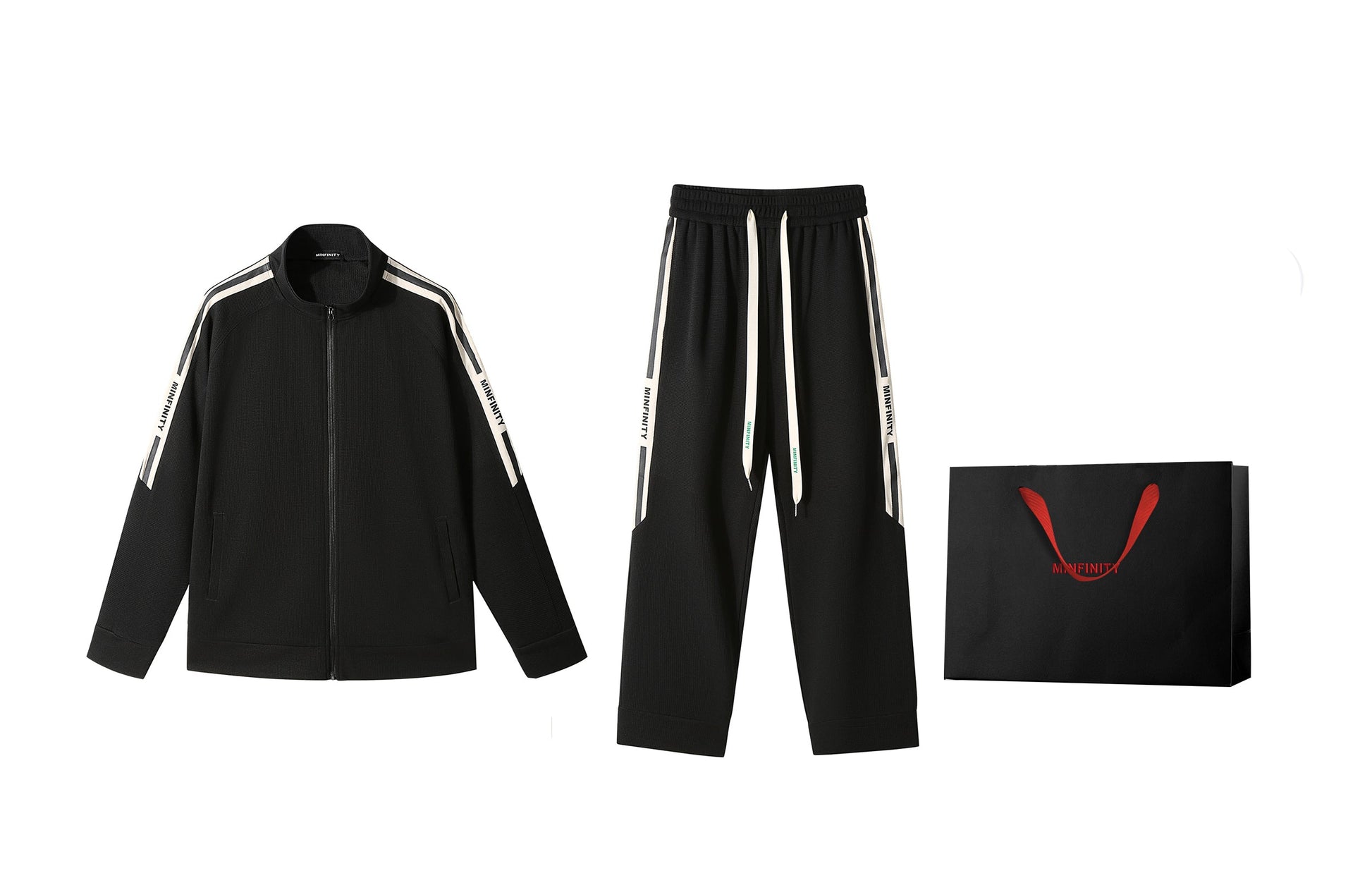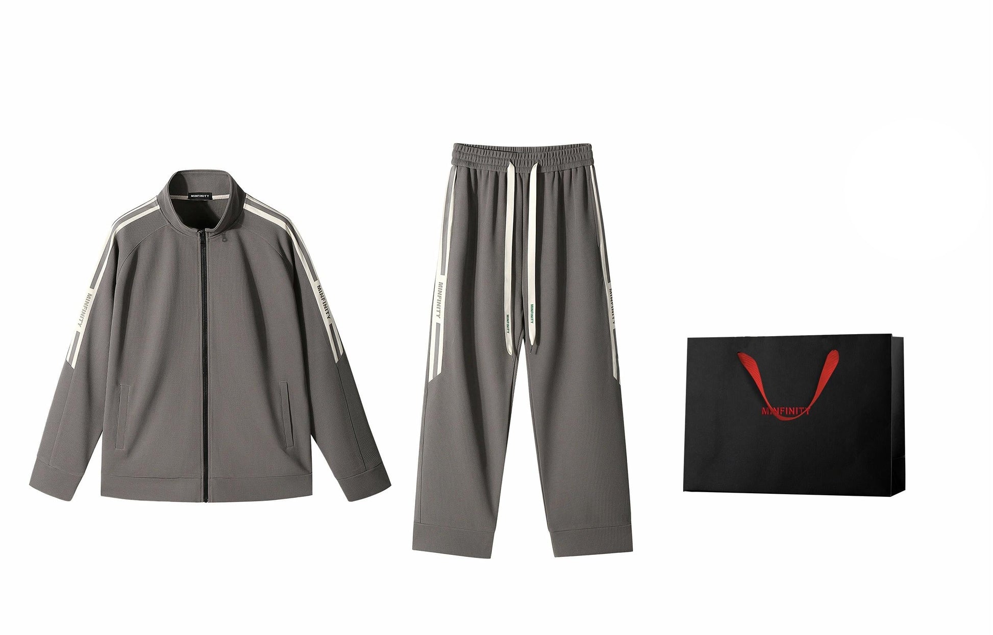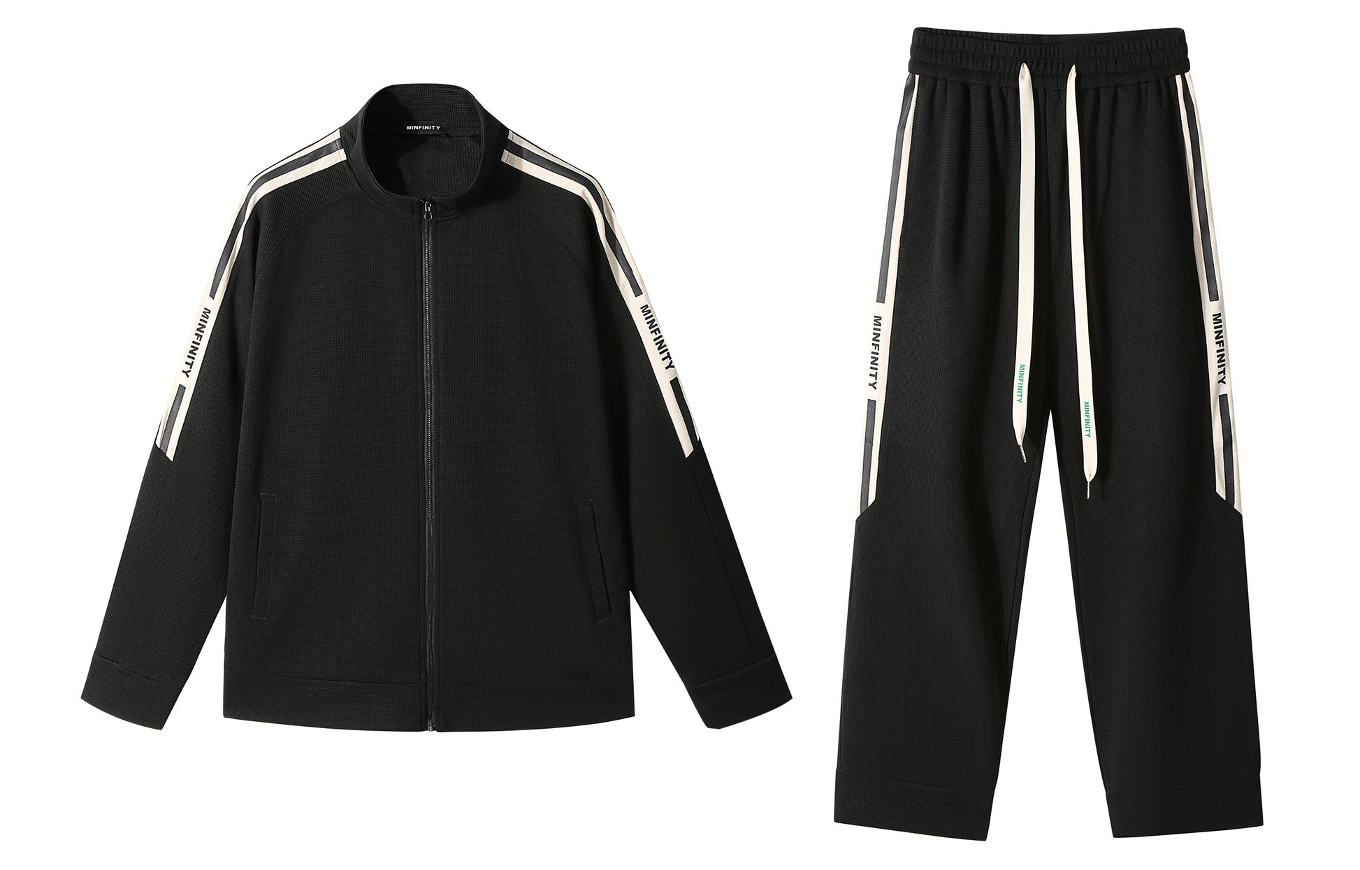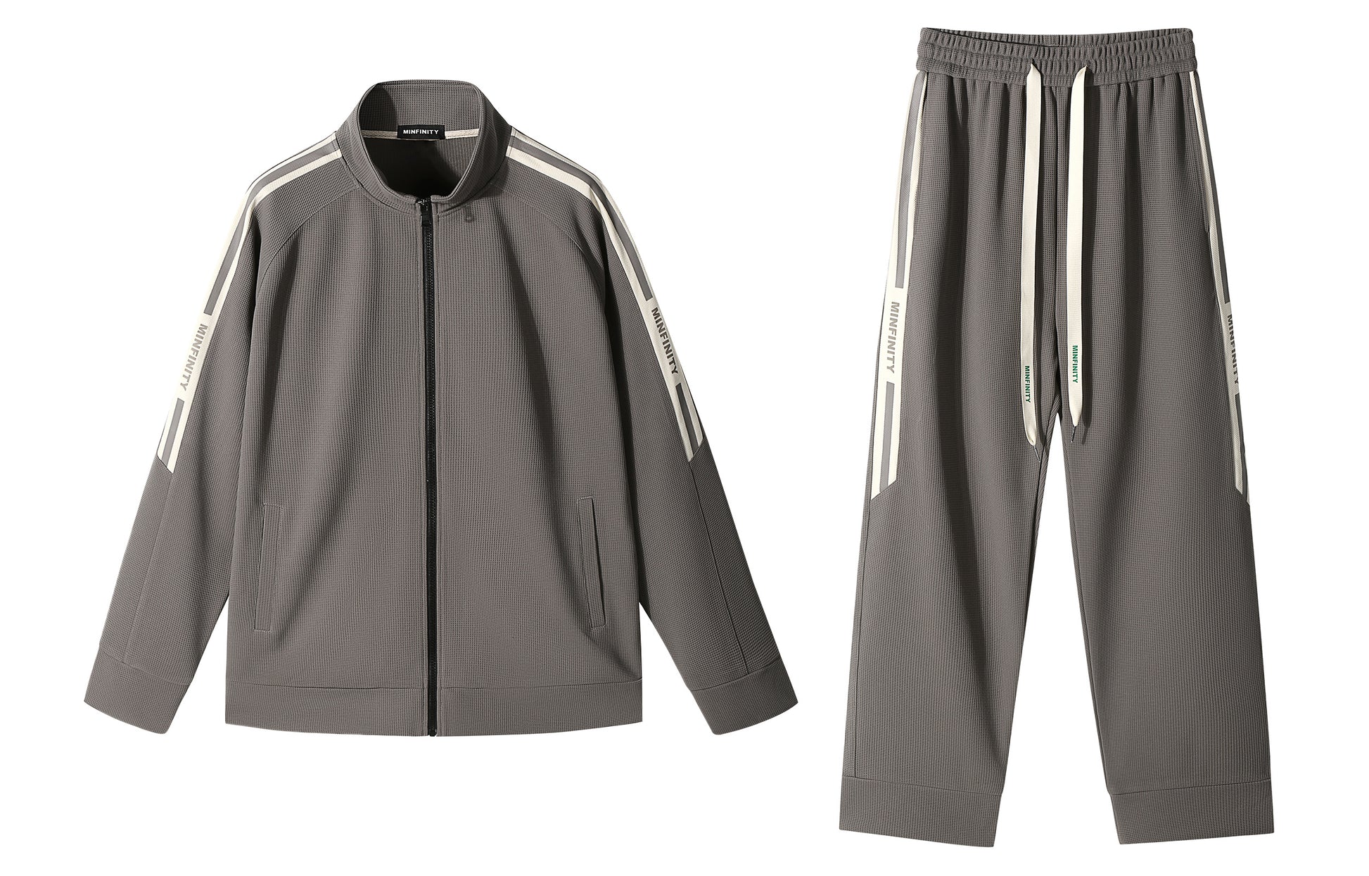 Стильный спортивный костюм Minfinity с буквенным принтом и воротником‑стойкой. Толстовка на молнии с опущенным плечом и свободным кроем обеспечивает комфорт и современный вид. Брюки прямого силуэта со шнурком на талии дополнены декоративными полосами и драпировкой. Модель выполнена в премиальном стиле и подходит для повседневной носки и активного отдыха.