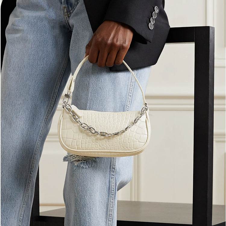 Мини-сумка с цепочкой, выполненная из винтажной кожи с крокодиловым эффектом в кремовом цвете. Эта элегантная сумка подмышку может носиться на плече, что делает её идеальной для повседневного использования и вечерних выходов. Отличный выбор для женщин, ценящих стильный дизайн и высокое качество.