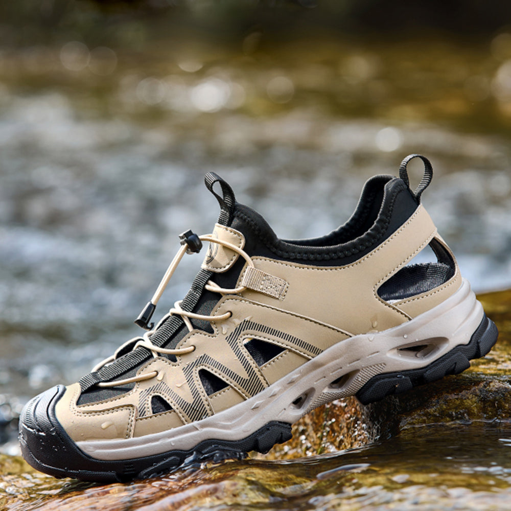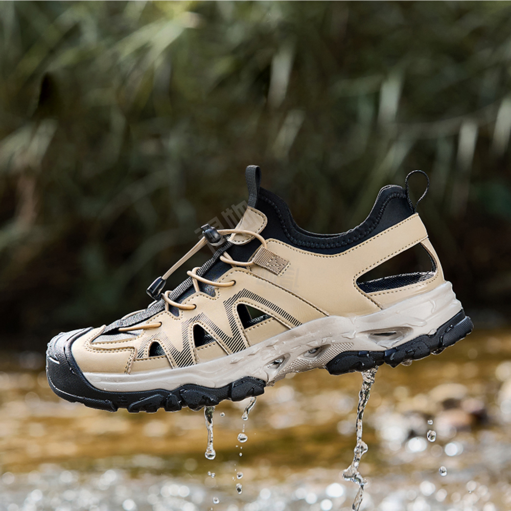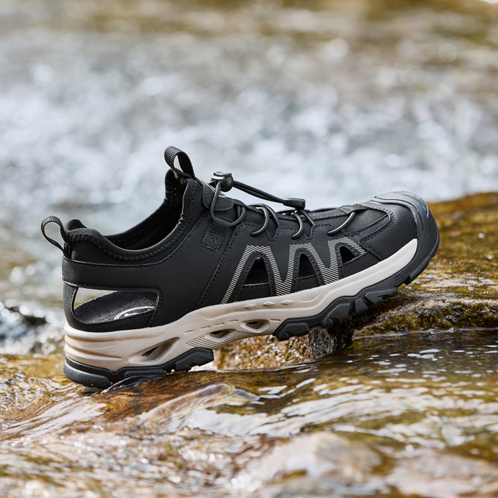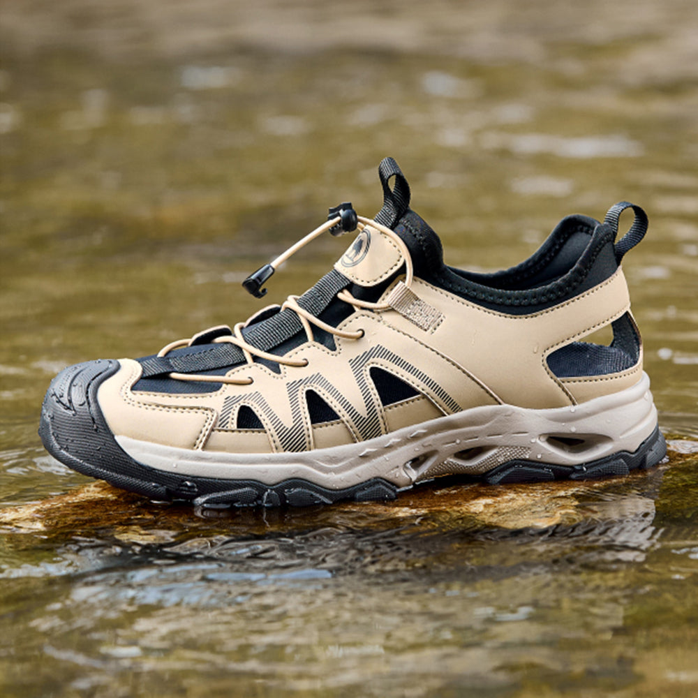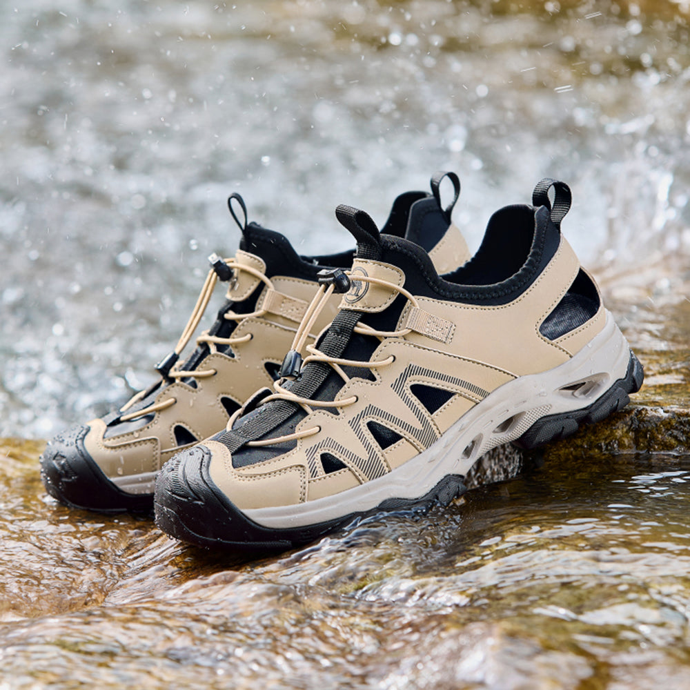 Мужские кроссовки-амфибии с водопроницаемым верхом из микрофибры и противоскользящей подошвой. Универсальная модель с системой шнуровки для активного отдыха в условиях повышенной влажности.