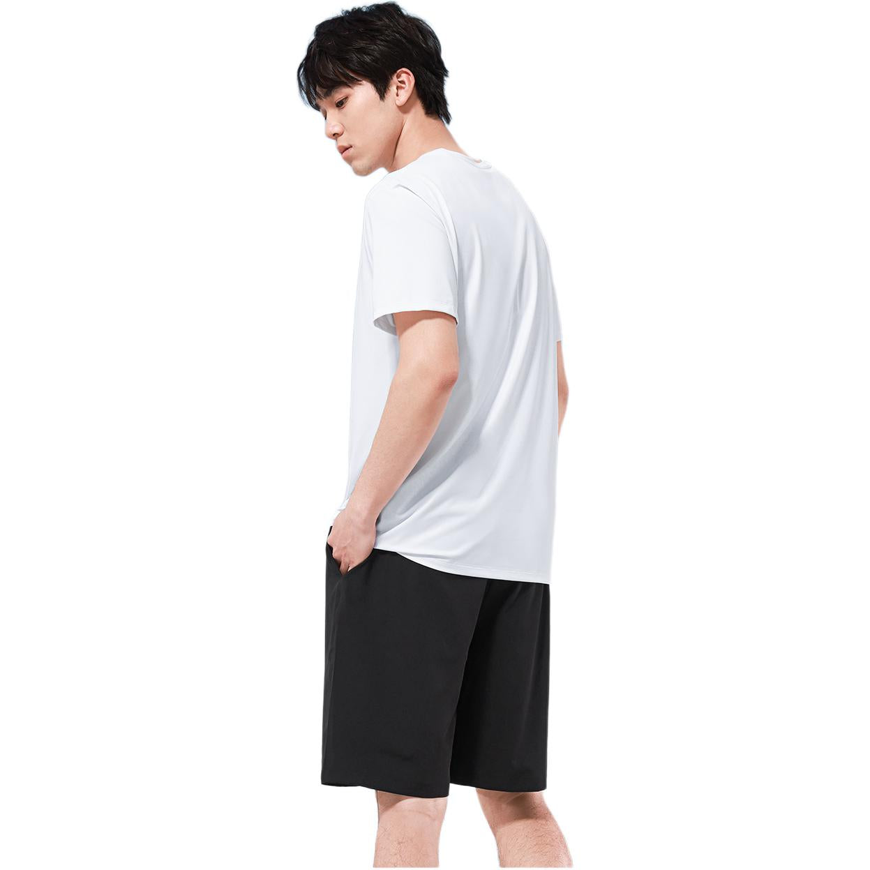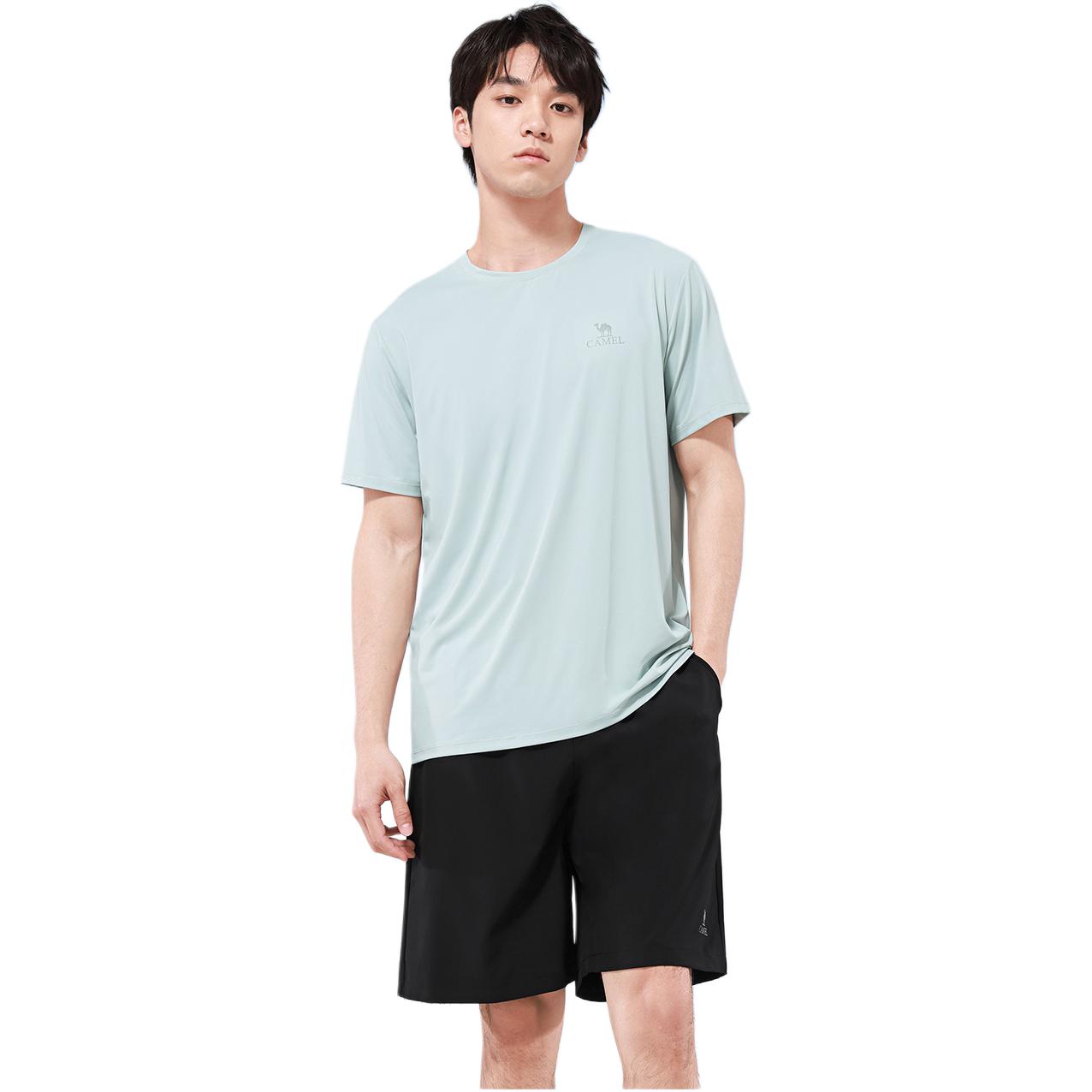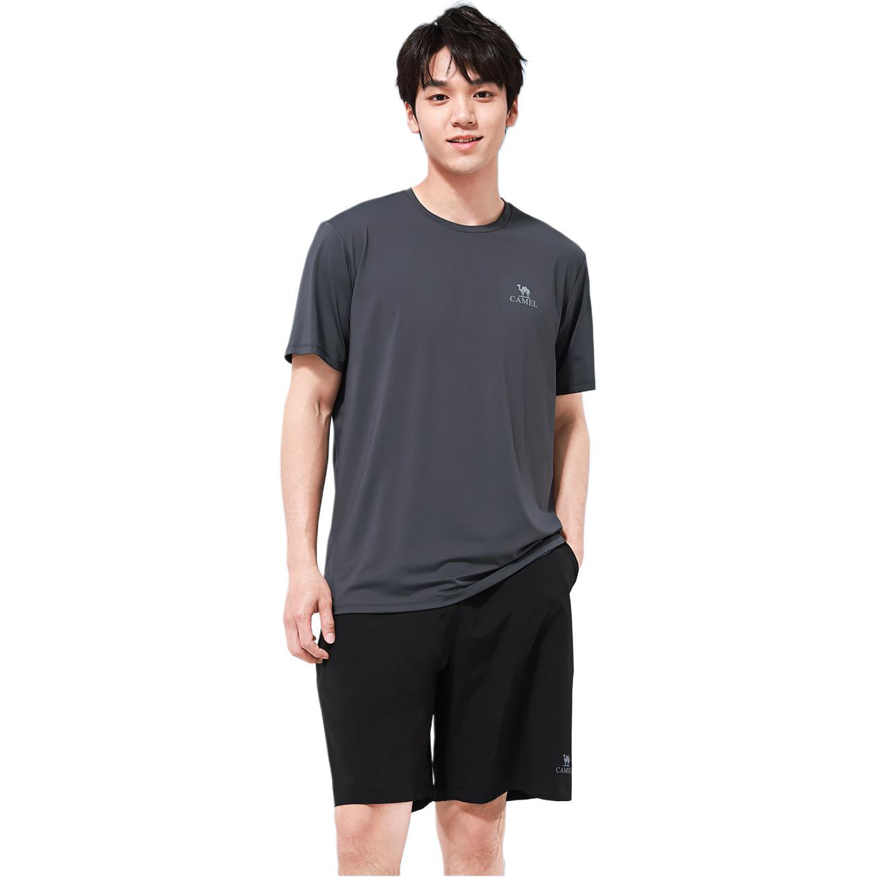 Комфортный спортивный комплект из футболки с круглым вырезом и шорт на резинке. Модель облегающего кроя из эластичной смесовой ткани обеспечивает свободу движений и подходит для тренировок и активного отдыха.