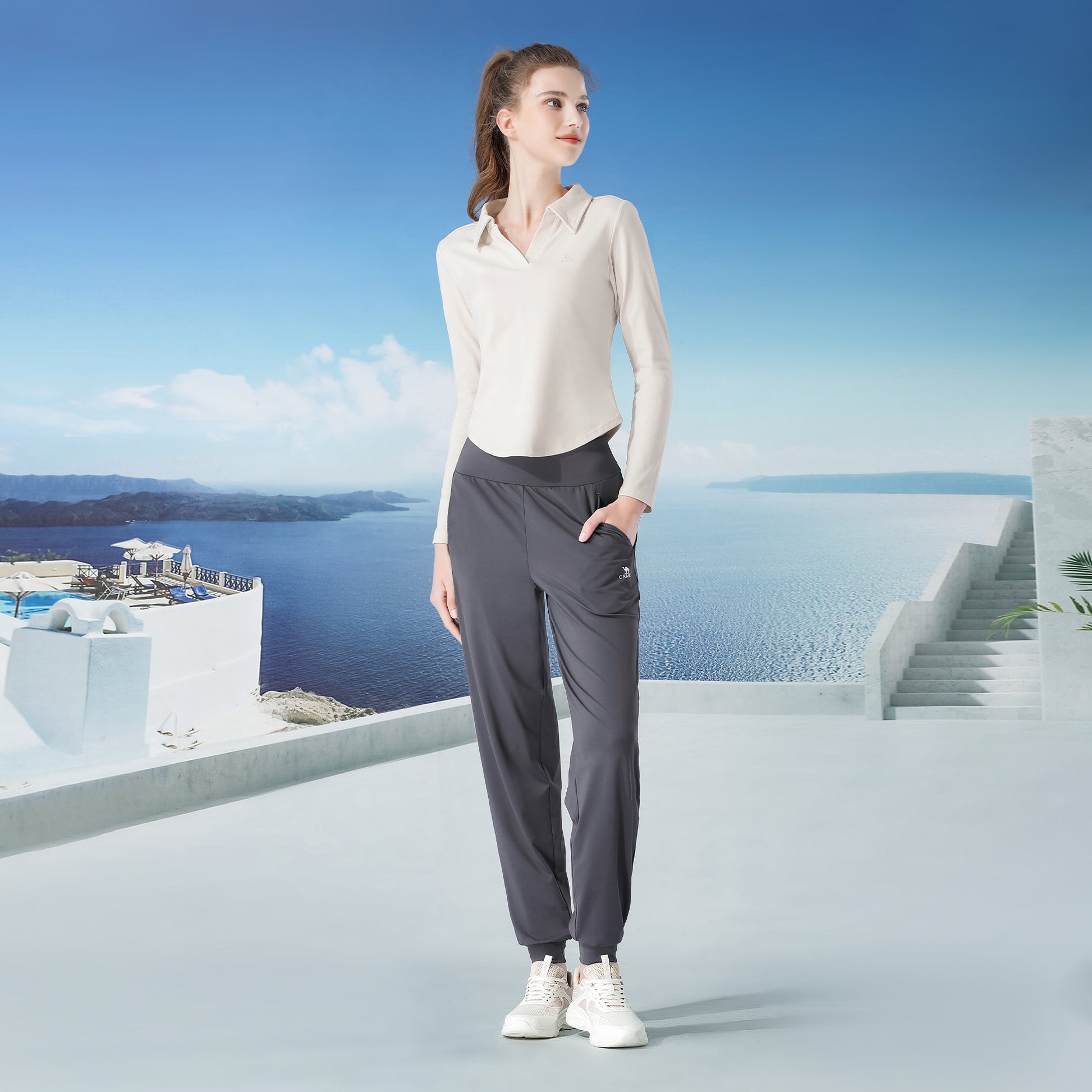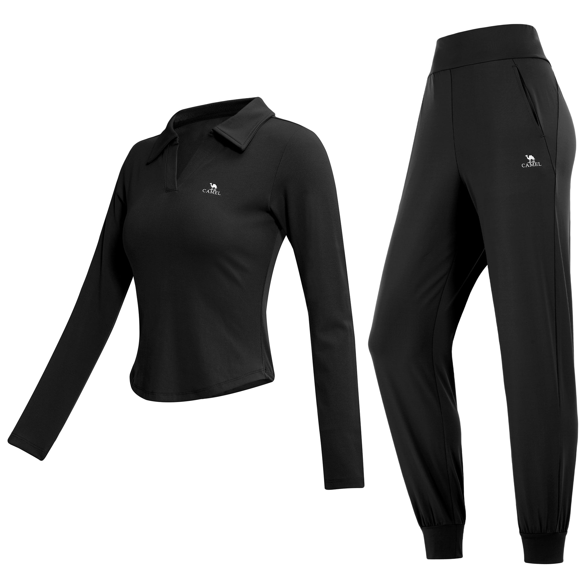 Женский спортивный костюм для йоги и тренировок, состоящий из облегающей поло с длинным рукавом и зауженных брюк с высокой талией. Функциональный сет выполнен из эластичной дышащей ткани.
