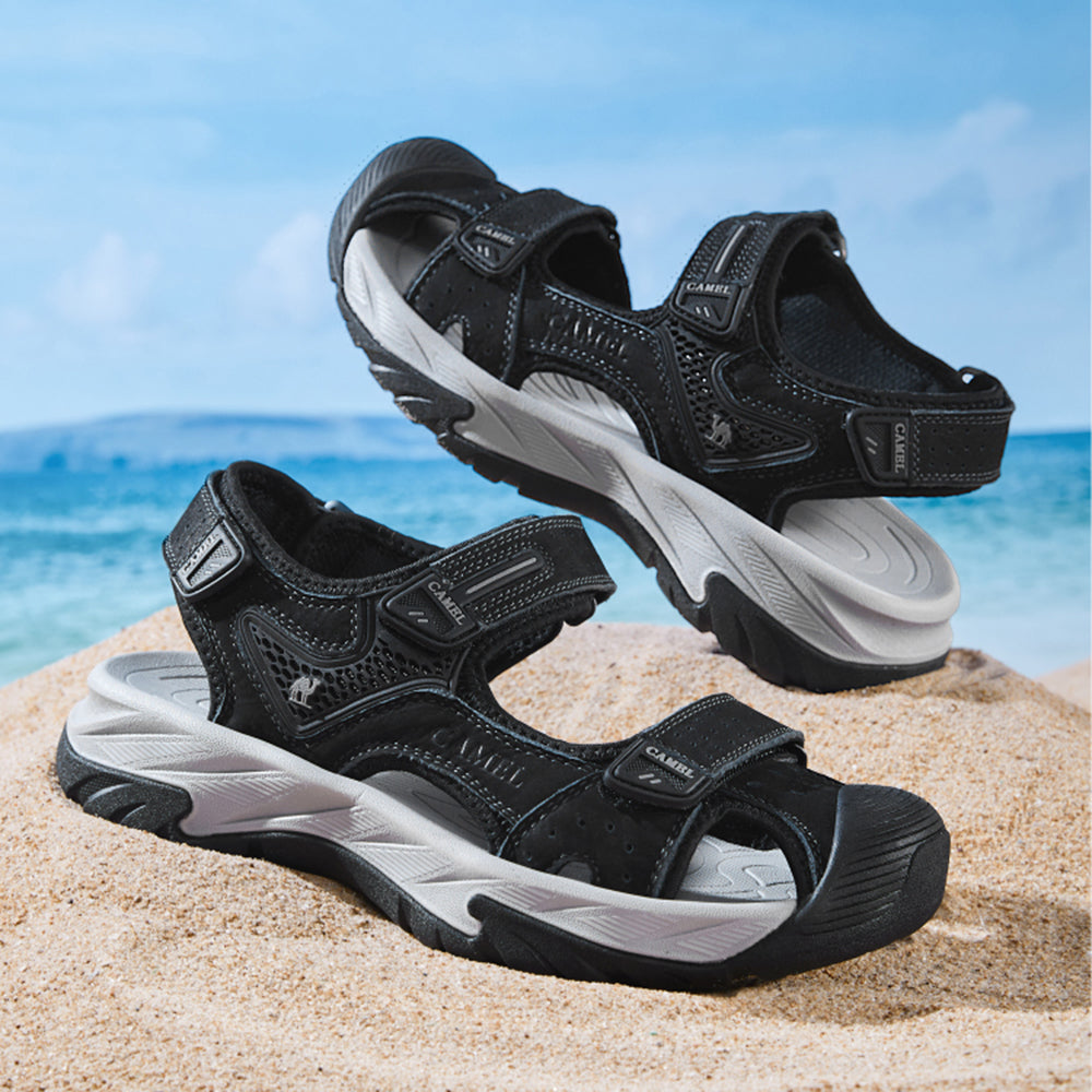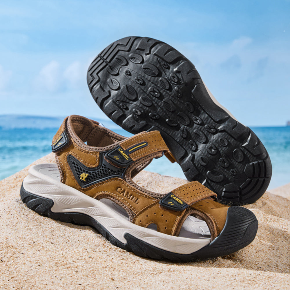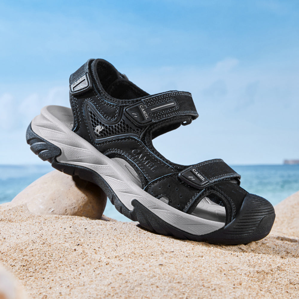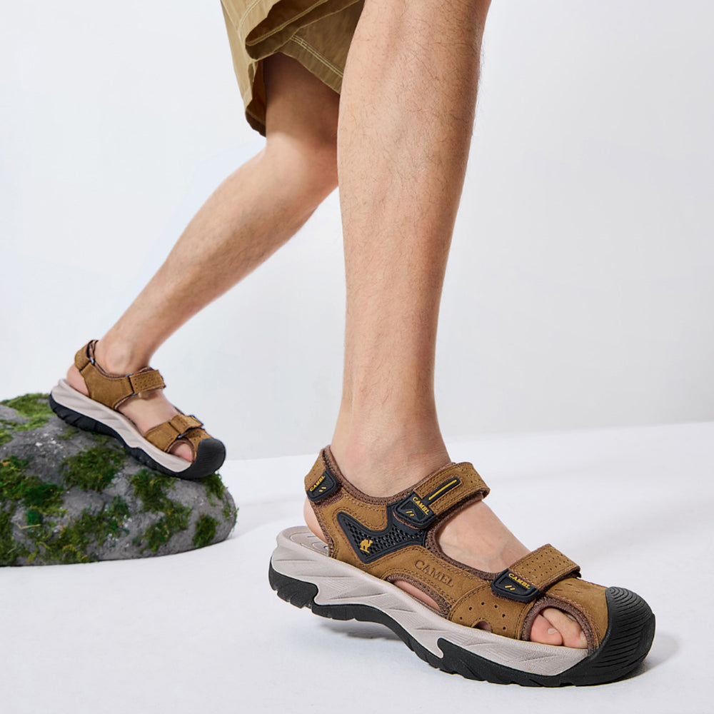 Комфортные и мягкие пляжные сандалии из натуральной кожи с усиленным закрытым носком для защиты. Модель на удобной подошве средней высоты с регулируемой застежкой на липучке подходит для летнего отдыха.