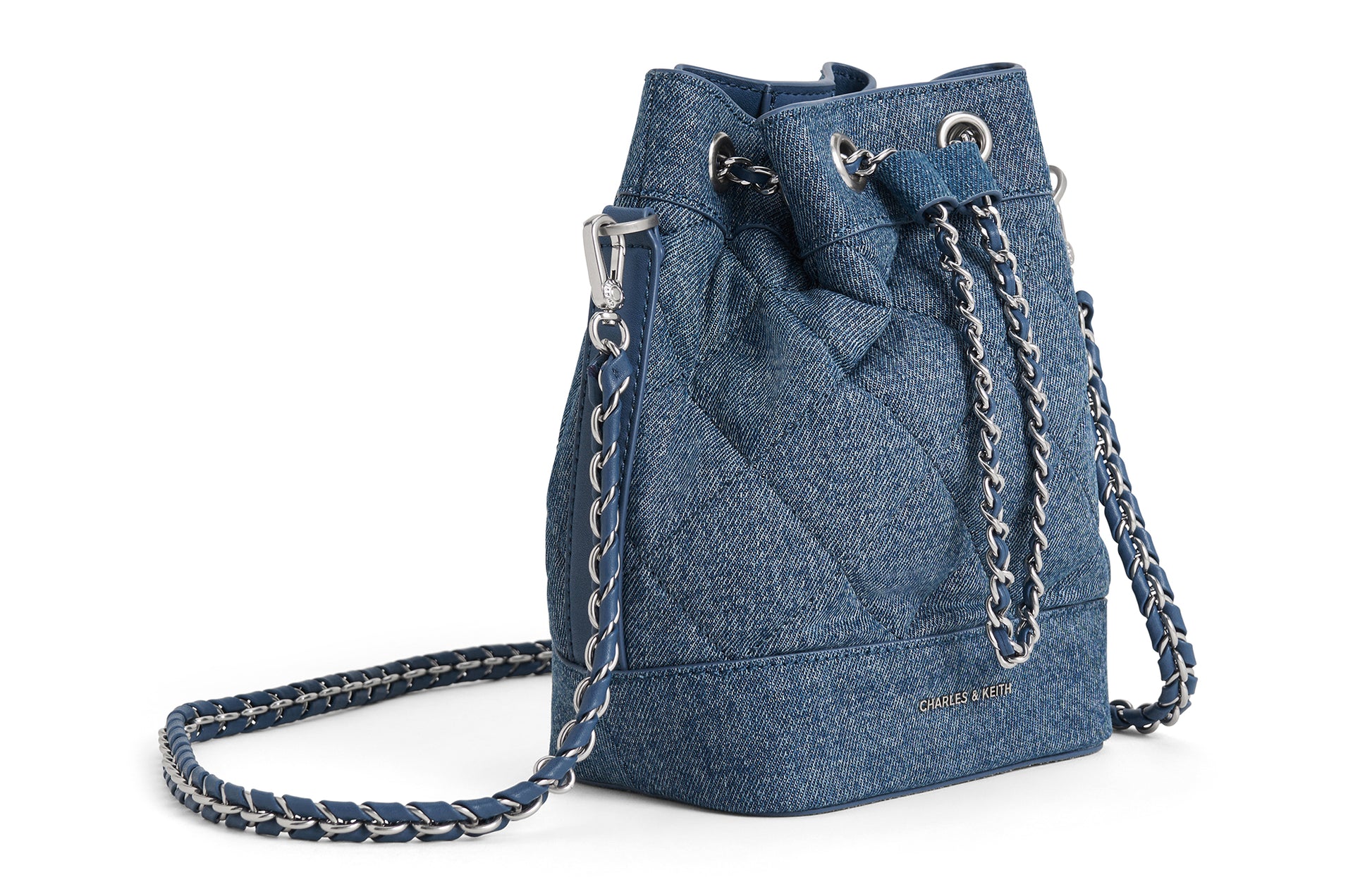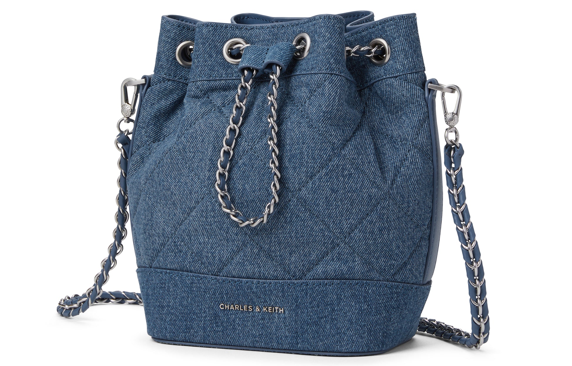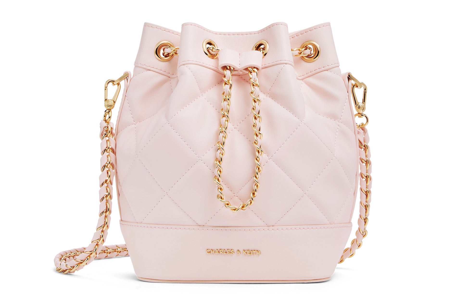 Маленькая ведерная сумка Charles & Keith, выполненная из PU с стеганым дизайном в алмазной решетке и цепочкой. Эта средняя сумка через плечо доступна в различных цветах, включая черный, бежевый, светло-розовый и глубокий деним. Стильный и универсальный аксессуар, идеально подходящий для повседневного использования.