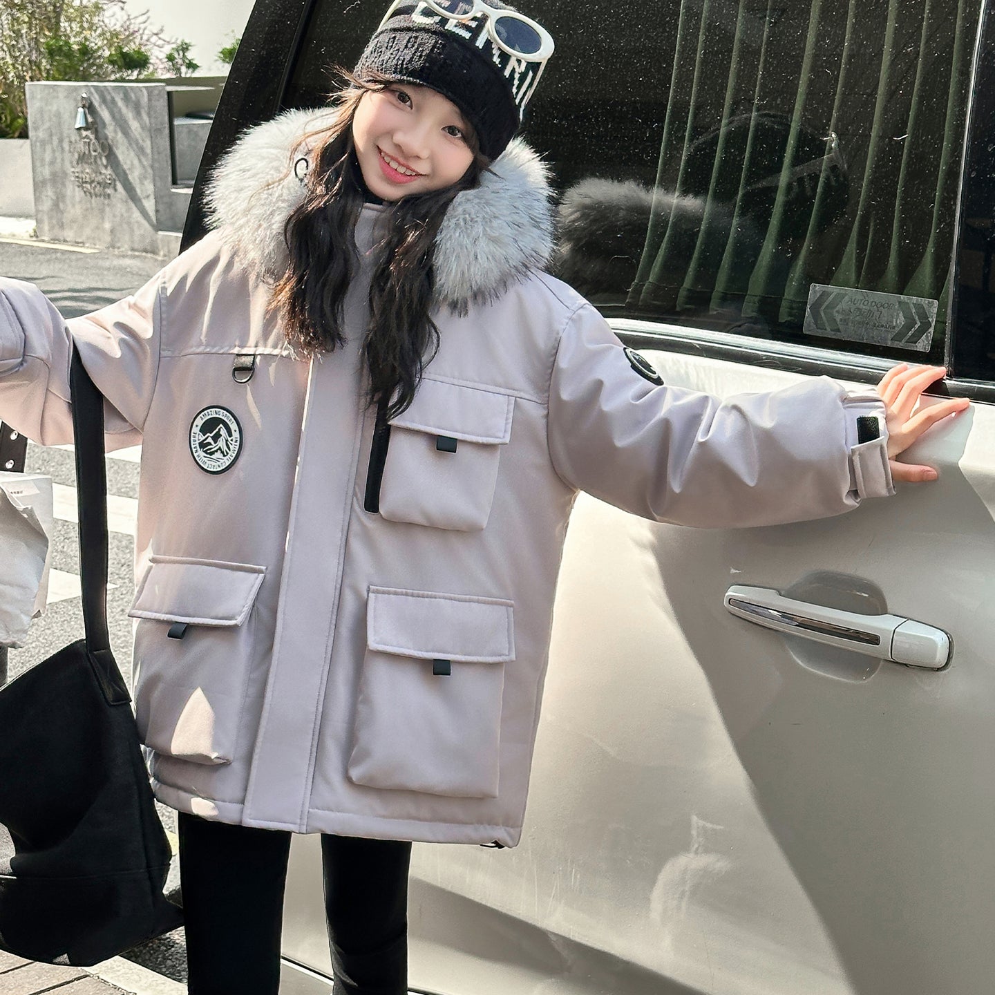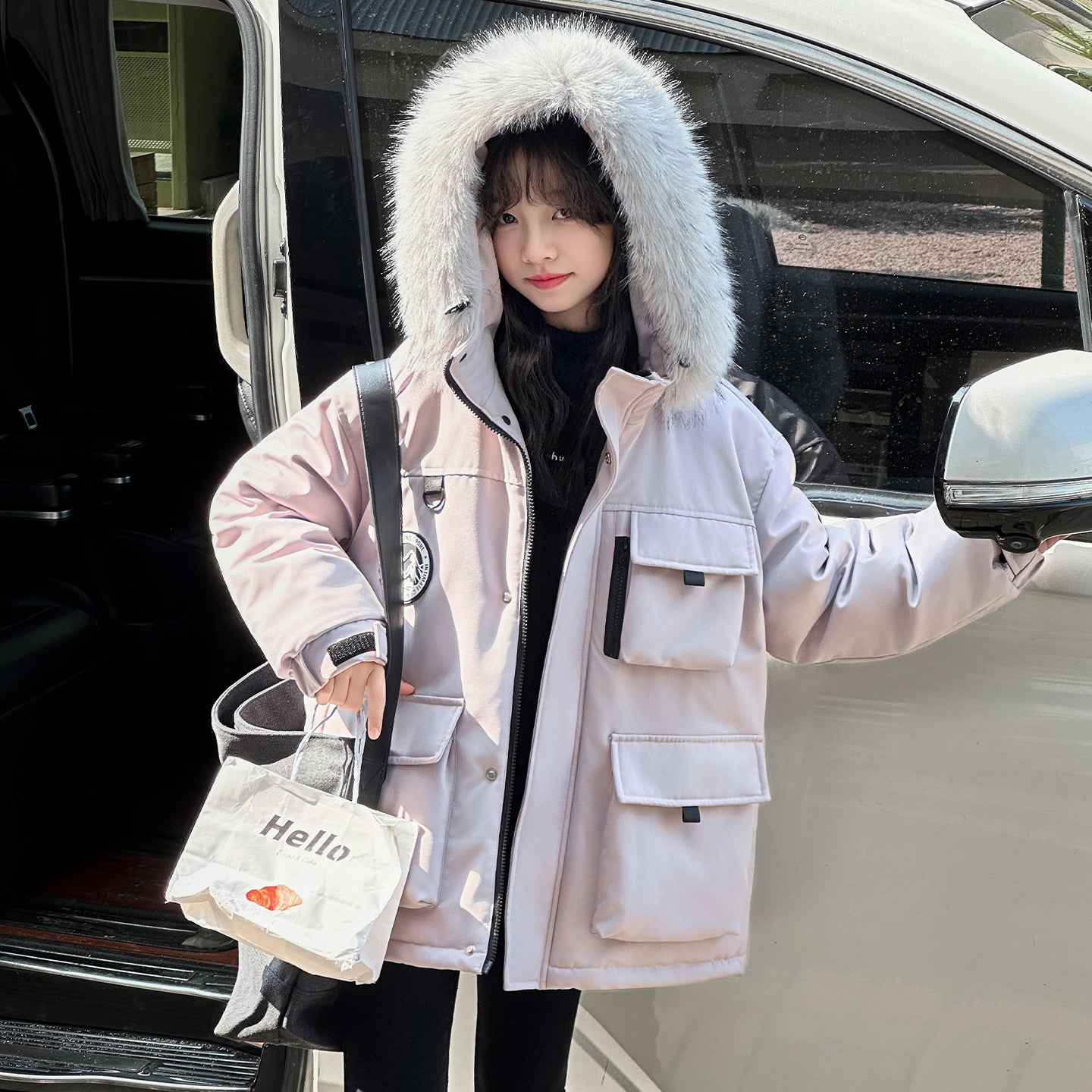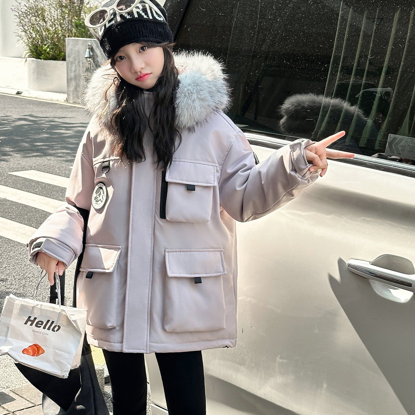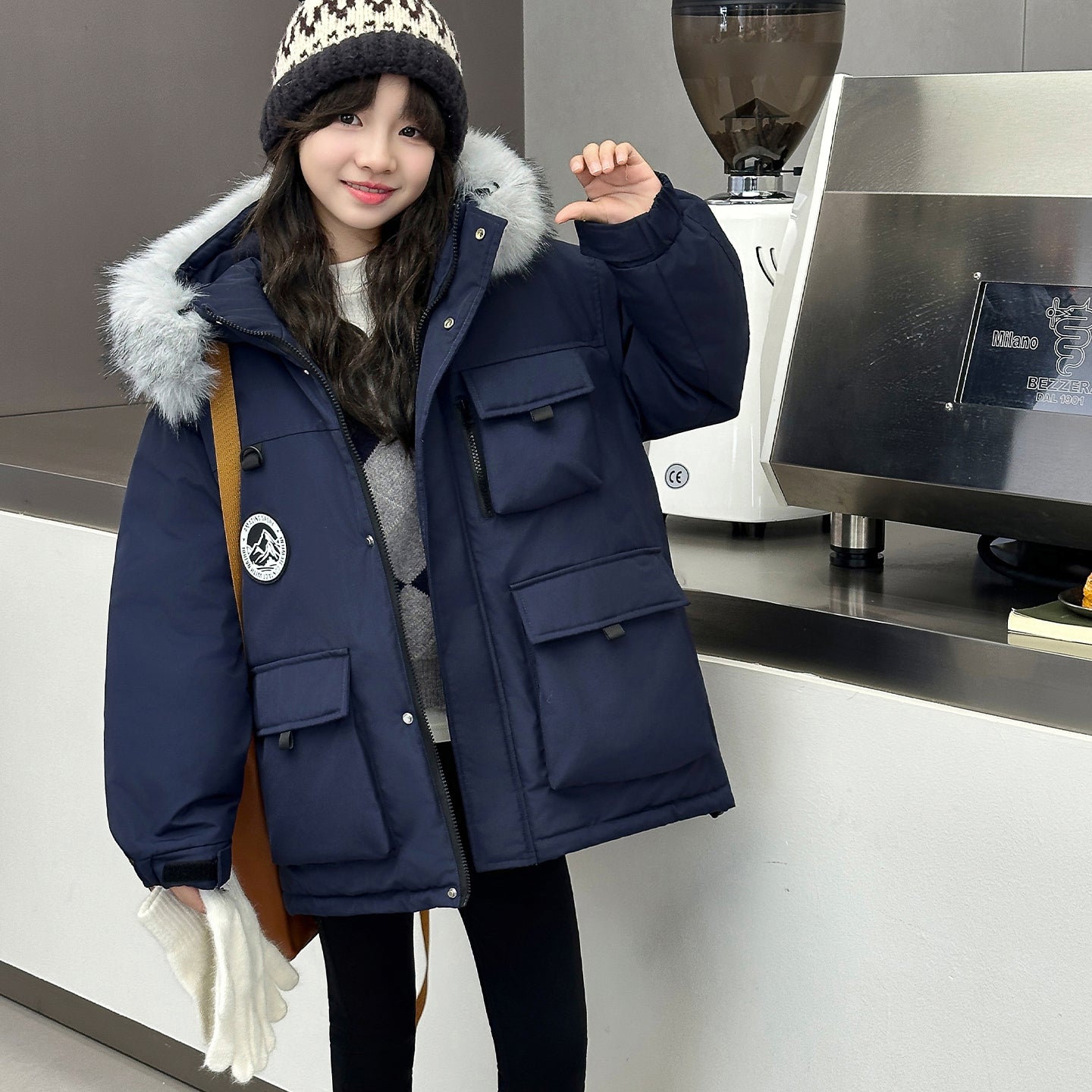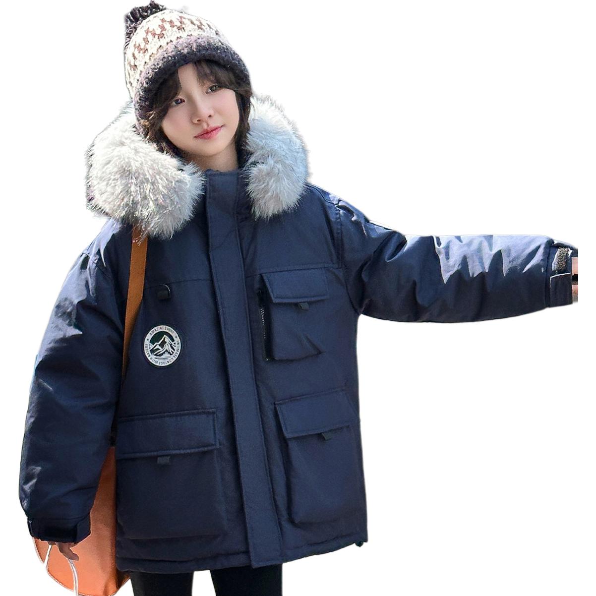 Детский пуховик в стиле рабочей одежды с капюшоном и большими карманами, наполненный белым утиным пухом. Модель свободного кроя обеспечивает тепло, комфорт и защиту от влаги благодаря водоотталкивающей отделке.