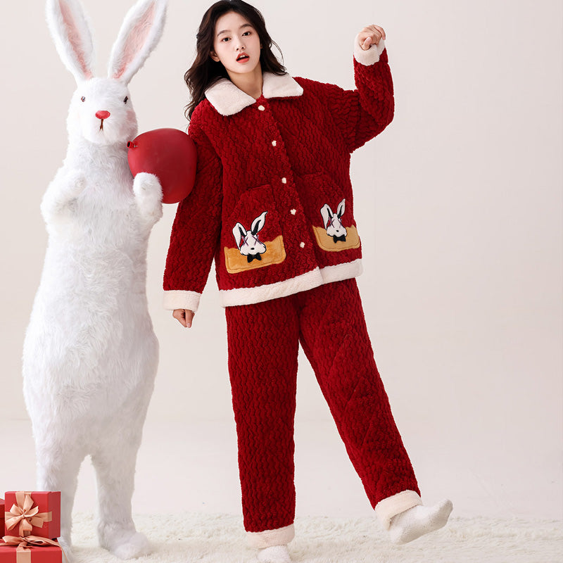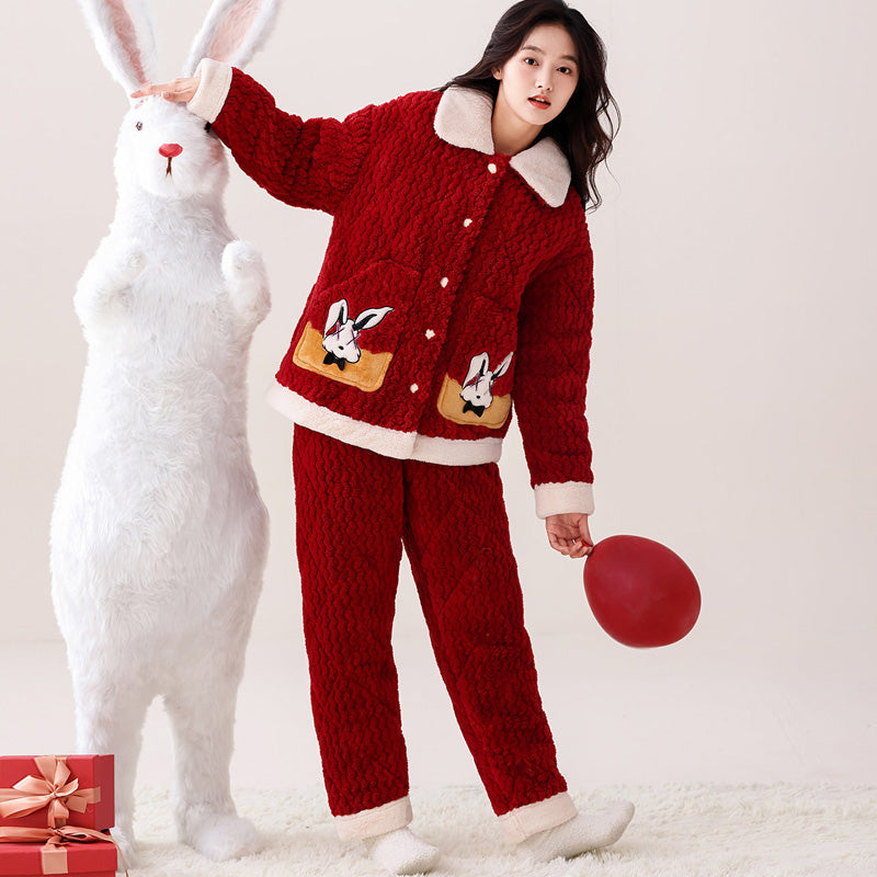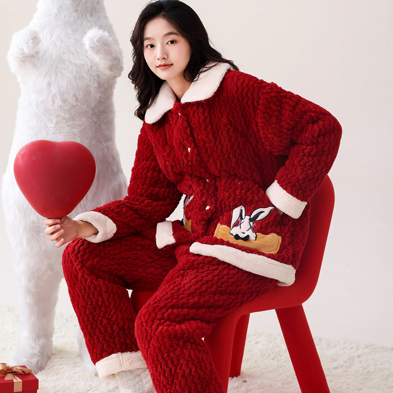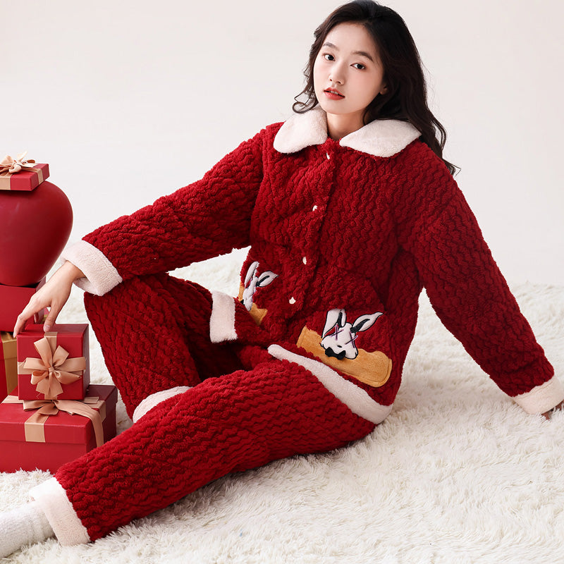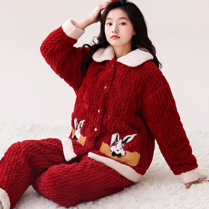 Уютный зимний комплект из трехслойного хлопка с коралловым флисом, включающий брюки и кофту с лацканами. Этот женский набор подходит для дома и может использоваться как комфортная повседневная одежда.