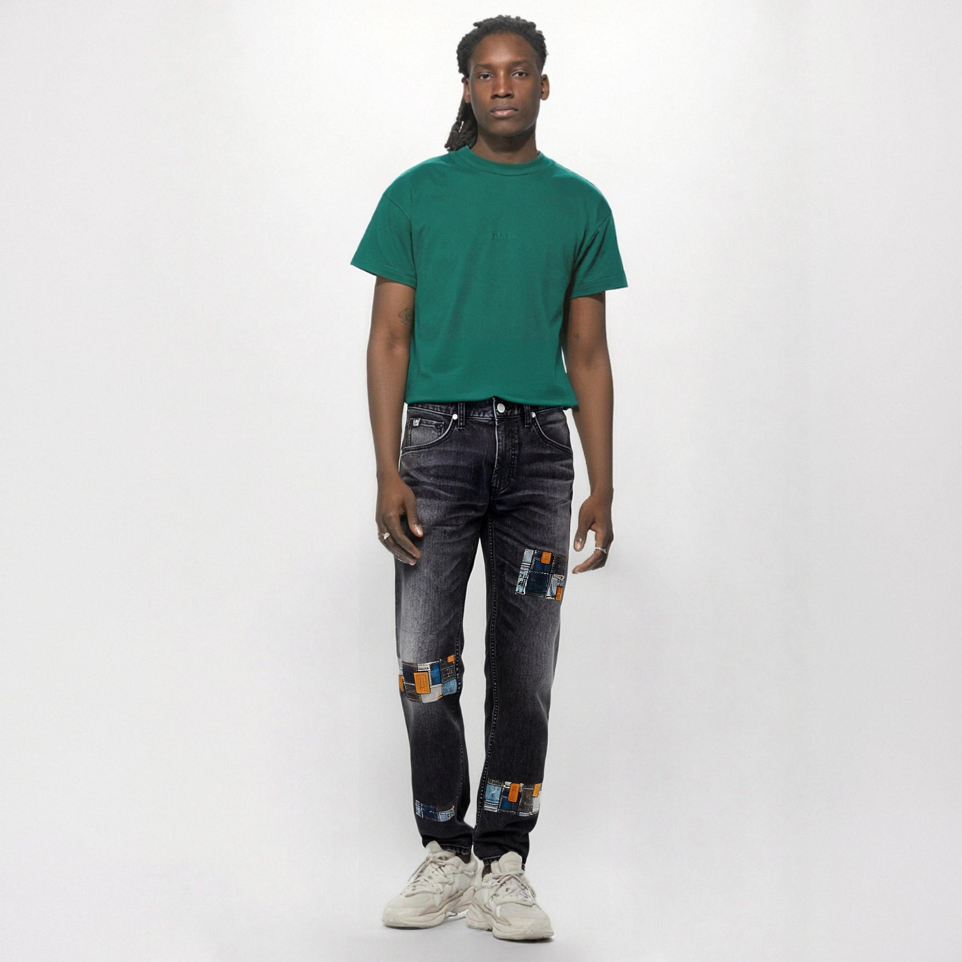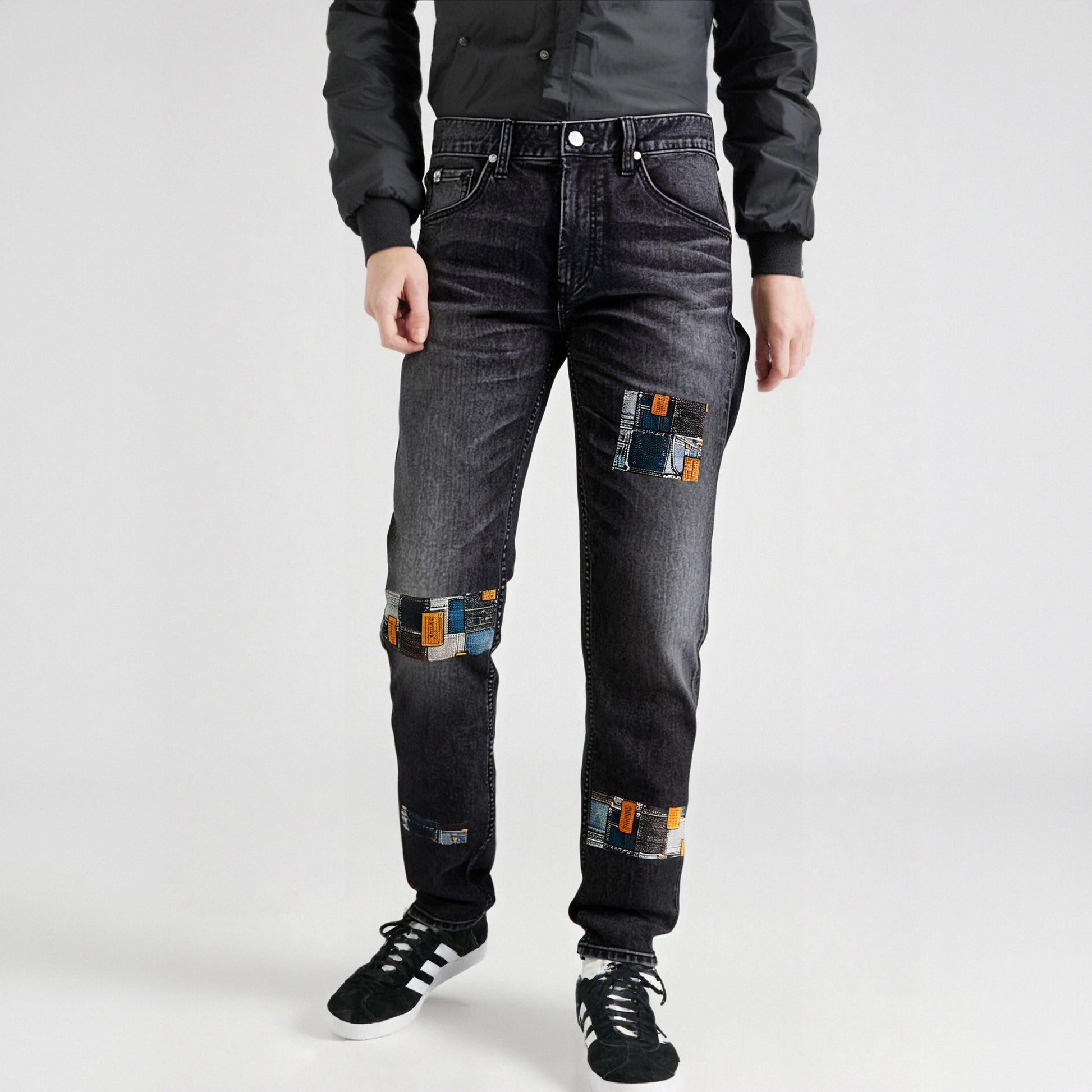 Джинсы с эффектом потертостей, заплатками из денима и элементами пэчворка для дерзкого уличного образа. Облегающая модель из ткани с охлаждающим эффектом подчеркивает индивидуальный кастом-дизайн.