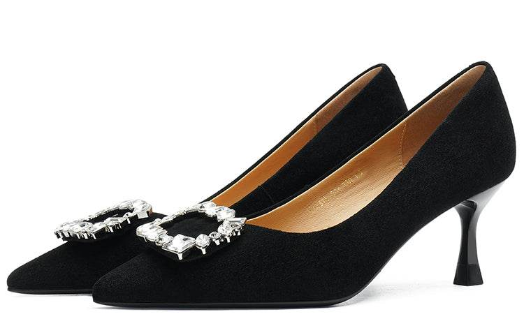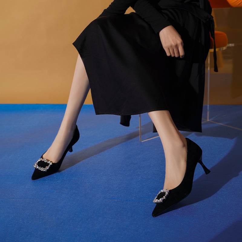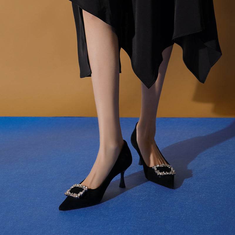 Стильные черные туфли с тонким каблуком высотой 6,5 см, выполненные в нежном и элегантном дизайне. Эти обувь идеально подходят для вечерних выходов и особых случаев, добавляя изысканный акцент в любой образ. Отличный выбор для женщин, ценящих качество и современные тенденции в обуви.