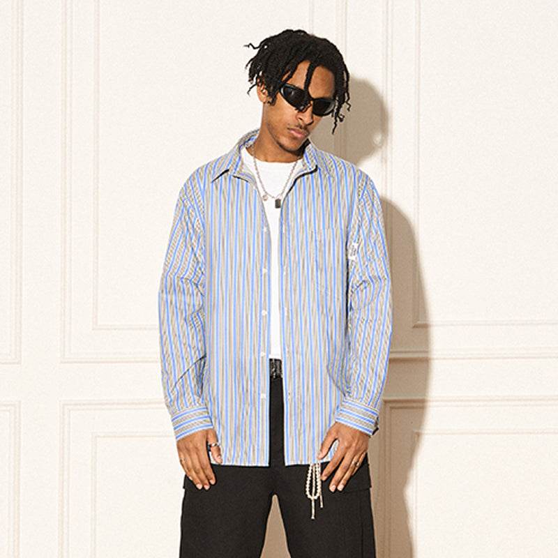 Американская винтажная рубашка с длинными рукавами и пуговицами выполнена в желто-голубых полосках. Эта структурированная модель подойдет как для мужчин, так и для женщин, добавляя стильный акцент в повседневный гардероб.
