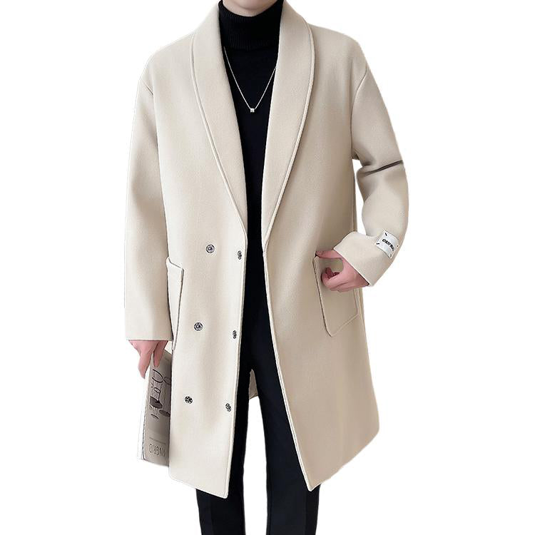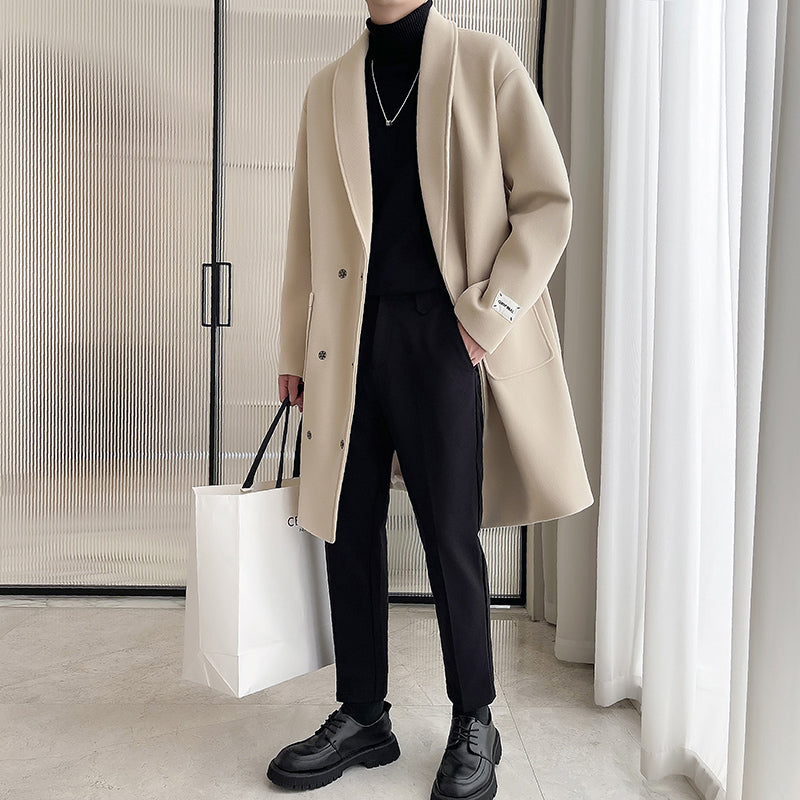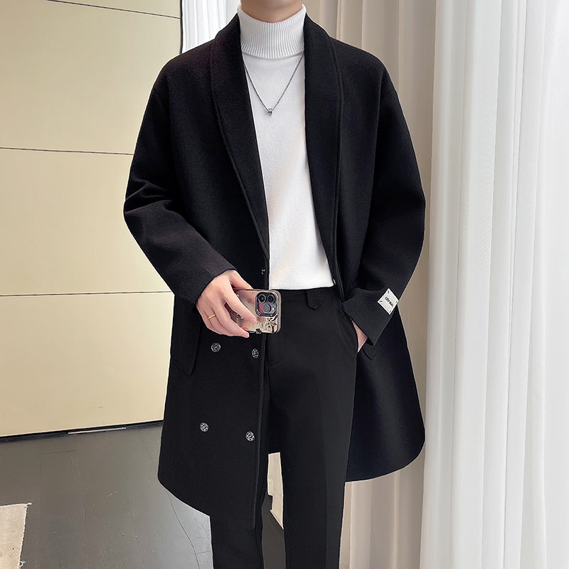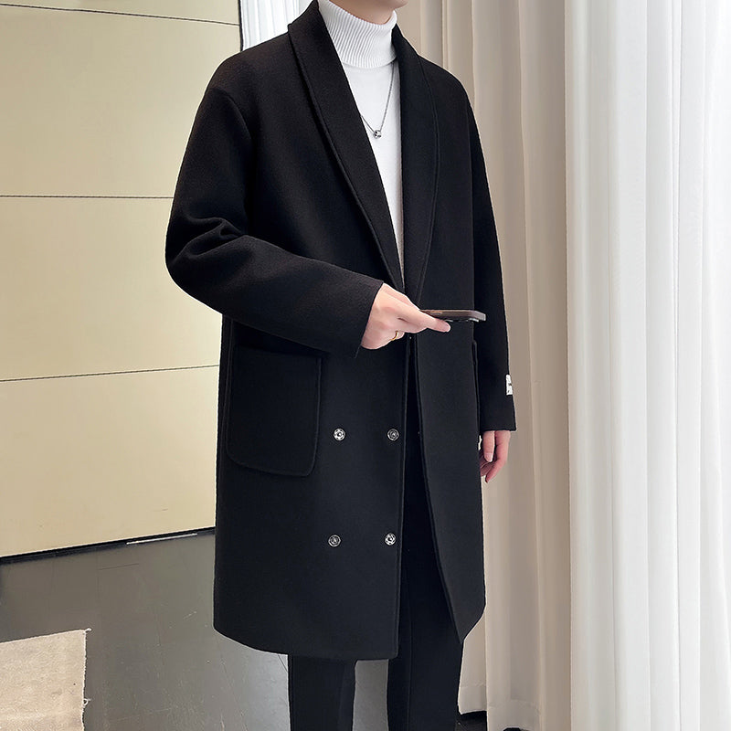 Мужское пальто FRQ в корейском стиле с двубортной застежкой и утепленной подкладкой, создающее эффект легкой роскоши. Модель выполнена из высококачественного шерстяного материала и подходит для городской жизни и холодного сезона.