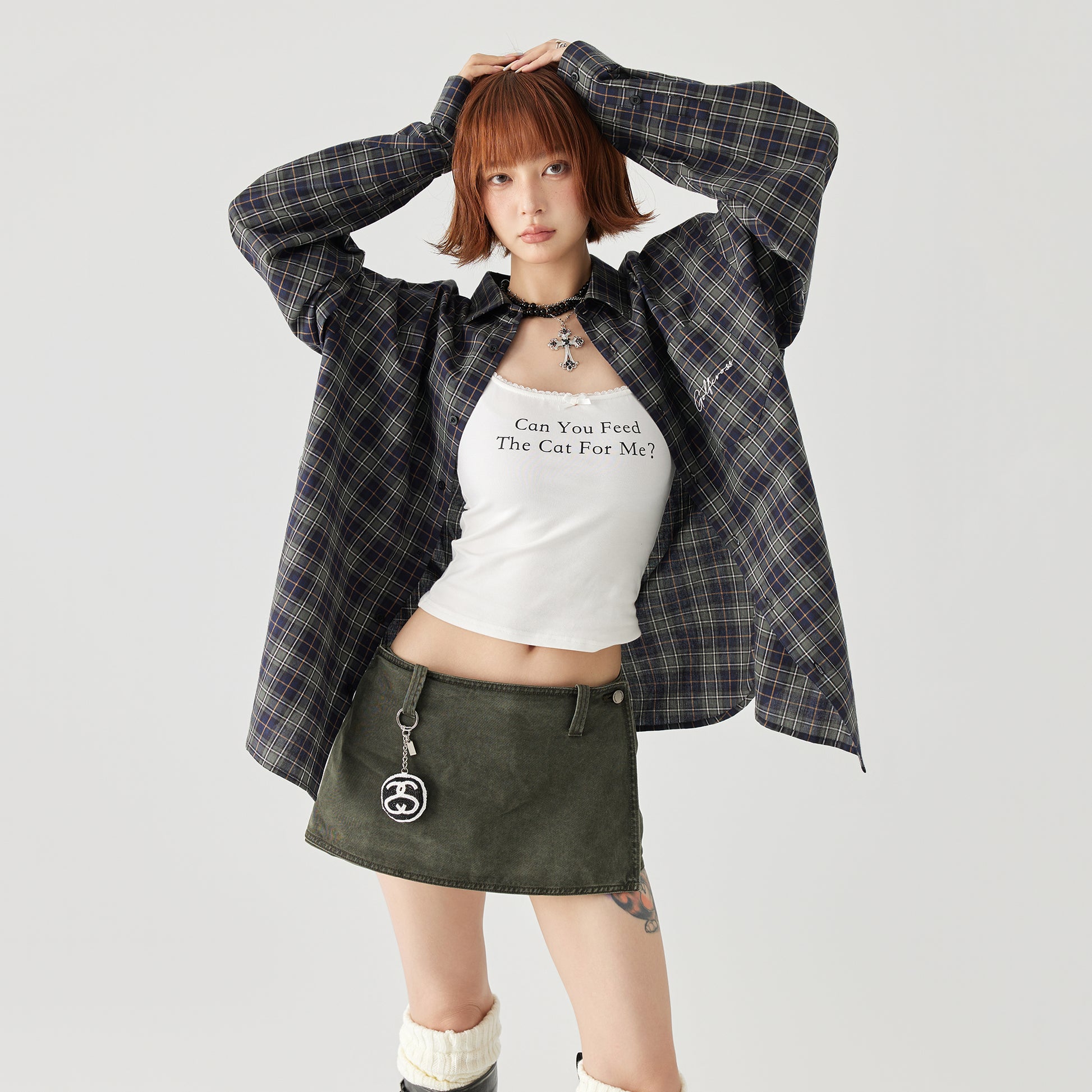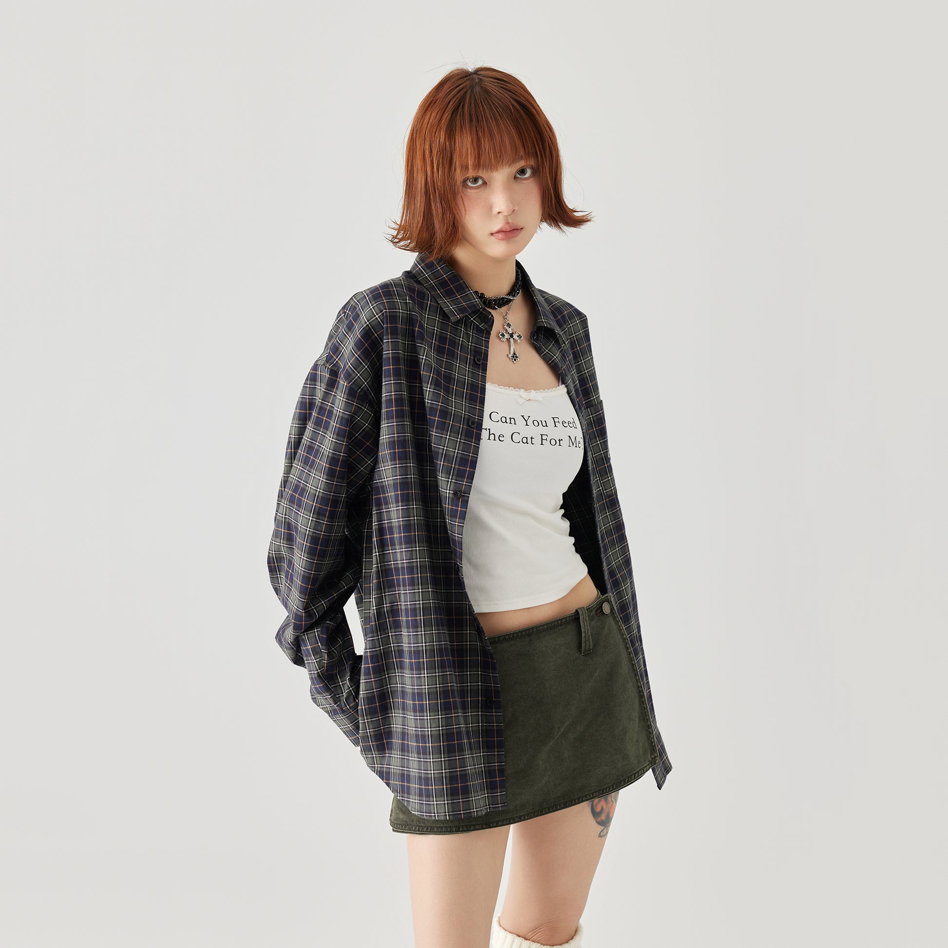 Свободная рубашка в американском ретро-стиле с клетчатым узором, вышитой надписью, отложным воротником и спущенным плечом. Универсальная модель из хлопка на пуговицах подходит для носки в любое время года.