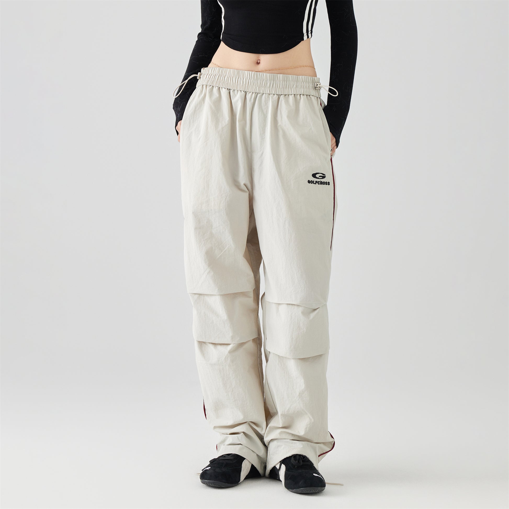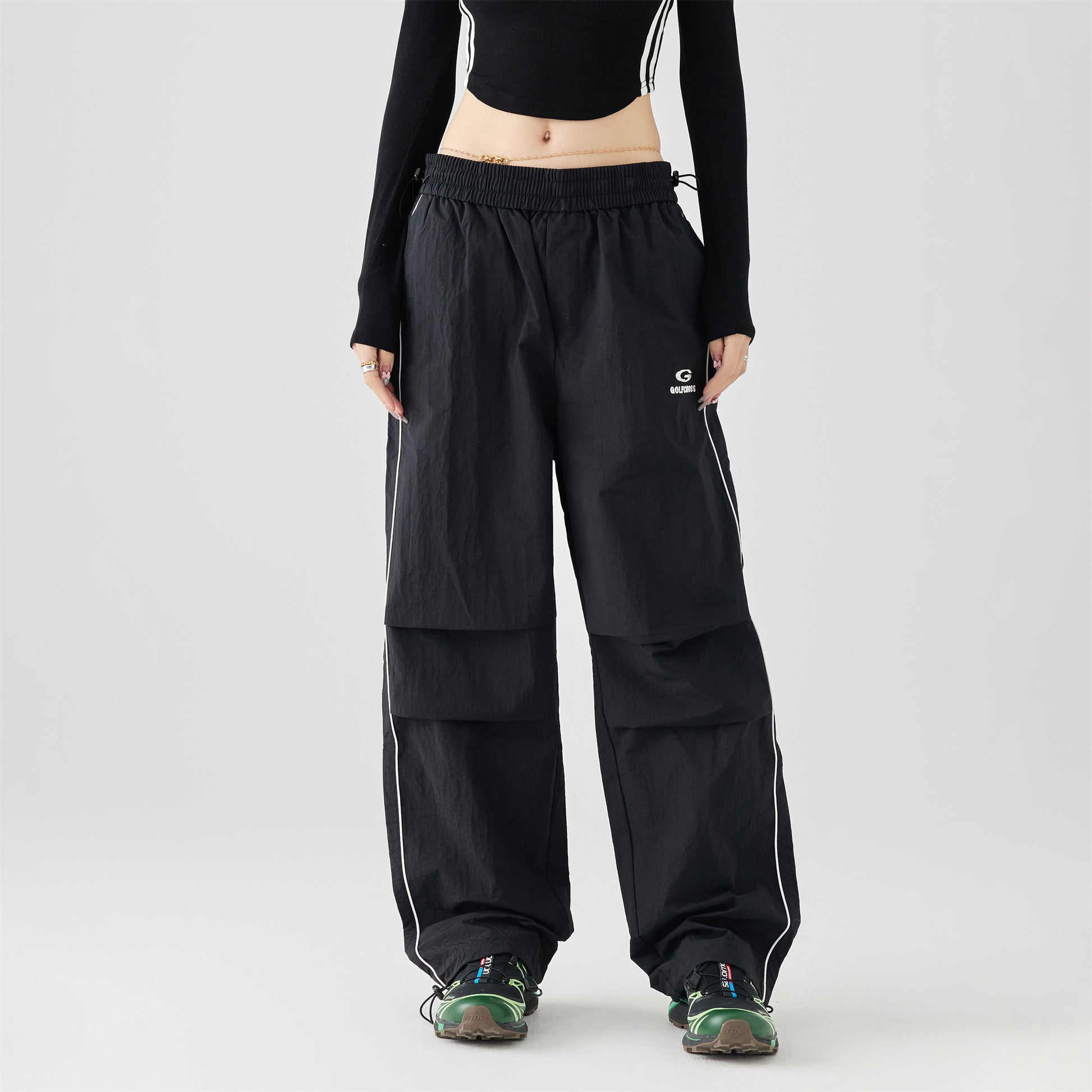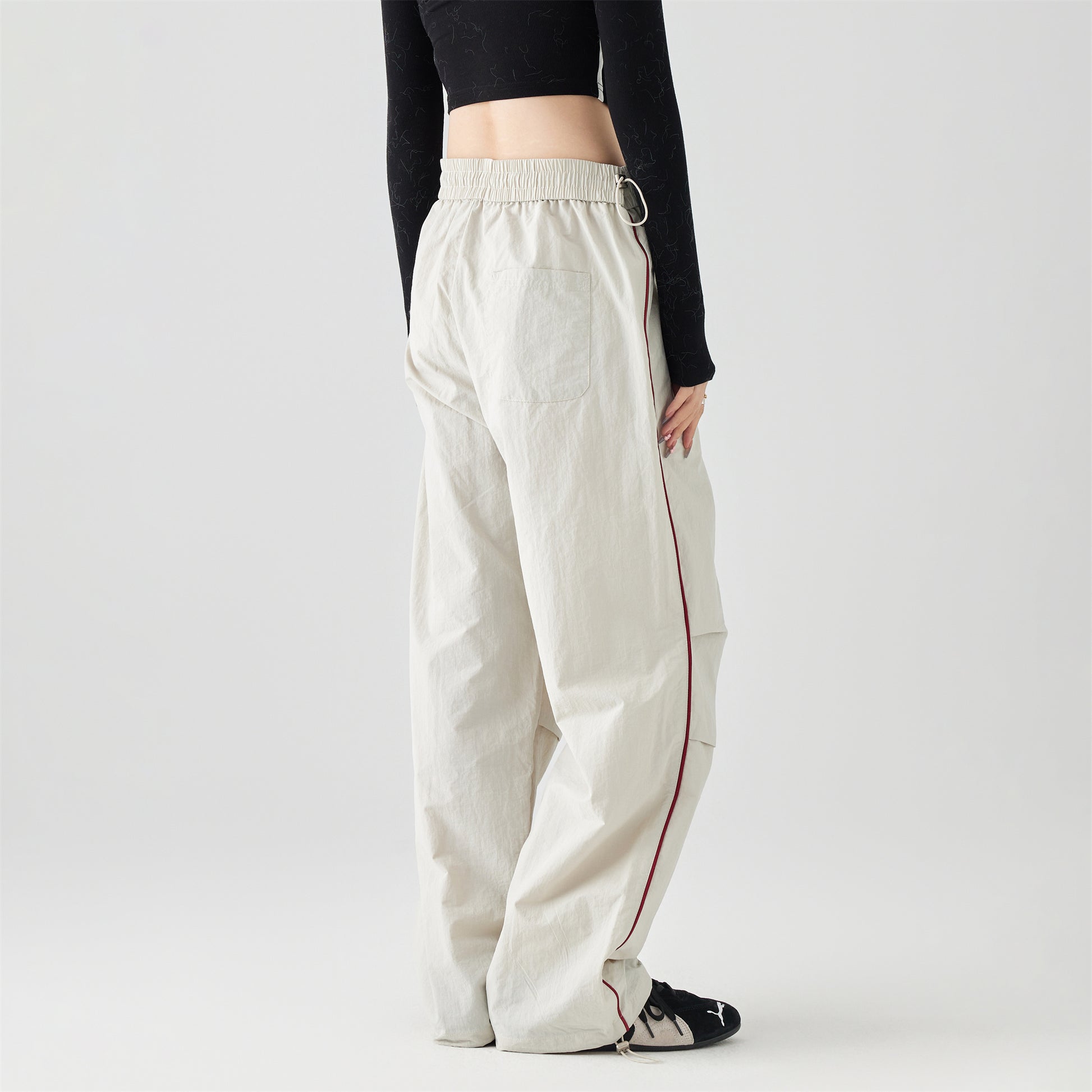 Свободные брюки в американском уличном стиле из текстурной полиамидной ткани со складками и контрастными полосами по бокам. Модель средней посадки на резинке с прямым кроем создаёт расслабленный и модный образ.