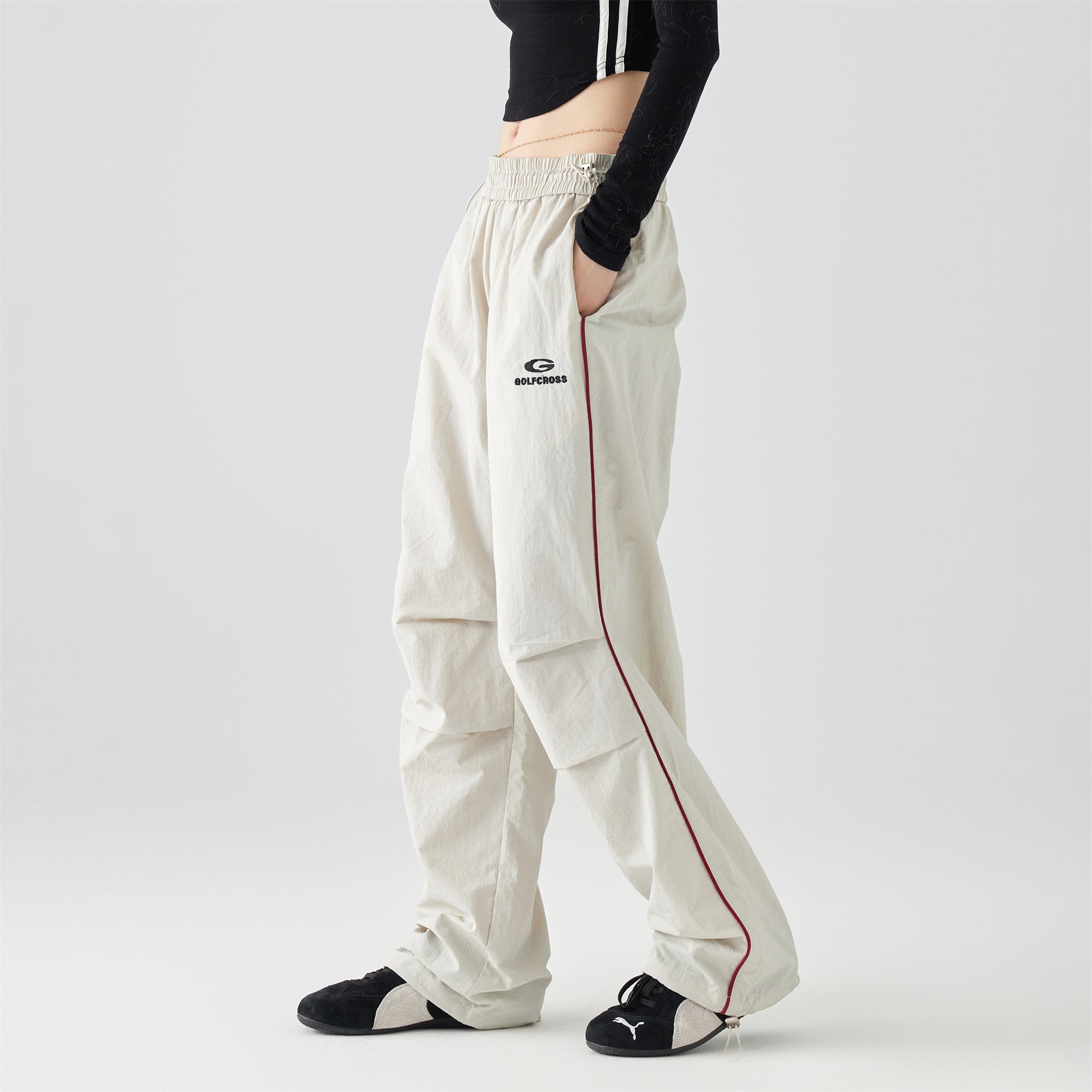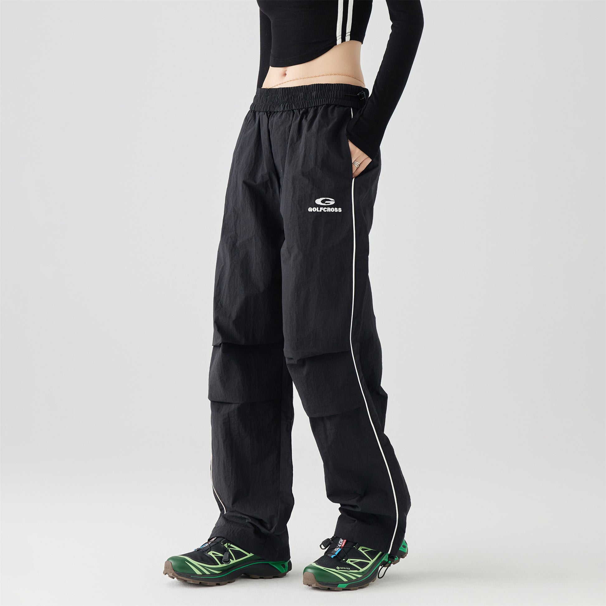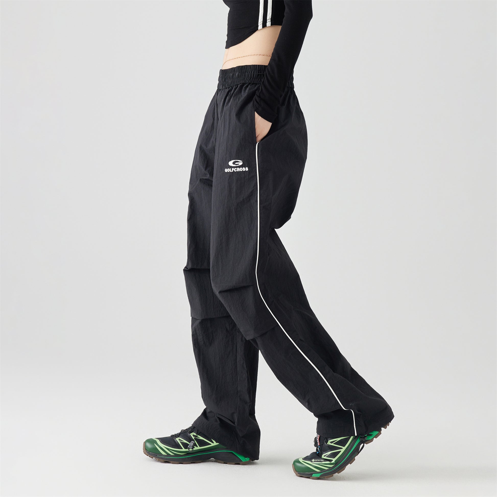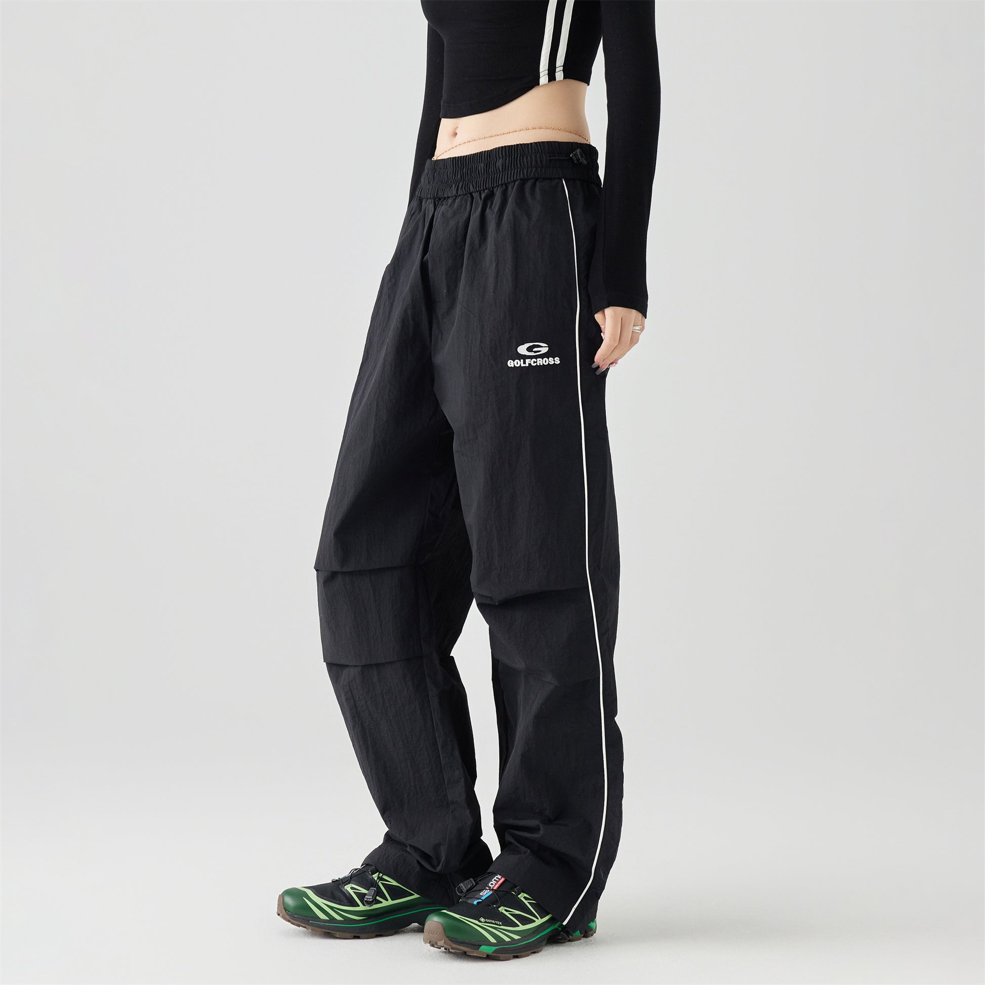 Свободные брюки в американском уличном стиле из текстурной полиамидной ткани со складками и контрастными полосами по бокам. Модель средней посадки на резинке с прямым кроем создаёт расслабленный и модный образ.