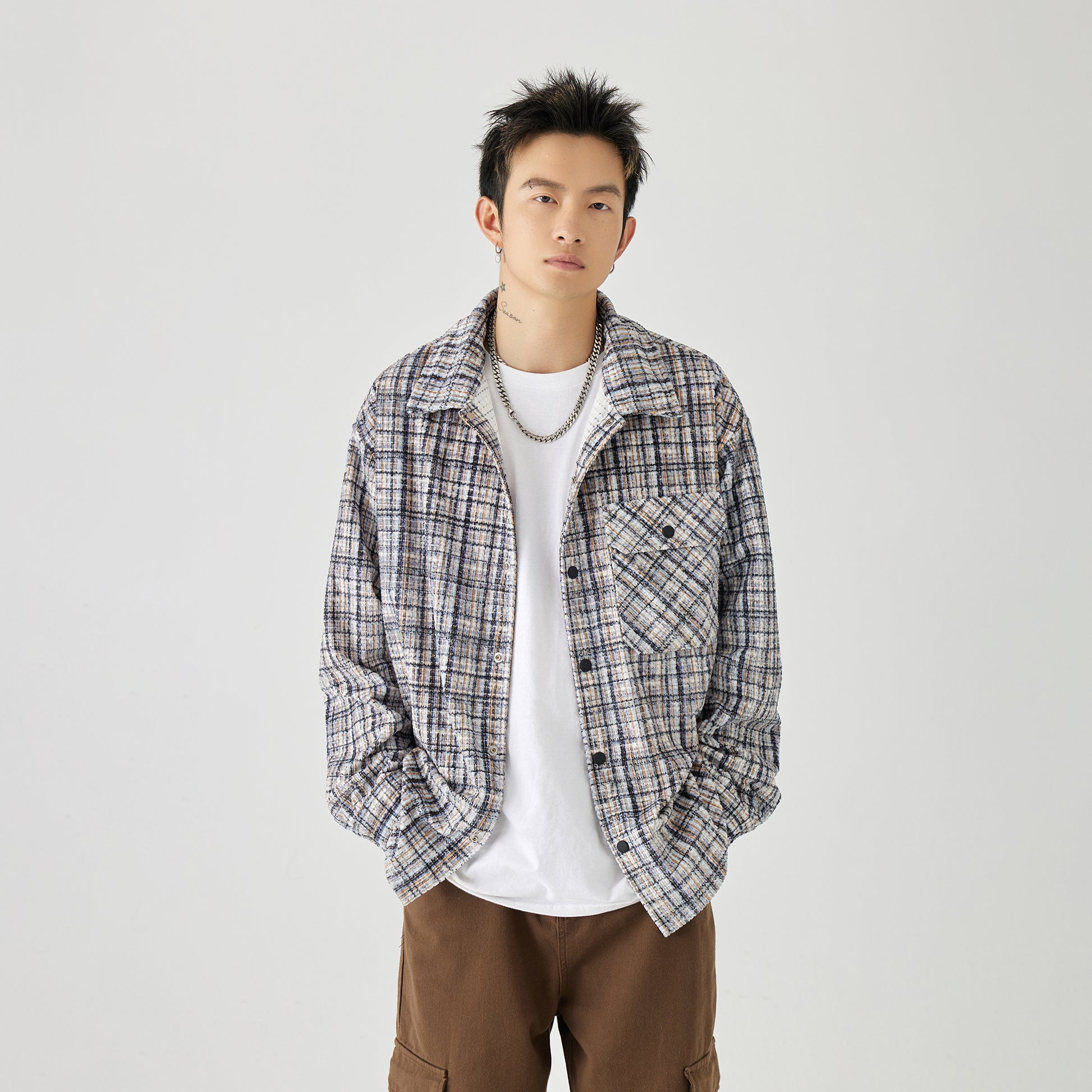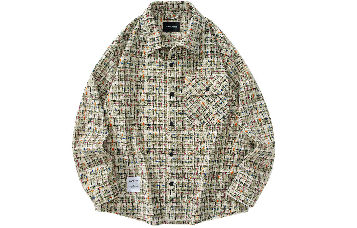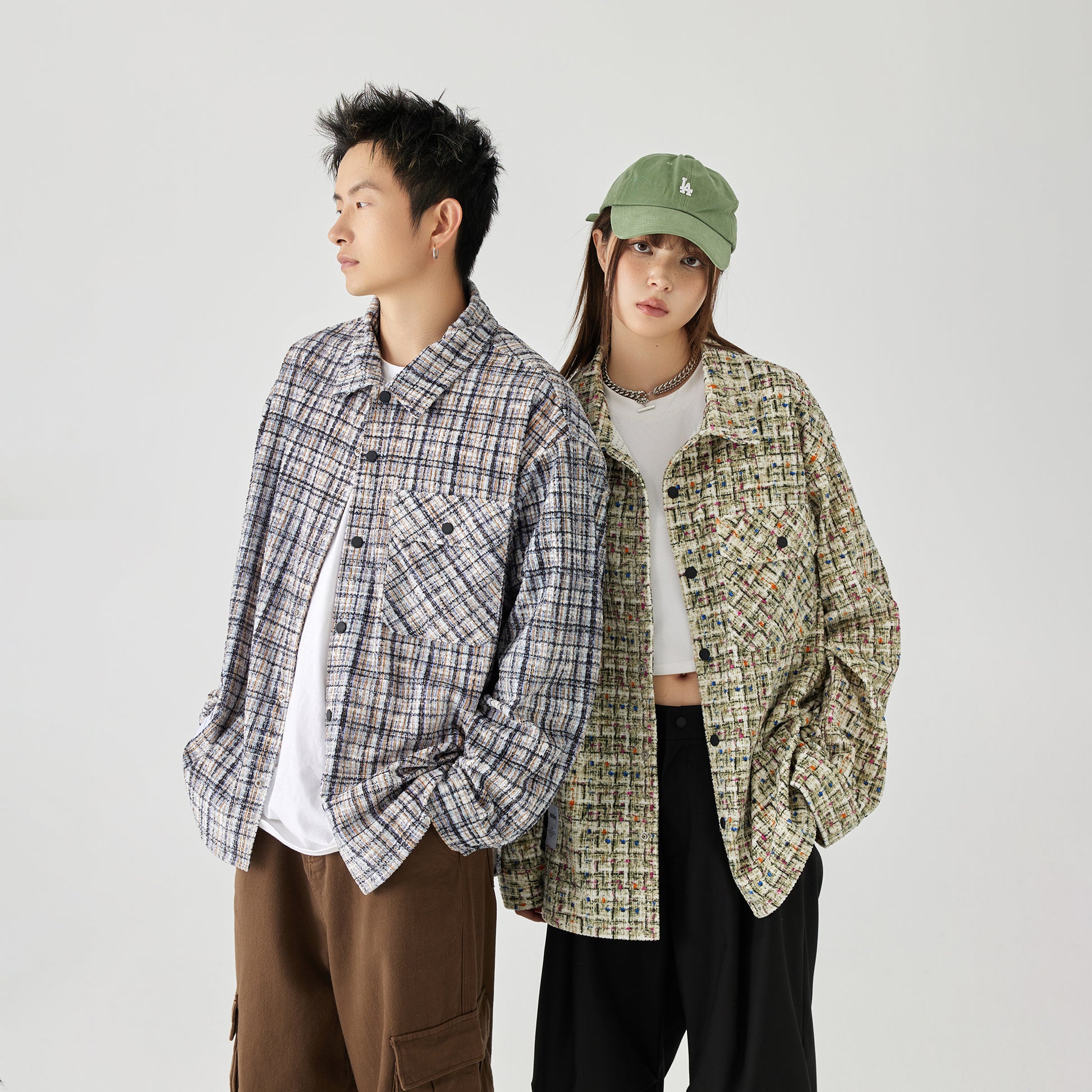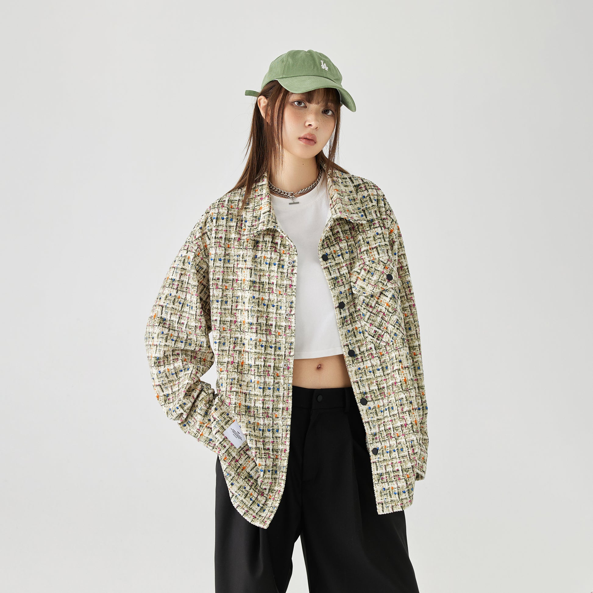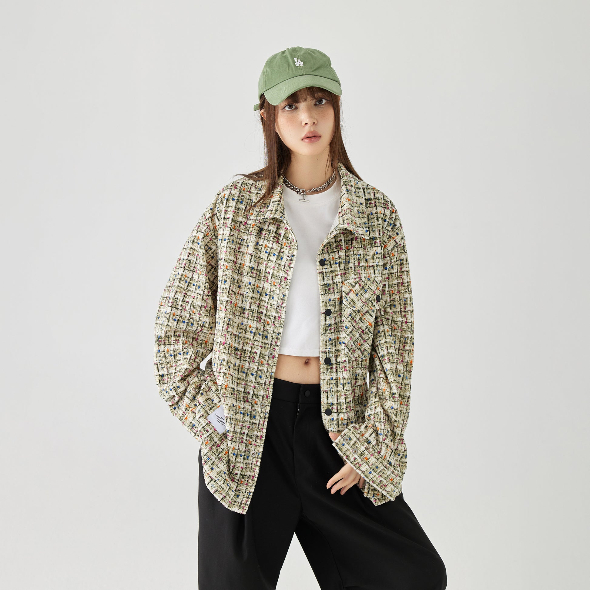 Рубашка свободного кроя в стиле «шанэль» из тканого твида с принтом в клетку и цветочным узором. Модель с отложным воротником и рядом пуговиц сочетает в себе элегантный и расслабленный стиль.